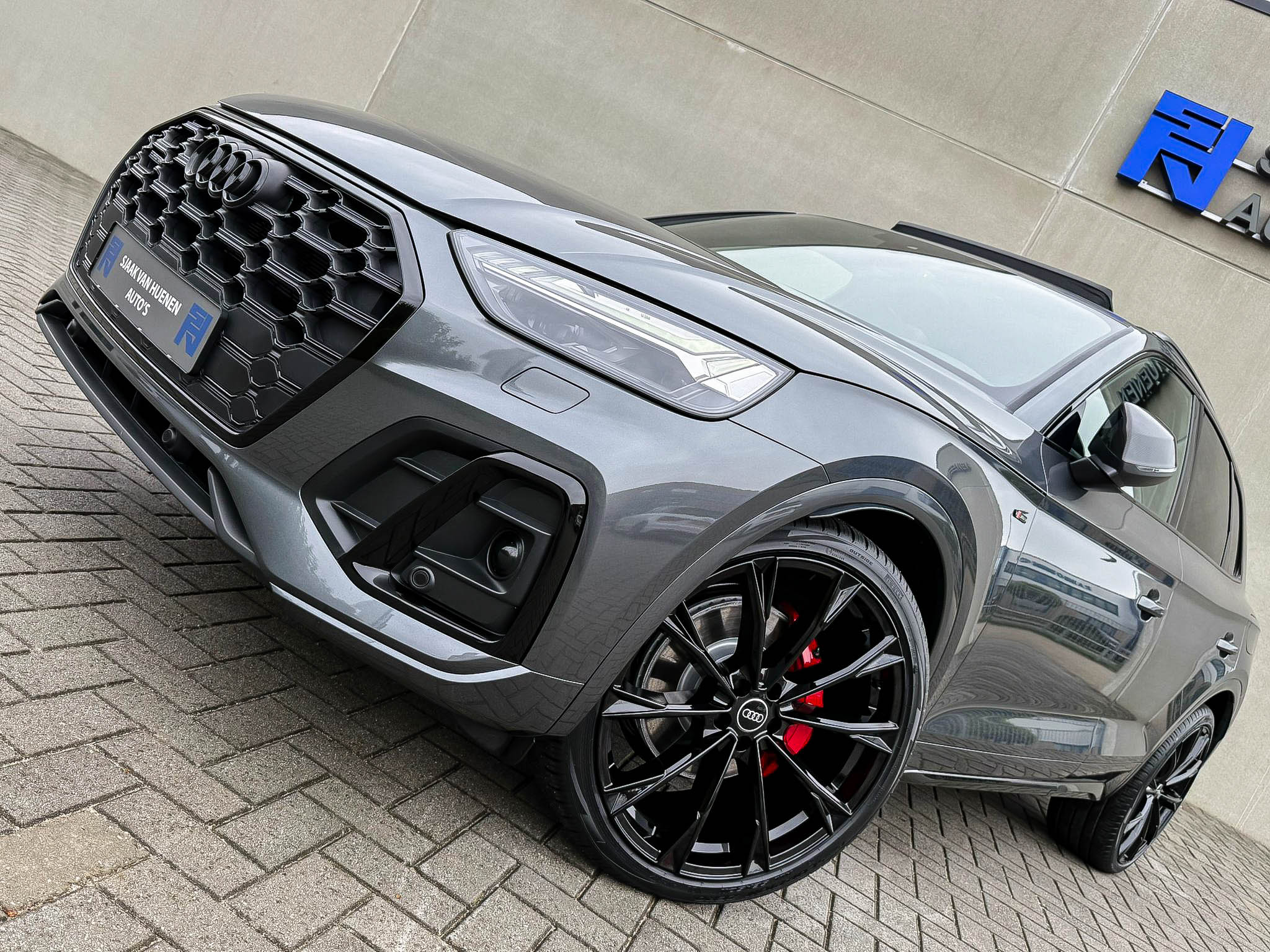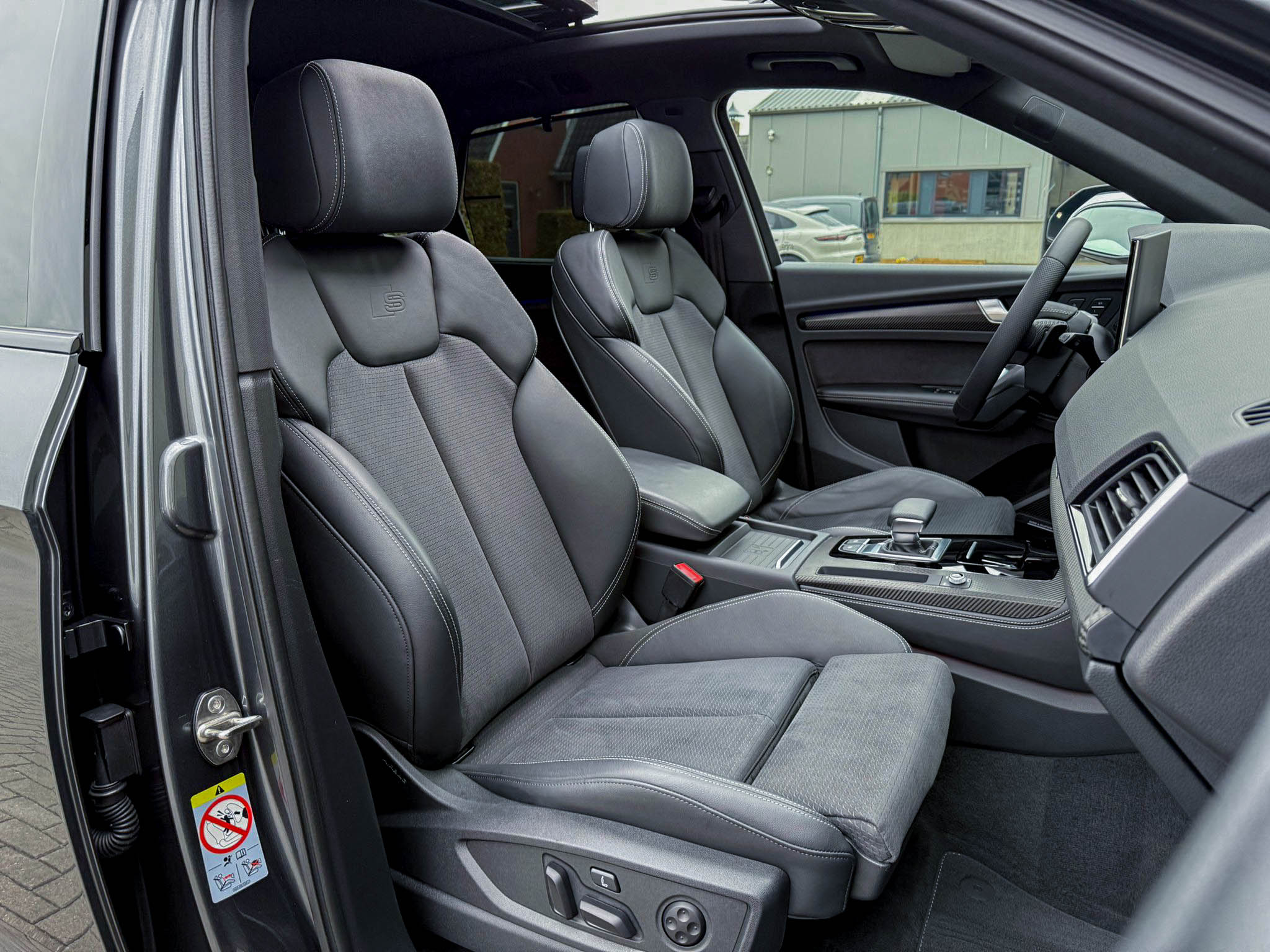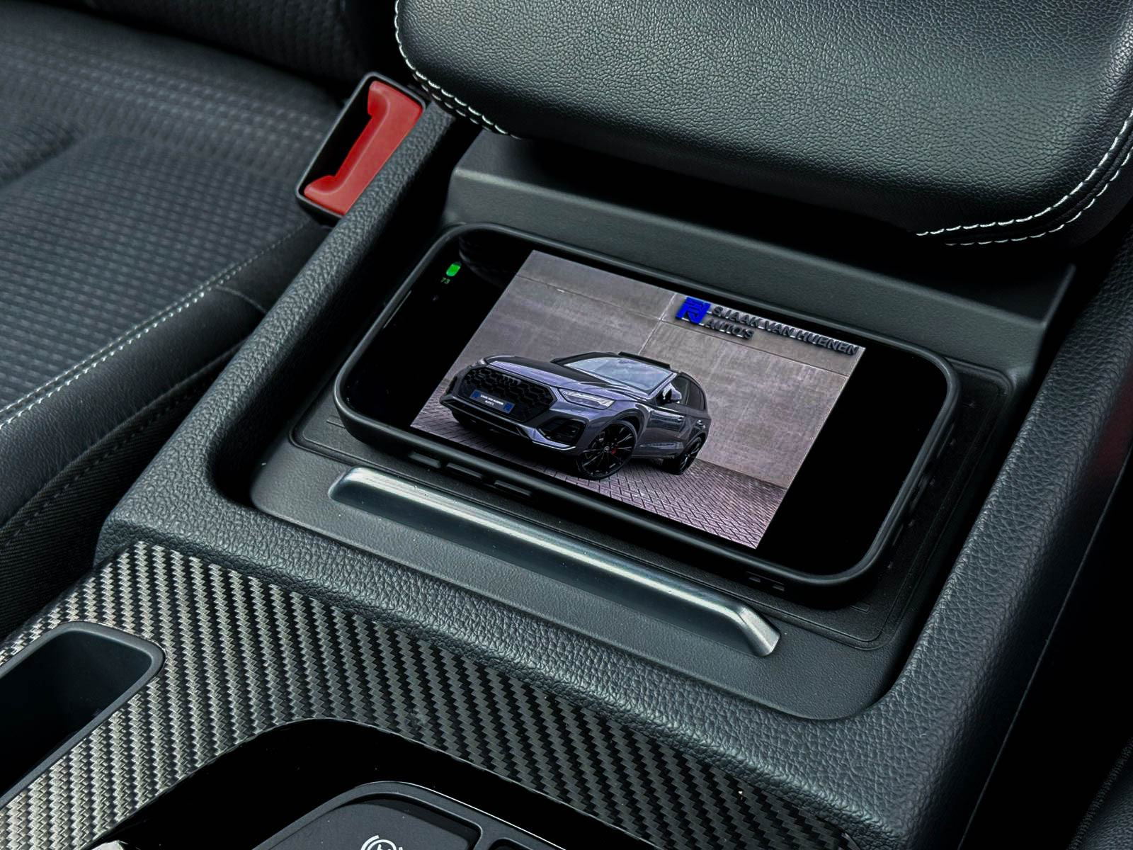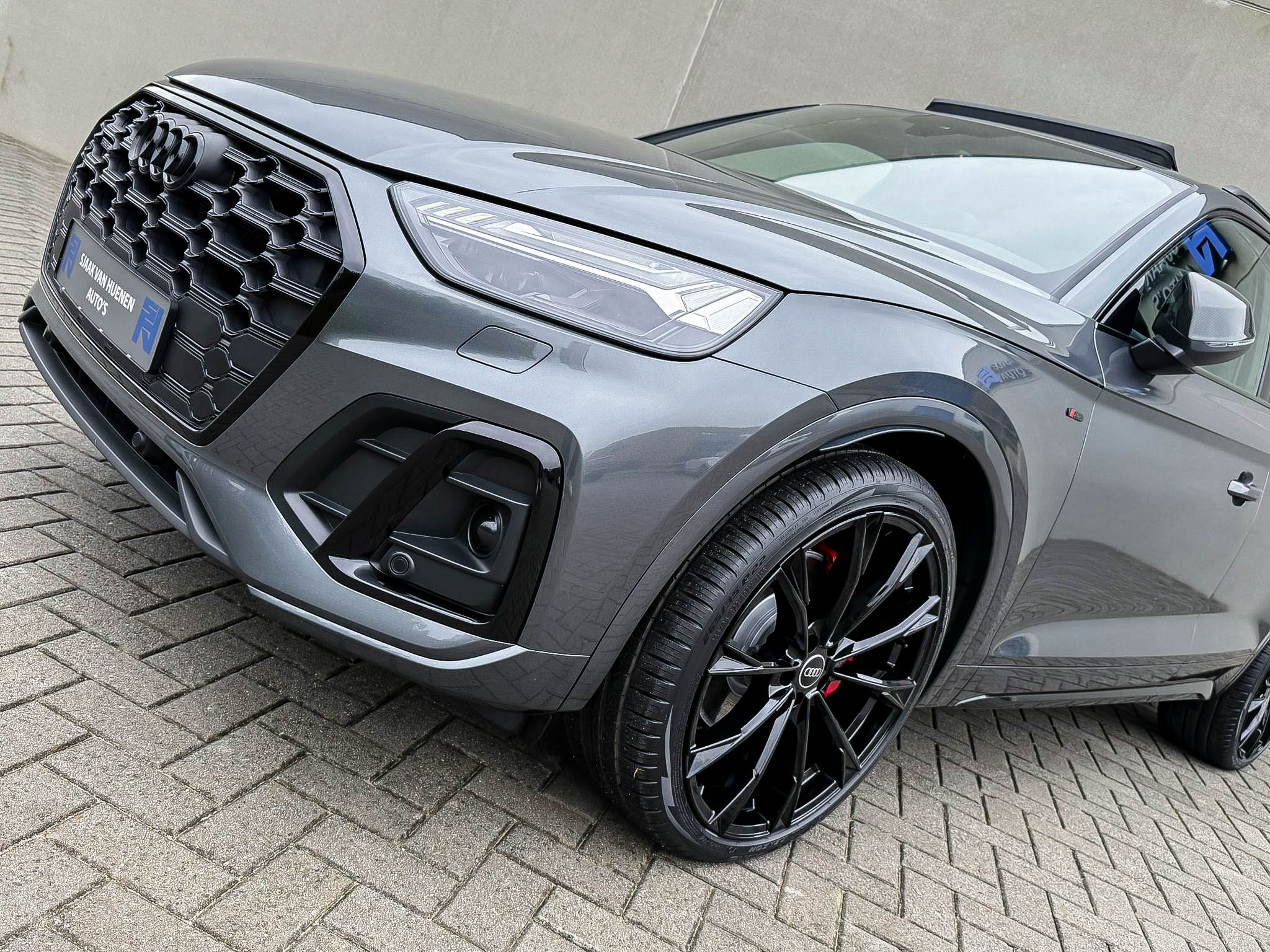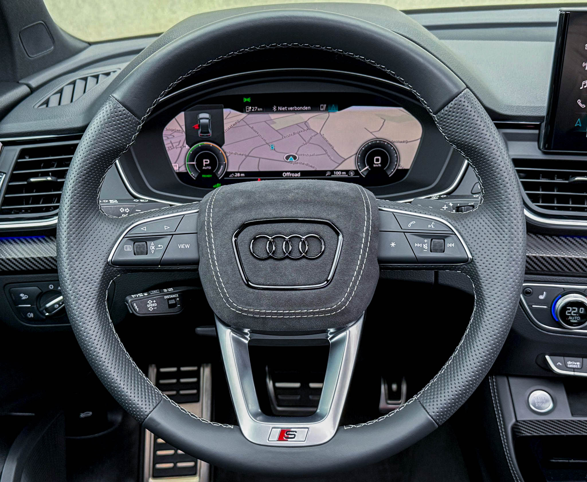 NIEUW MODEL | MODEL 2022! Een in nieuwstaat verkerende Audi Q5 50 TFSI e 220kw/299pk Quattro Competition S-Tronic Automaat Pro Line S S-Line! Audi dealer afkomstig, van de 1e eigenaar met een bijzonder interessant gecontroleerde tellerstand van slechts 32.521km. In unieke en perfecte fabrieksconfiguratie; Daytona Grey parel lak gecombineerd met het Zwart optiekpakket, de comfortabele instelbare Luchtvering, de Elektrisch verstelbare zwart lederen/alcantara S-line sportstoelen incl. massage- & geheugenfunctie + Audi Exclusive Alcantara airbag, het Panoramisch glazen schuif-/kanteldak en natuurlijk de Audi Virtual Cockpit! Deze Audi biedt met de 299pk en 450Nm sterke 2.0 liter TFSI turbomotor, gekoppeld aan de Audi Quattro 4-wielaandrijving een trekvermogen van 2000kg. Het betreft een BTW-auto, dus voor zowel de zakelijke als particuliere klant interessant. De getoonde 22inch Black Performance velgenset met 4x Pirelli Scorpion ZERO Allseason banden is tegen geringe meerprijs van €2595,- te verkrijgen.