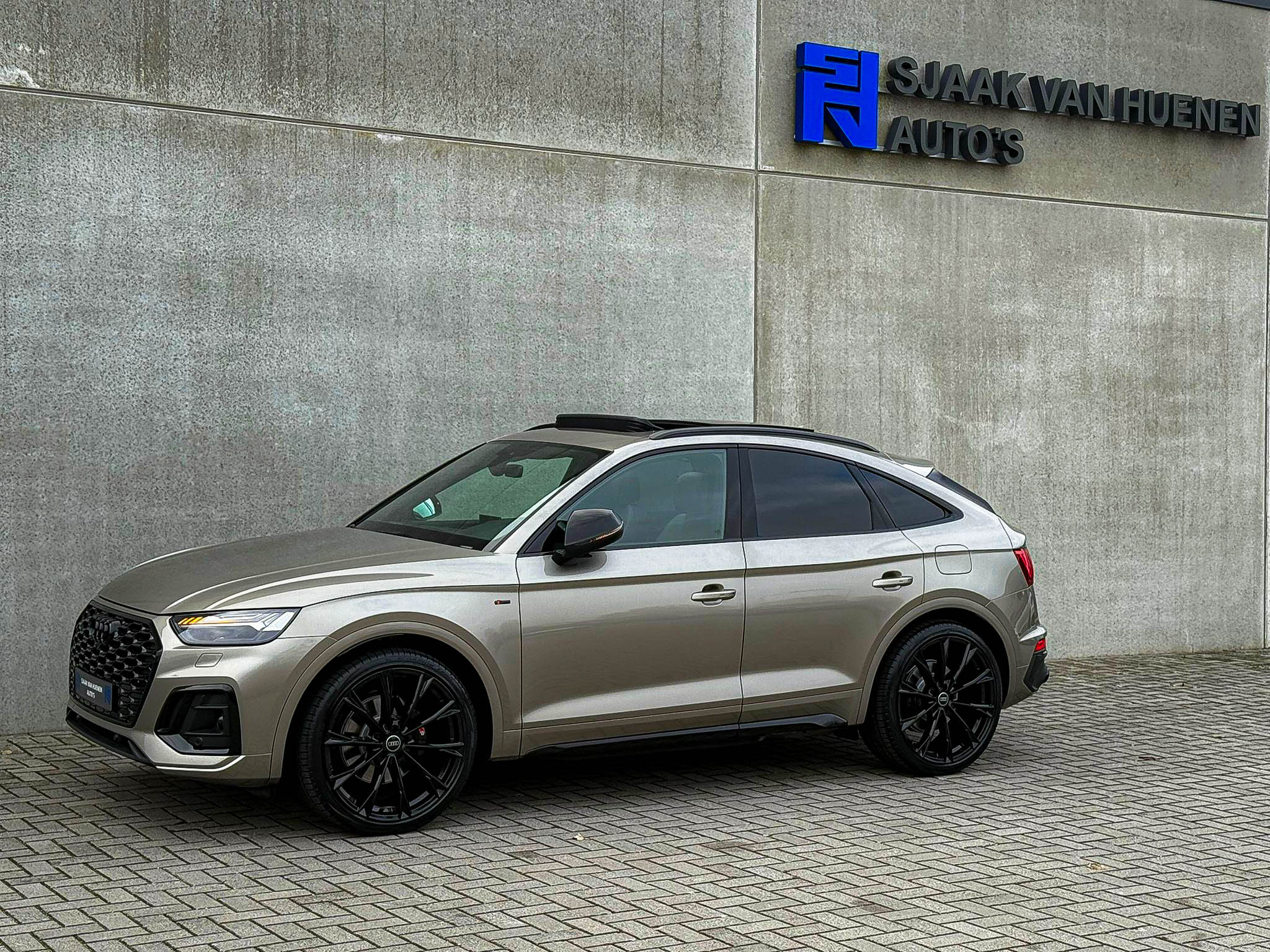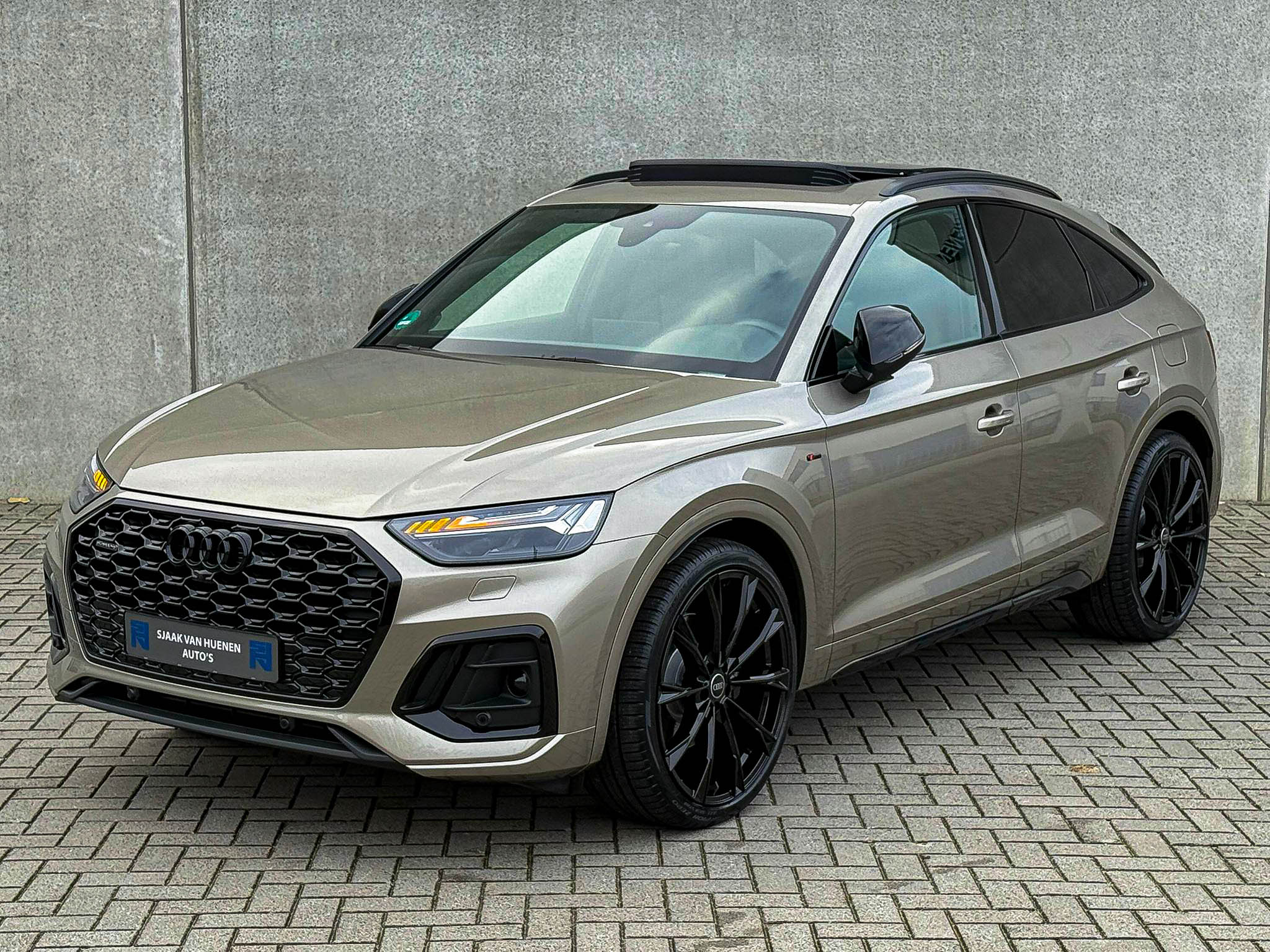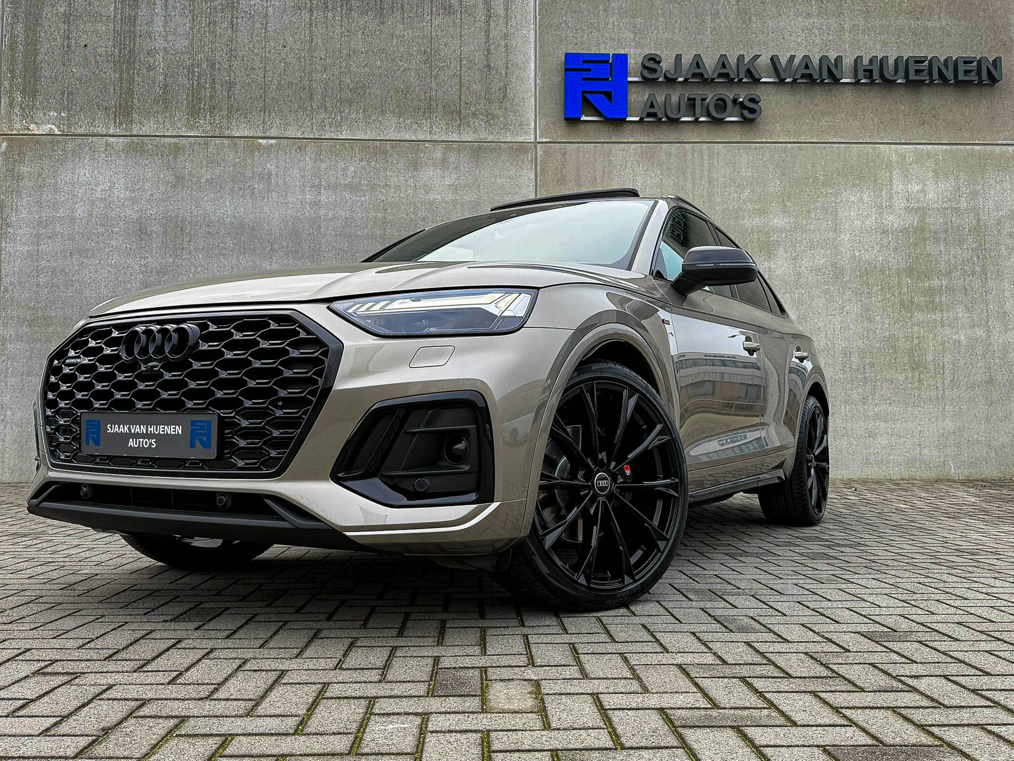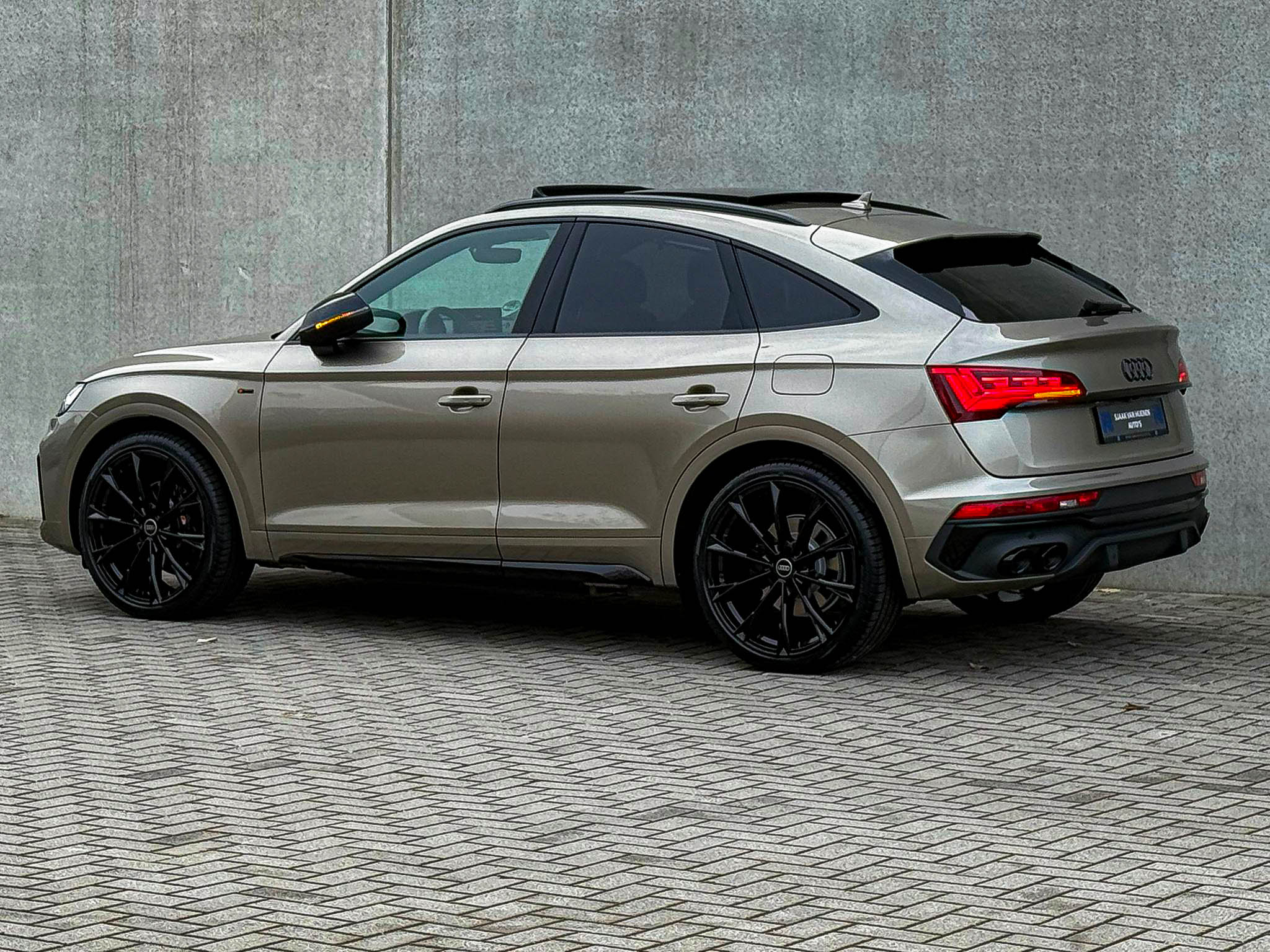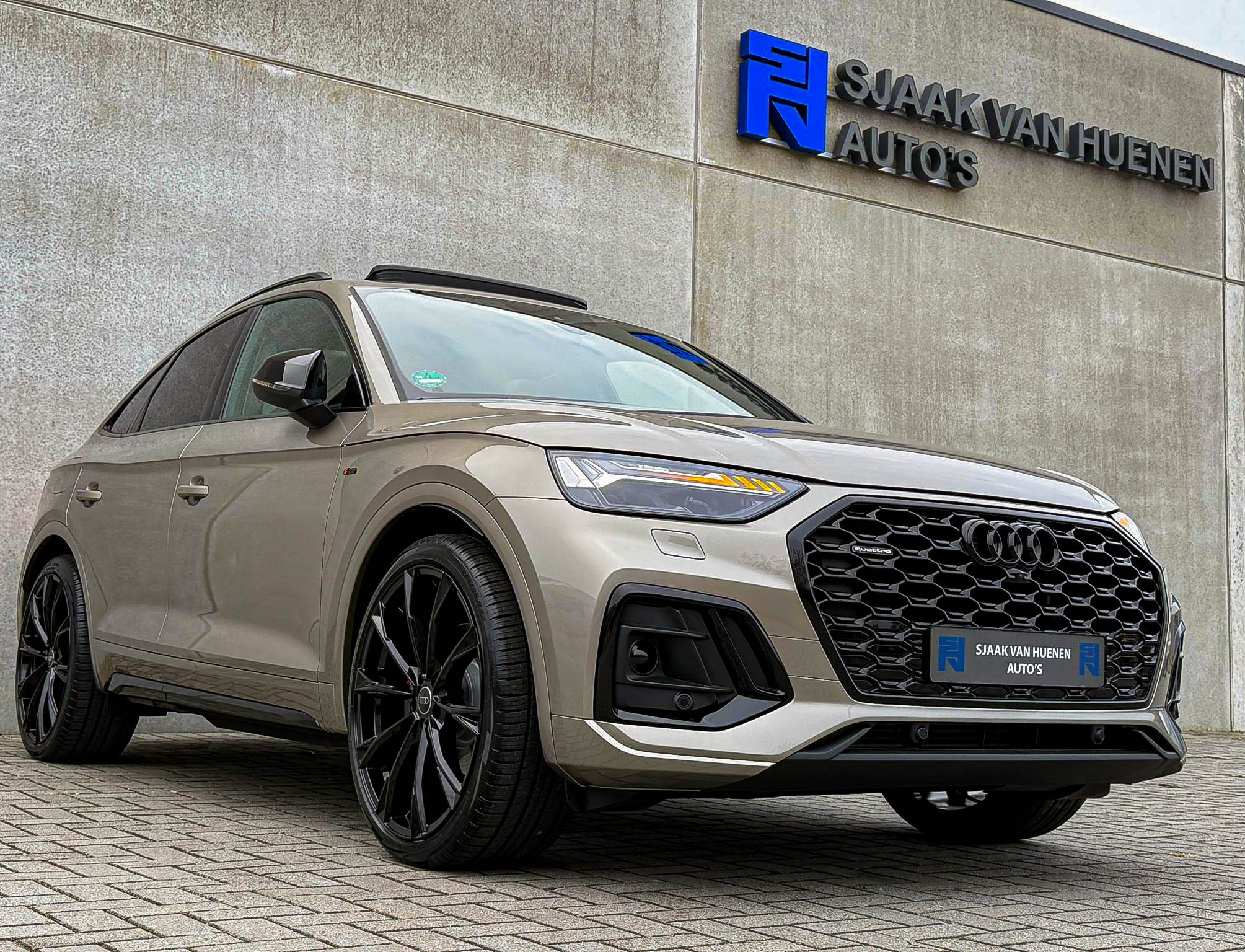 NIEUW MODEL | MODEL 2023! Een bijzonder unieke  Audi Q5 Sportback 50 TFSI e 220kw/299pk Quattro Competition S-Tronic Automaat Pro Line S S-Line! Het betreft een origineel AUDI EXCLUSIVE dealer exemplaar welke afkomstig is van de 1e eigenaar met een zeer nette tellerstand van slechts 36.534km. In unieke en perfecte fabrieksconfiguratie; Audi Exclusive Karatbeige Metallic lak gecombineerd met het Zwart optiekpakket, De actieve comfortabele instelbare dynamische Luchtvering, De elektrisch verstelbare Audi Exclusive Bruin Valcona lederen S stoelen incl. geheugen fuctie / Memory/Massage, Audi Exclusive Alcantara airbag incl. bruine stiksels + Afgevlakt sportstuur, Verwarmde en gekoelde bekerhouders, Panoramisch glazen schuif-/kanteldak, verwarmde en gekoelde bekerhouders, stoelverwarming voor en achter en natuurlijk de Audi Virtual Cockpit plus! Deze Audi biedt met de 299pk en 450Nm sterke 2.0 liter TFSI turbomotor, gekoppeld aan de Audi Quattro 4-wielaandrijving een trekvermogen van 2000kg. Het betreft een BTW-auto, dus voor zowel de zakelijke als particuliere klant interessant. De getoonde 22inch Black Performance velgenset met 4x Pirelli Scorpion ZERO Allseason banden is tegen geringe meerprijs van €2595,- te verkrijgen.