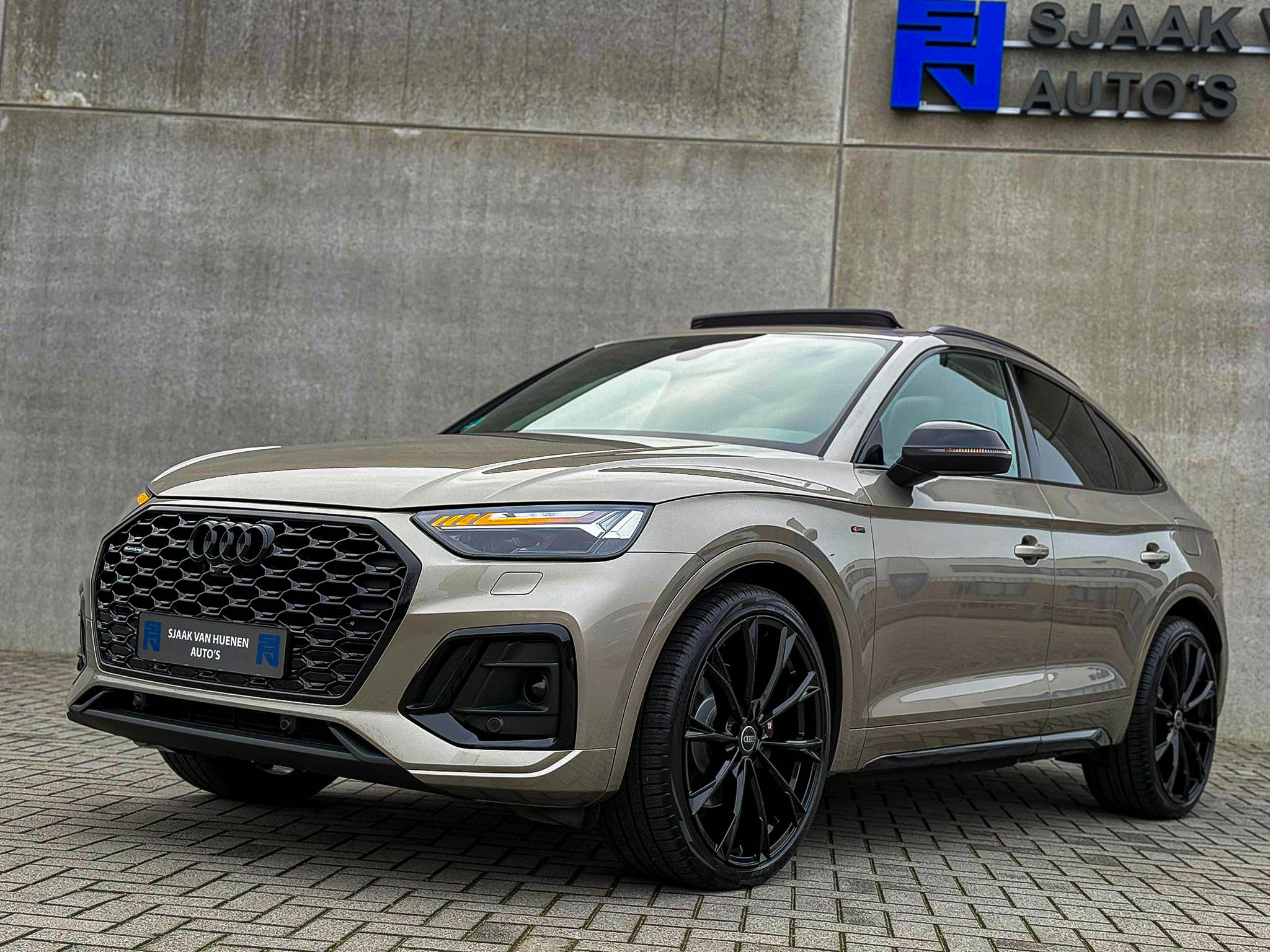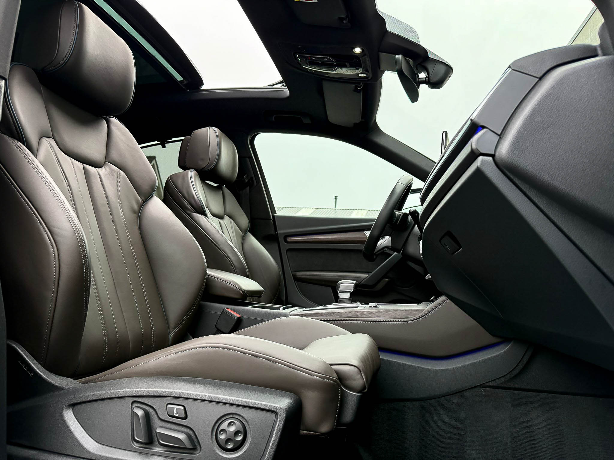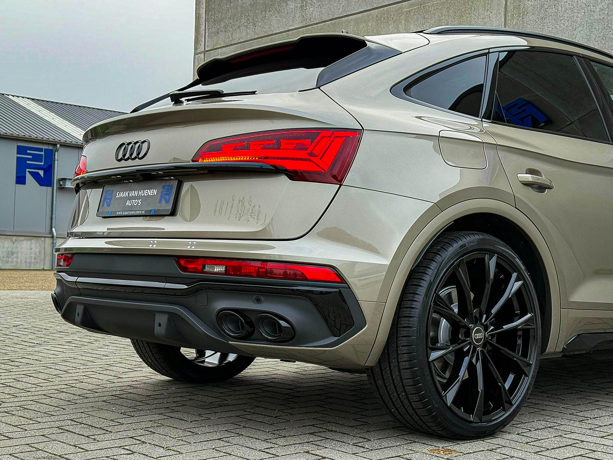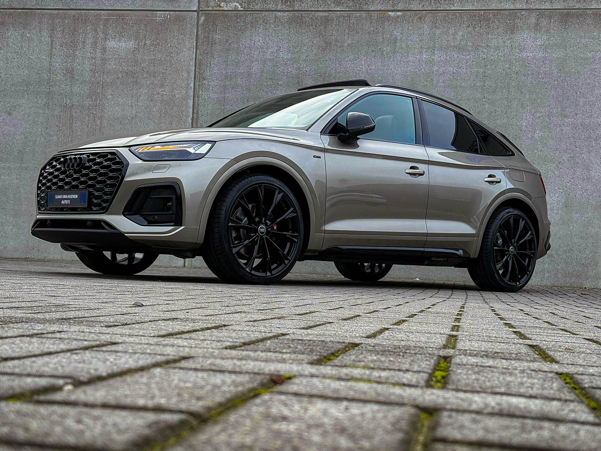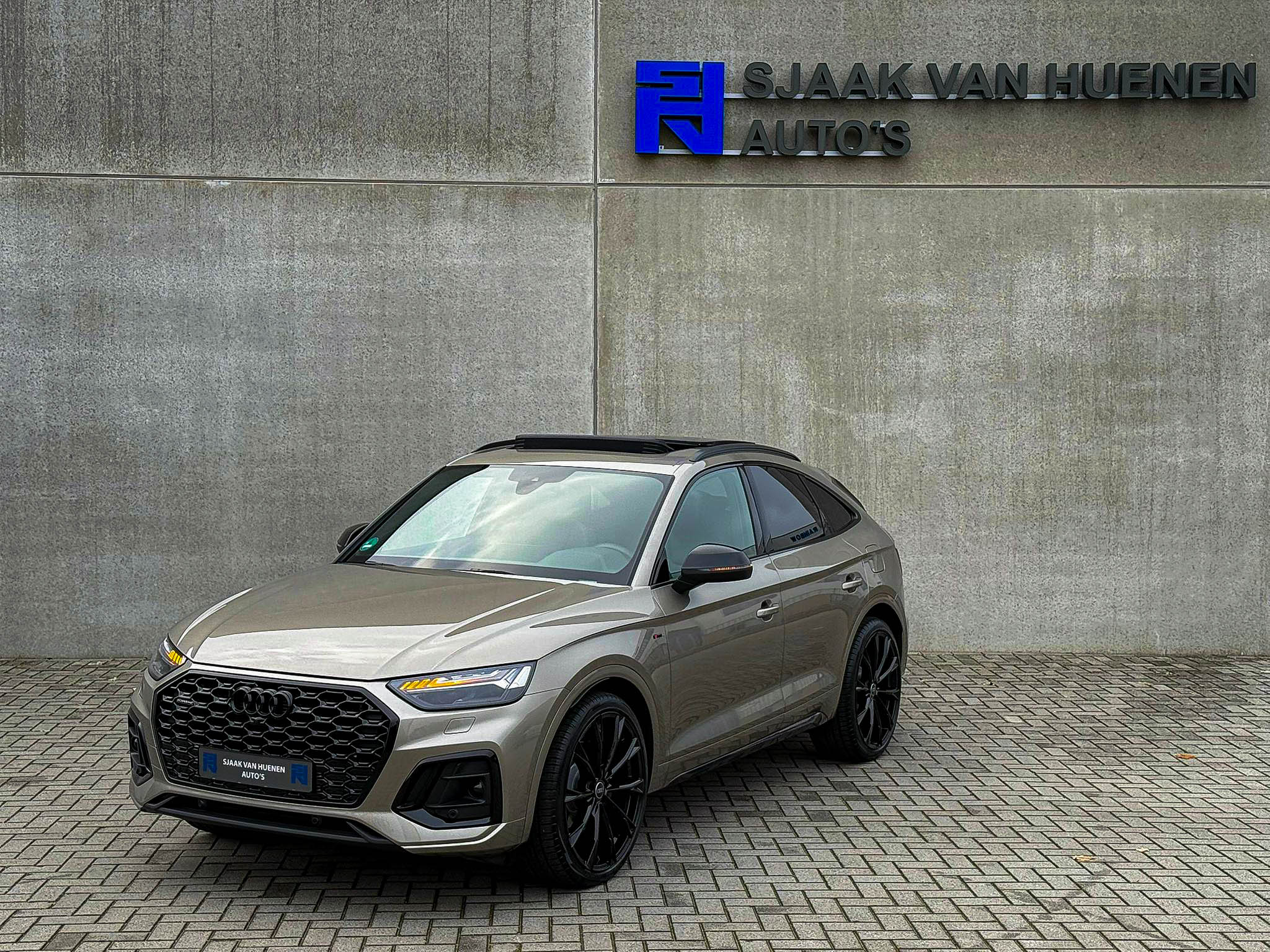 NIEUW MODEL | MODEL 2023! Een bijzonder unieke  Audi Q5 Sportback 50 TFSI e 220kw/299pk Quattro Competition S-Tronic Automaat Pro Line S S-Line! Het betreft een origineel AUDI EXCLUSIVE dealer exemplaar welke afkomstig is van de 1e eigenaar met een zeer nette tellerstand van slechts 36.534km. In unieke en perfecte fabrieksconfiguratie; Audi Exclusive Karatbeige Metallic lak gecombineerd met het Zwart optiekpakket, De actieve comfortabele instelbare dynamische Luchtvering, De elektrisch verstelbare Audi Exclusive Bruin Valcona lederen S stoelen incl. geheugen fuctie / Memory/Massage, Audi Exclusive Alcantara airbag incl. bruine stiksels + Afgevlakt sportstuur, Verwarmde en gekoelde bekerhouders, Panoramisch glazen schuif-/kanteldak, verwarmde en gekoelde bekerhouders, stoelverwarming voor en achter en natuurlijk de Audi Virtual Cockpit plus! Deze Audi biedt met de 299pk en 450Nm sterke 2.0 liter TFSI turbomotor, gekoppeld aan de Audi Quattro 4-wielaandrijving een trekvermogen van 2000kg. Het betreft een BTW-auto, dus voor zowel de zakelijke als particuliere klant interessant. De getoonde 22inch Black Performance velgenset met 4x Pirelli Scorpion ZERO Allseason banden is tegen geringe meerprijs van €2595,- te verkrijgen.