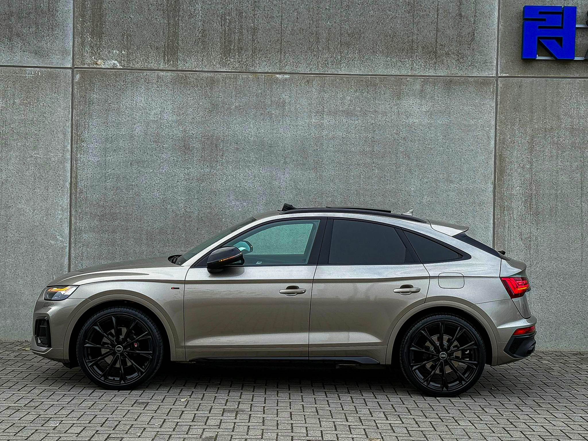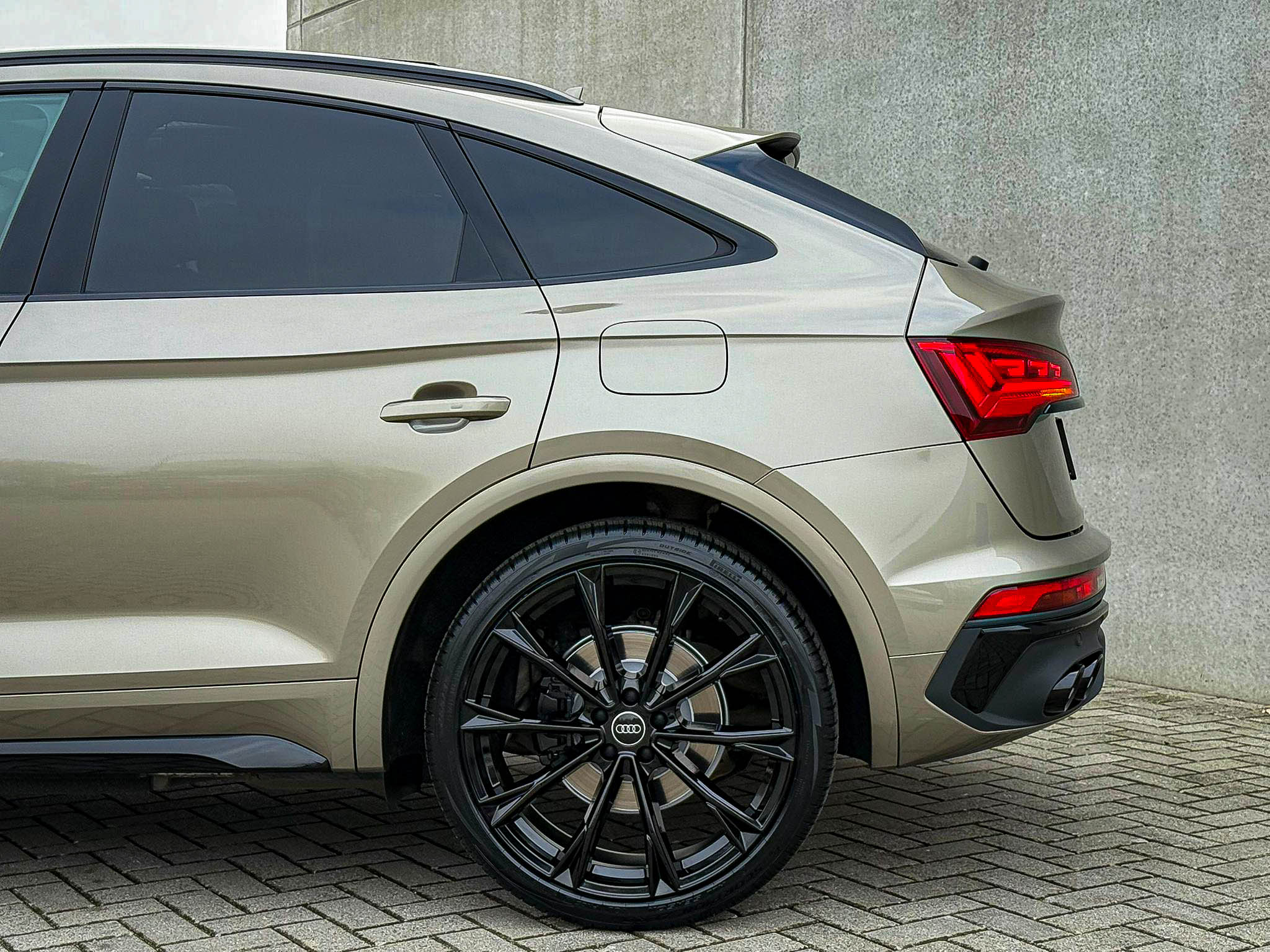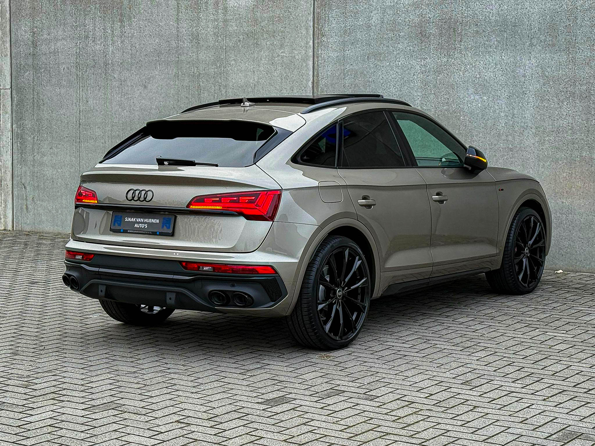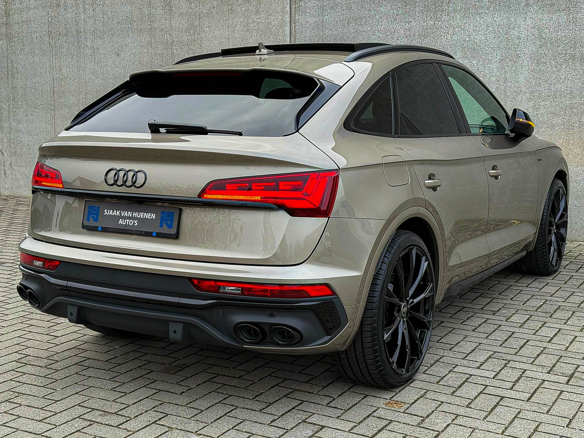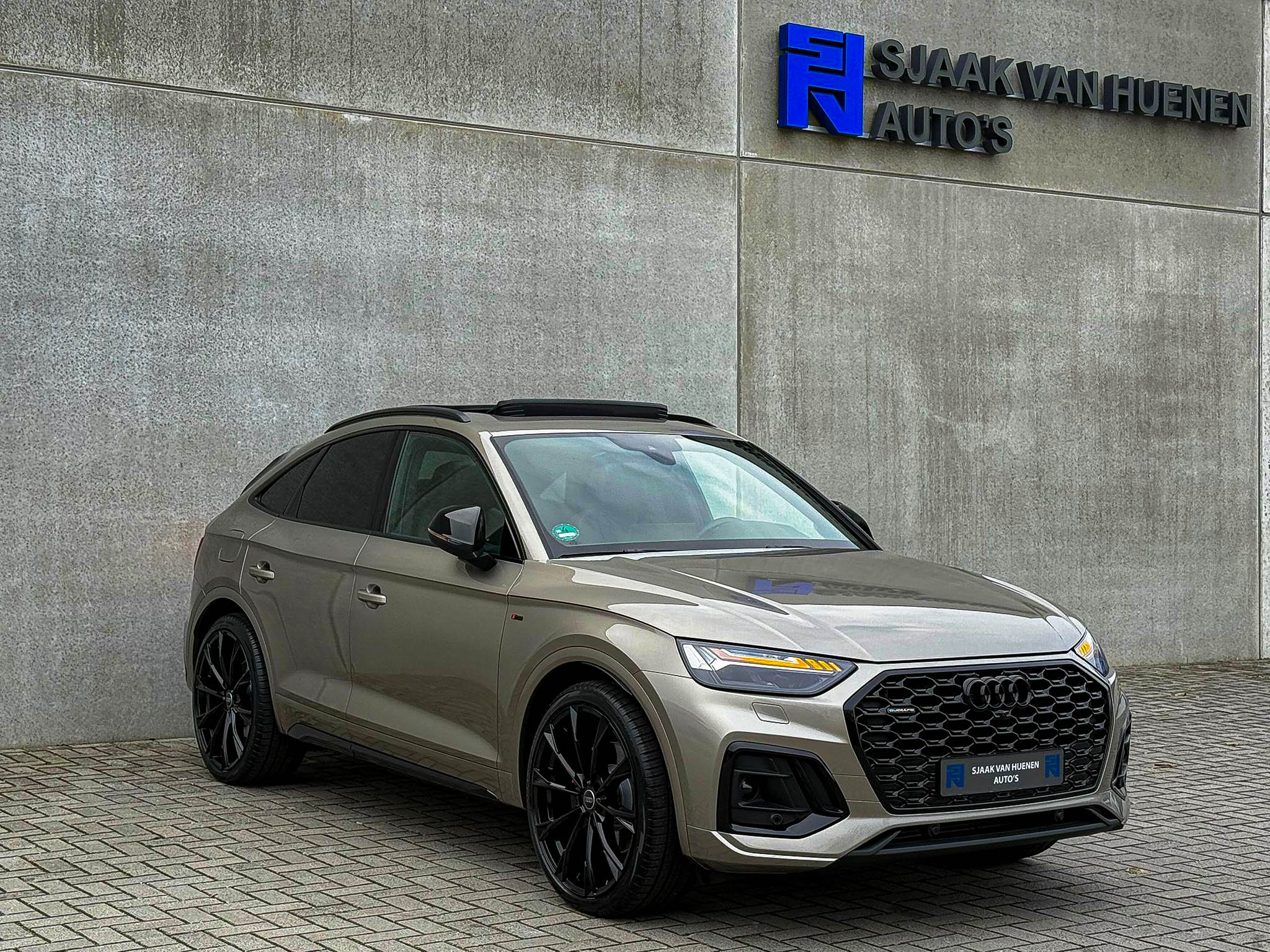 NIEUW MODEL | MODEL 2023! Een bijzonder unieke  Audi Q5 Sportback 50 TFSI e 220kw/299pk Quattro Competition S-Tronic Automaat Pro Line S S-Line! Het betreft een origineel AUDI EXCLUSIVE dealer exemplaar welke afkomstig is van de 1e eigenaar met een zeer nette tellerstand van slechts 36.534km. In unieke en perfecte fabrieksconfiguratie; Audi Exclusive Karatbeige Metallic lak gecombineerd met het Zwart optiekpakket, De actieve comfortabele instelbare dynamische Luchtvering, De elektrisch verstelbare Audi Exclusive Bruin Valcona lederen S stoelen incl. geheugen fuctie / Memory/Massage, Audi Exclusive Alcantara airbag incl. bruine stiksels + Afgevlakt sportstuur, Verwarmde en gekoelde bekerhouders, Panoramisch glazen schuif-/kanteldak, verwarmde en gekoelde bekerhouders, stoelverwarming voor en achter en natuurlijk de Audi Virtual Cockpit plus! Deze Audi biedt met de 299pk en 450Nm sterke 2.0 liter TFSI turbomotor, gekoppeld aan de Audi Quattro 4-wielaandrijving een trekvermogen van 2000kg. Het betreft een BTW-auto, dus voor zowel de zakelijke als particuliere klant interessant. De getoonde 22inch Black Performance velgenset met 4x Pirelli Scorpion ZERO Allseason banden is tegen geringe meerprijs van €2595,- te verkrijgen.