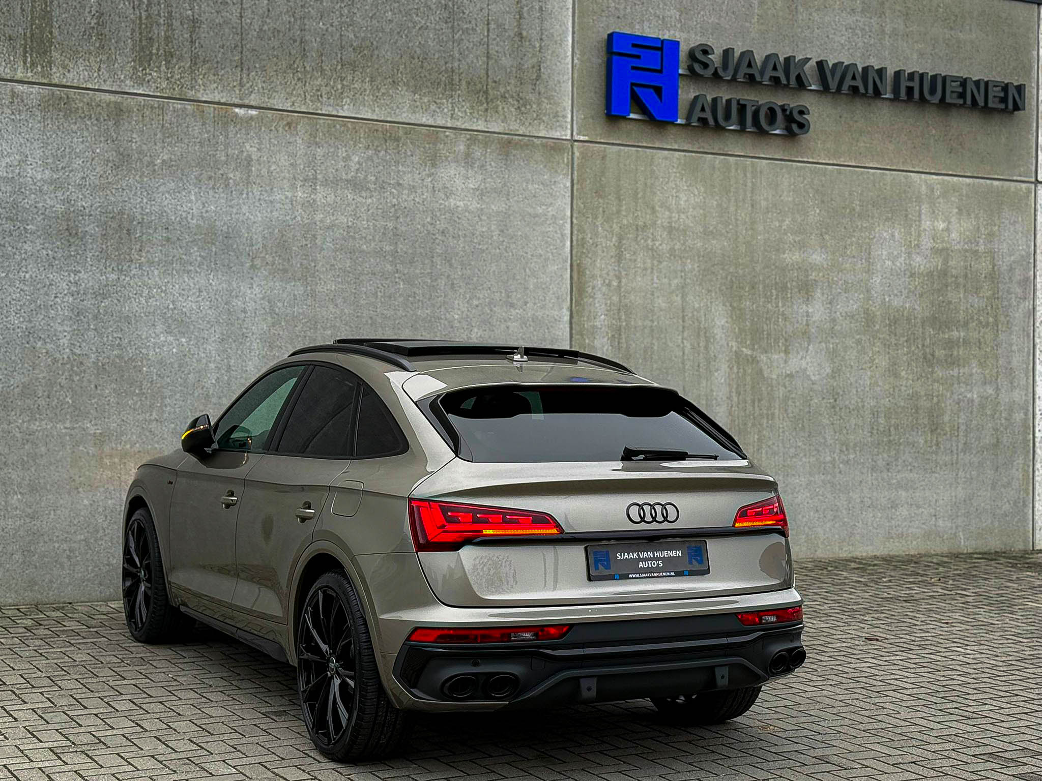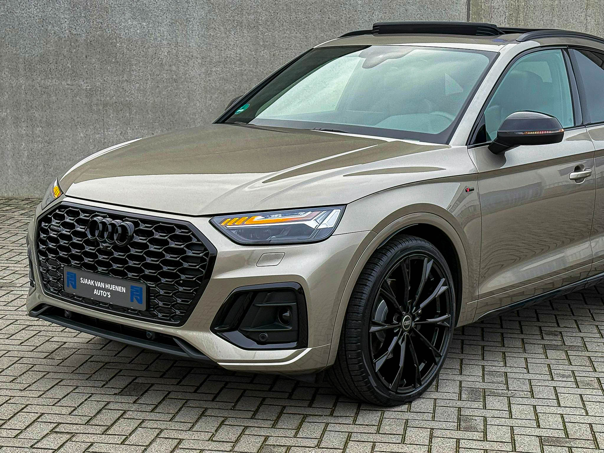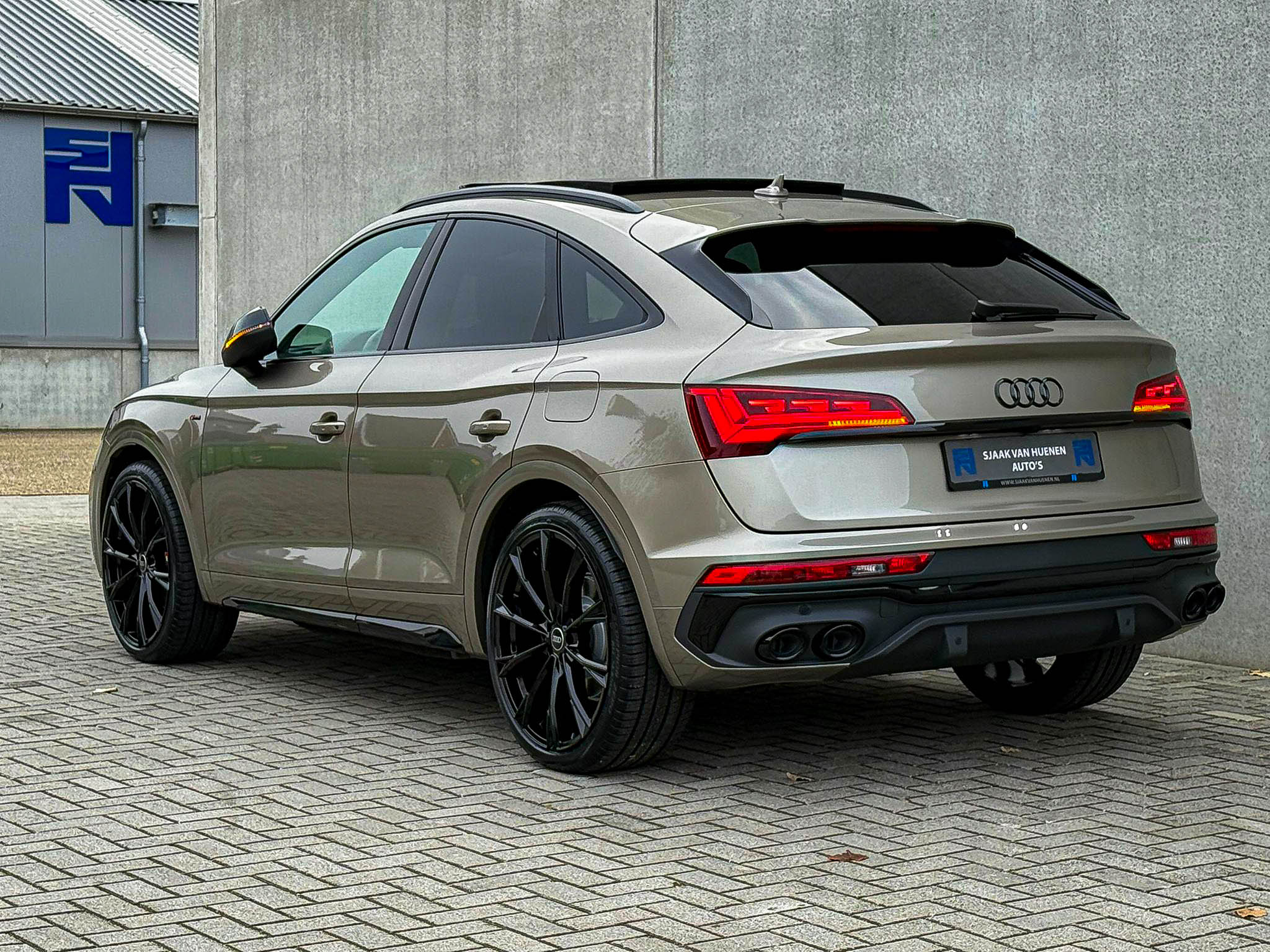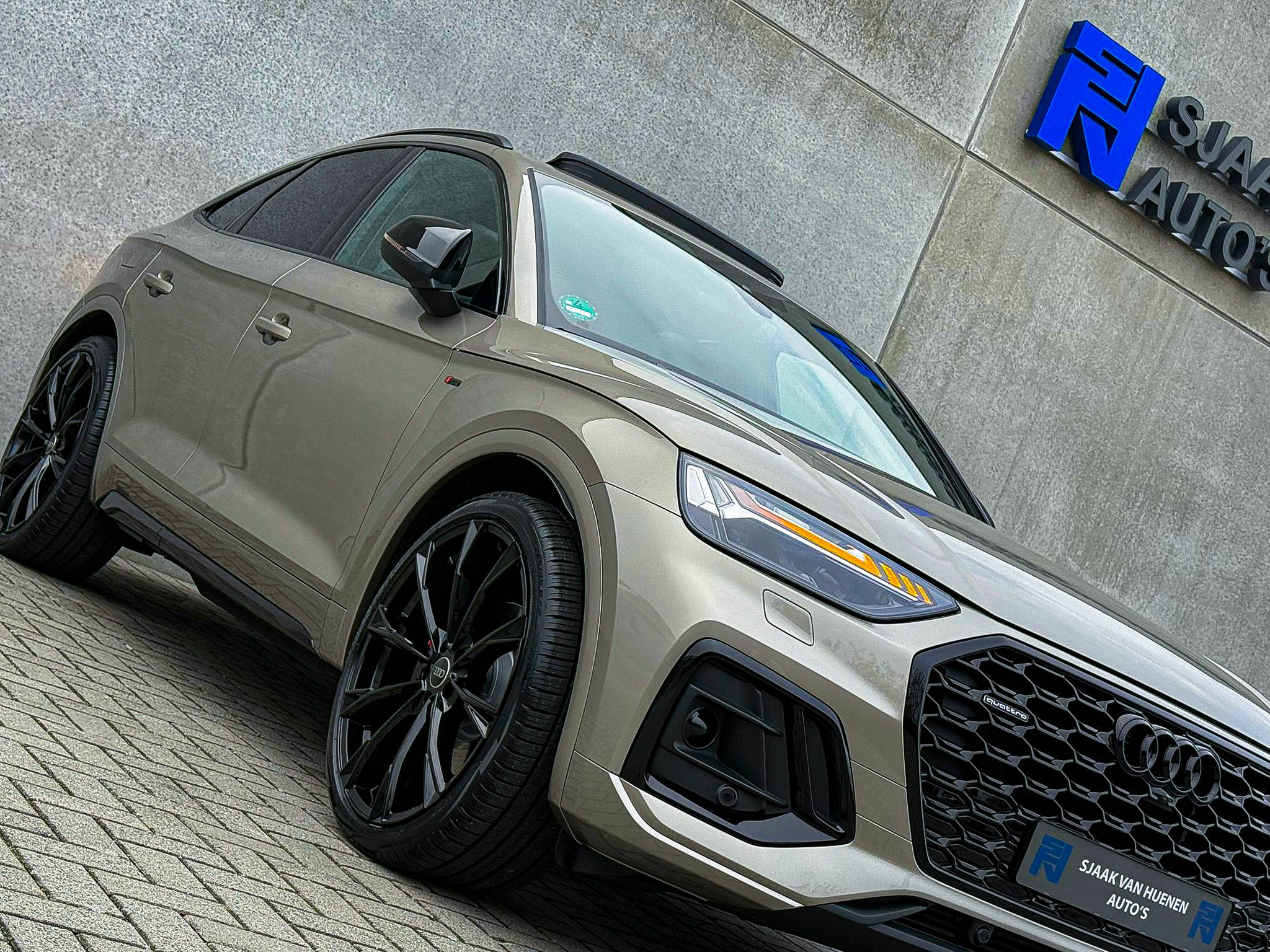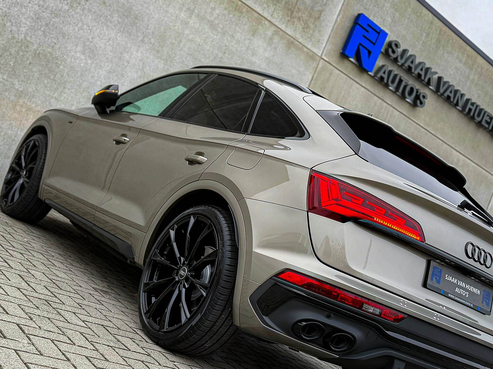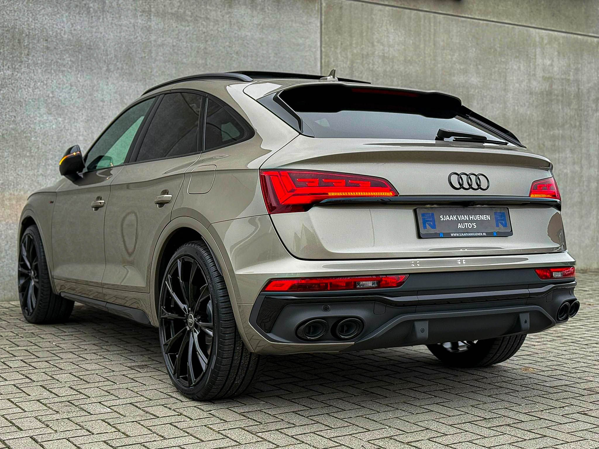 NIEUW MODEL | MODEL 2023! Een bijzonder unieke  Audi Q5 Sportback 50 TFSI e 220kw/299pk Quattro Competition S-Tronic Automaat Pro Line S S-Line! Het betreft een origineel AUDI EXCLUSIVE dealer exemplaar welke afkomstig is van de 1e eigenaar met een zeer nette tellerstand van slechts 36.534km. In unieke en perfecte fabrieksconfiguratie; Audi Exclusive Karatbeige Metallic lak gecombineerd met het Zwart optiekpakket, De actieve comfortabele instelbare dynamische Luchtvering, De elektrisch verstelbare Audi Exclusive Bruin Valcona lederen S stoelen incl. geheugen fuctie / Memory/Massage, Audi Exclusive Alcantara airbag incl. bruine stiksels + Afgevlakt sportstuur, Verwarmde en gekoelde bekerhouders, Panoramisch glazen schuif-/kanteldak, verwarmde en gekoelde bekerhouders, stoelverwarming voor en achter en natuurlijk de Audi Virtual Cockpit plus! Deze Audi biedt met de 299pk en 450Nm sterke 2.0 liter TFSI turbomotor, gekoppeld aan de Audi Quattro 4-wielaandrijving een trekvermogen van 2000kg. Het betreft een BTW-auto, dus voor zowel de zakelijke als particuliere klant interessant. De getoonde 22inch Black Performance velgenset met 4x Pirelli Scorpion ZERO Allseason banden is tegen geringe meerprijs van €2595,- te verkrijgen.