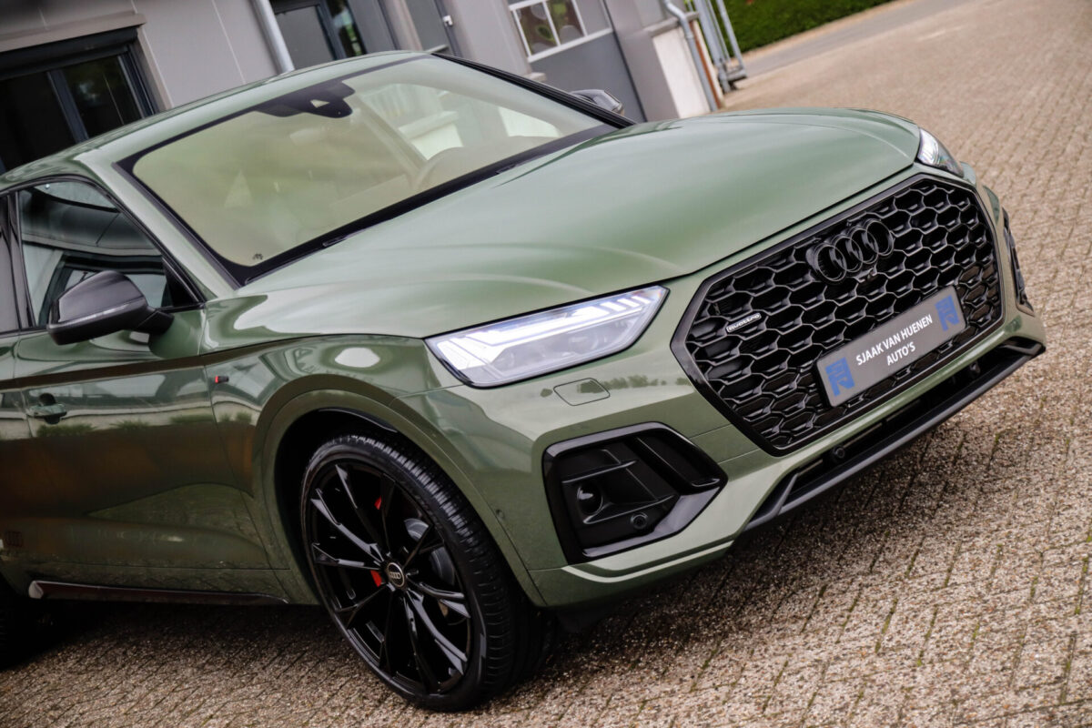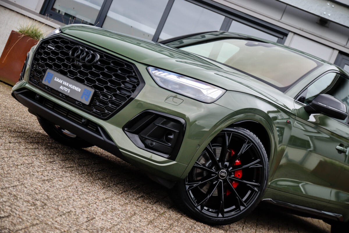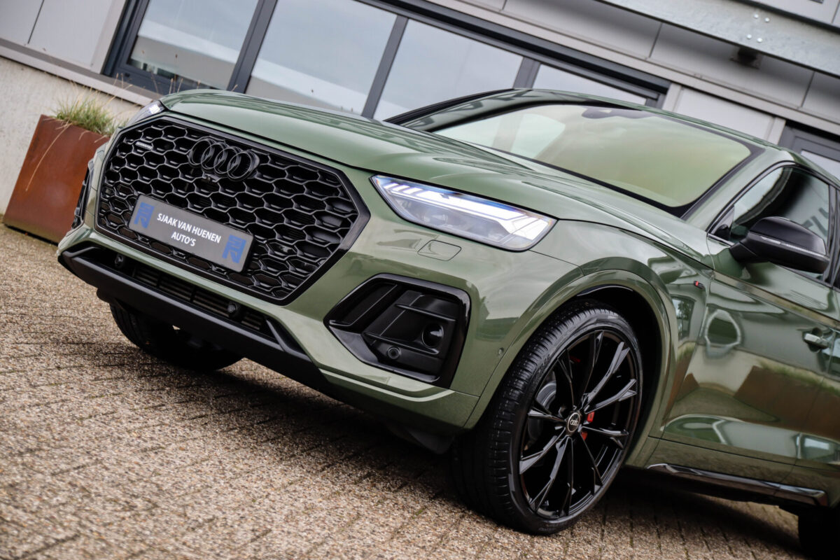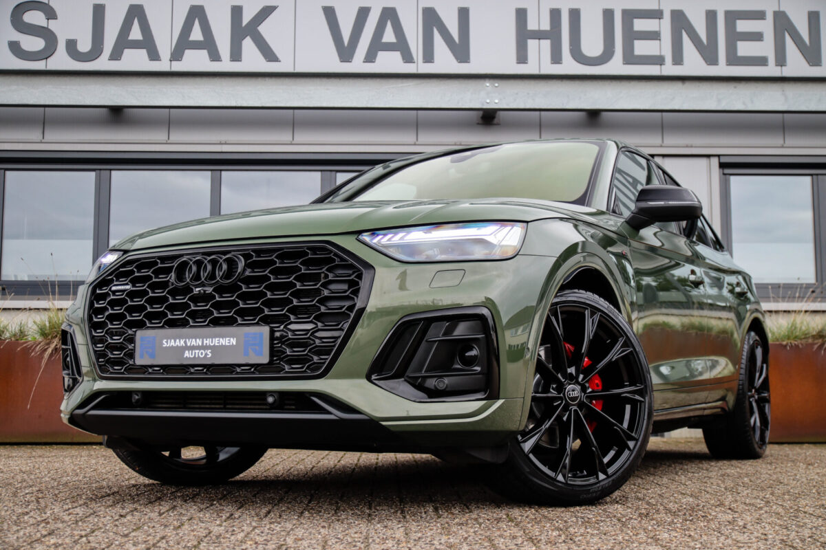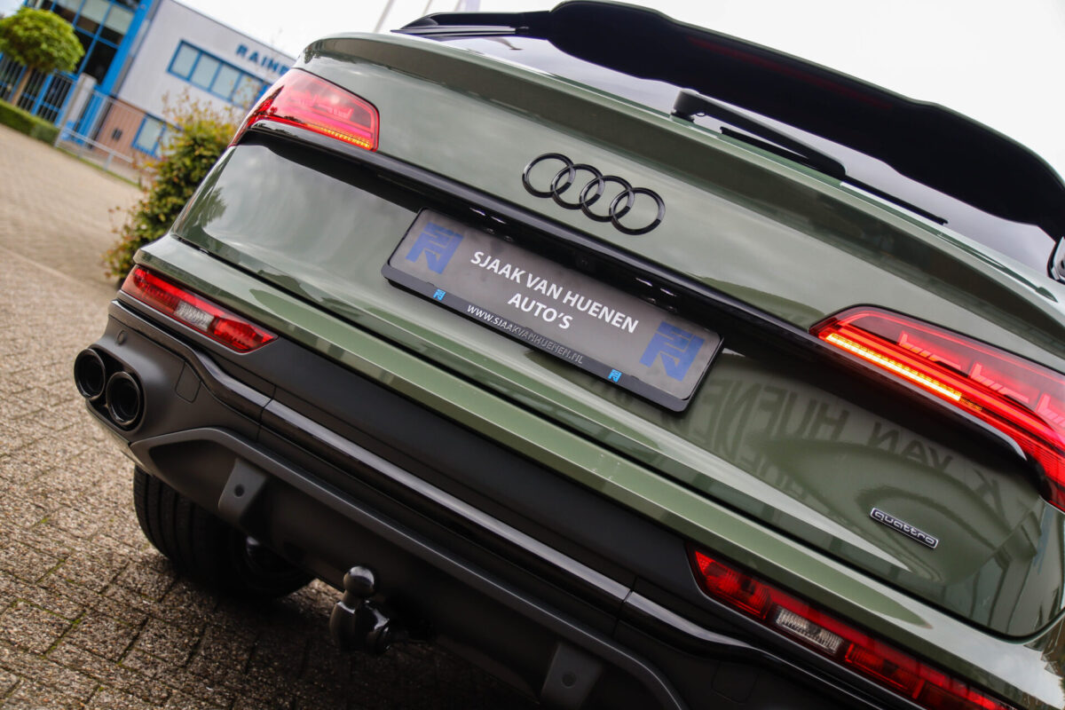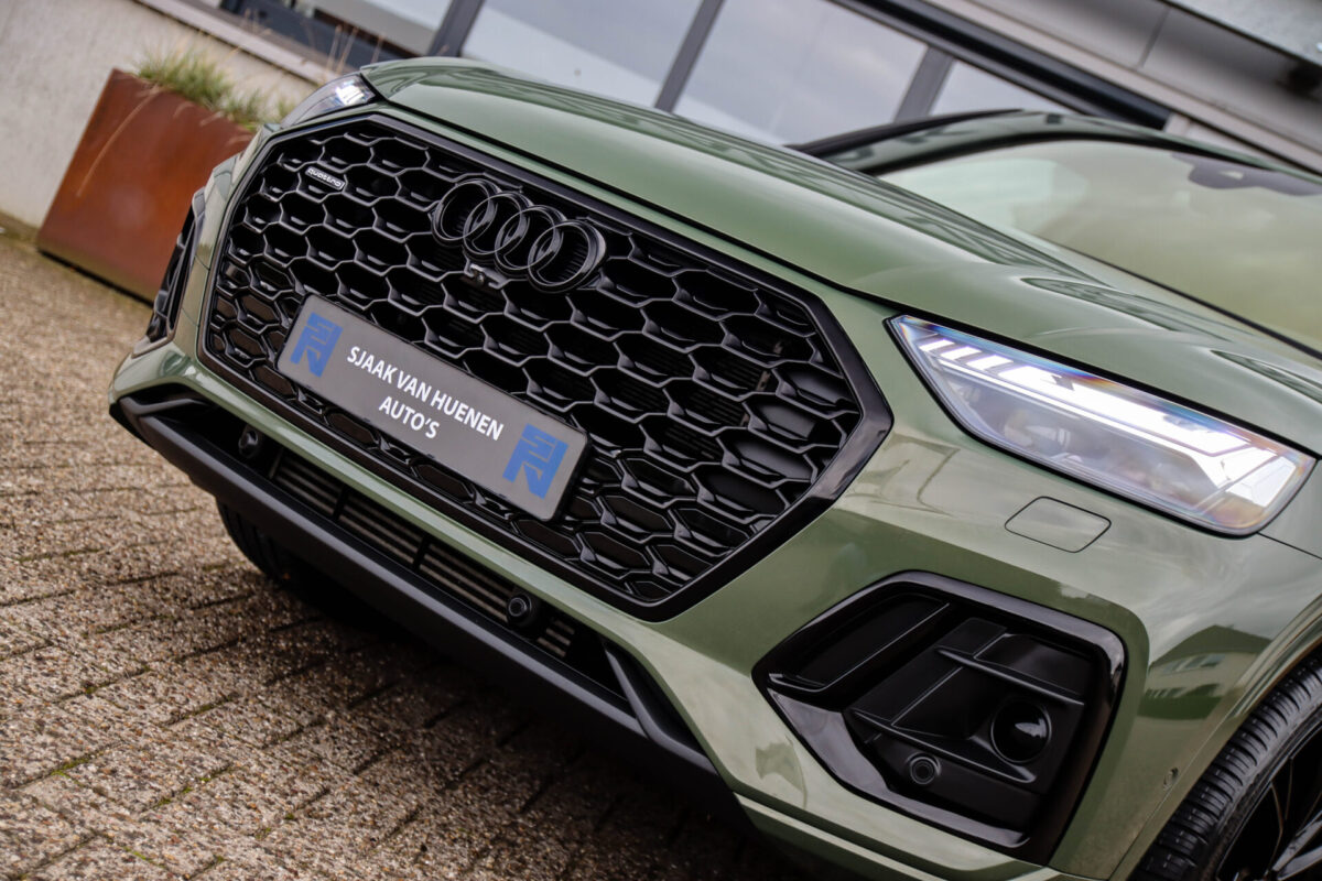NIEUW MODEL | MODEL 2022! Een in uitmuntende staat verkerende Audi Q5 55 TFSI e 270kw/367pk Quattro Competition S-Tronic Automaat Pro Line S S-Line! Het betreft een Audi dealer exemplaar welke afkomstig is van de 1e eigenaar met een zeer interessant gecontroleerde tellerstand van slechts 49.717km. Een uiterst smaakvolle SUV Coupe vanwege de District Green parel lak gecombineerd met het Zwart optiekpakket, de Elektrisch verstelbare zwart geperforeerd lederen sportstoelen incl. Stoelventilatie, de comfortabele Luchtvering en natuurlijk de Audi Virtual Cockpit! Deze Audi biedt met de 367pk en 500Nm sterke 2.0 liter TFSI turbomotor, gekoppeld aan de Audi Quattro 4-wielaandrijving een trekvermogen van 2000kg. Het betreft een BTW-auto, dus voor zowel de zakelijke als particuliere klant interessant. De getoonde 22inch Black Performance velgenset met 4x Pirelli Scorpion ZERO Allseason banden is tegen geringe meerprijs van €2595,- te verkrijgen.