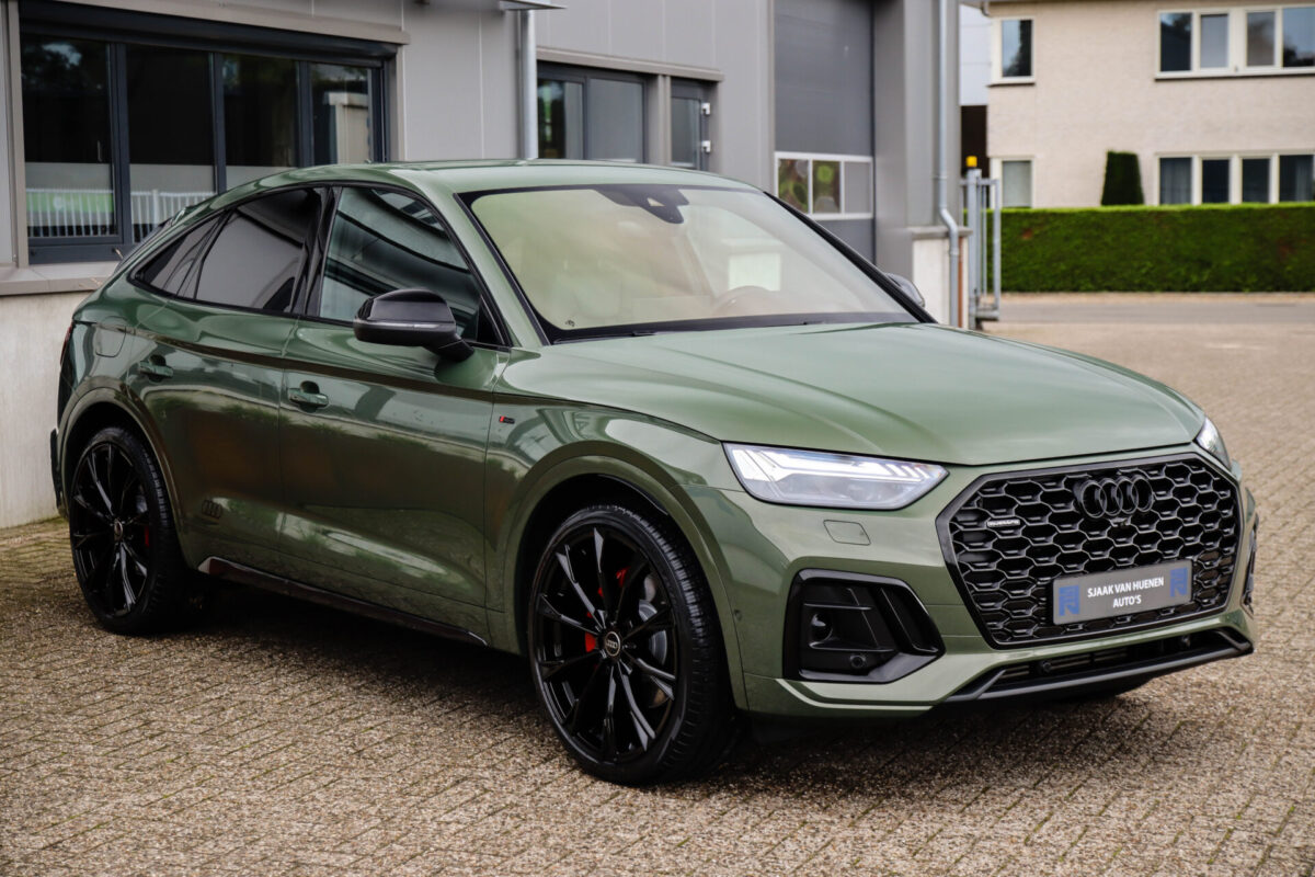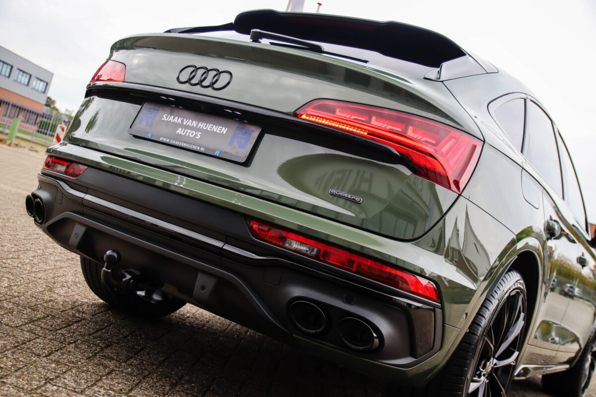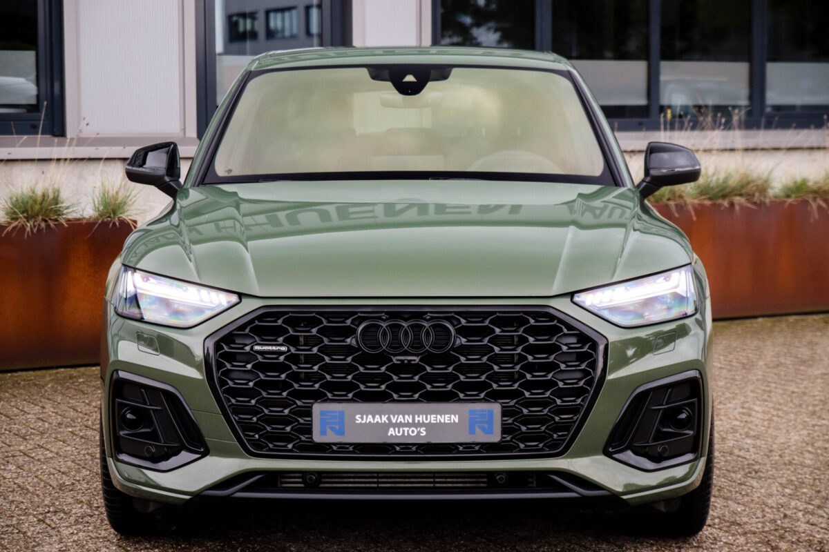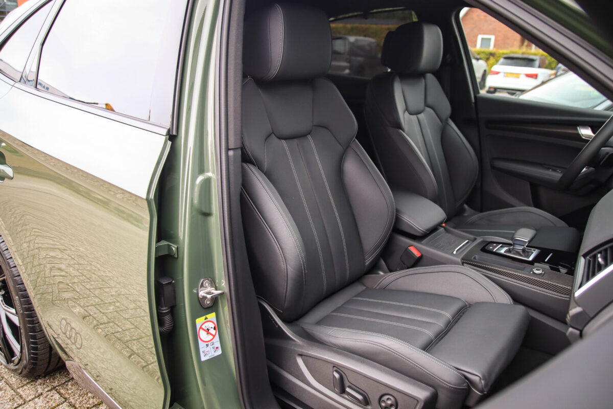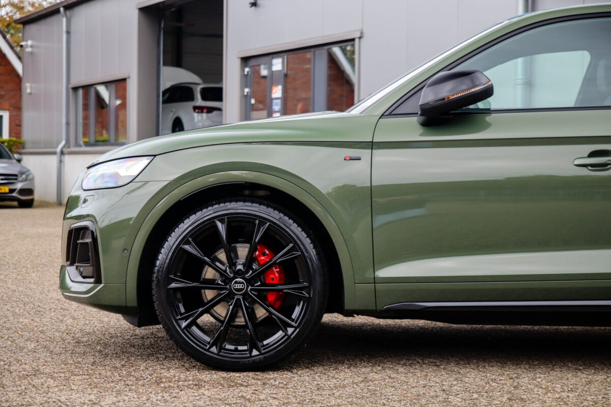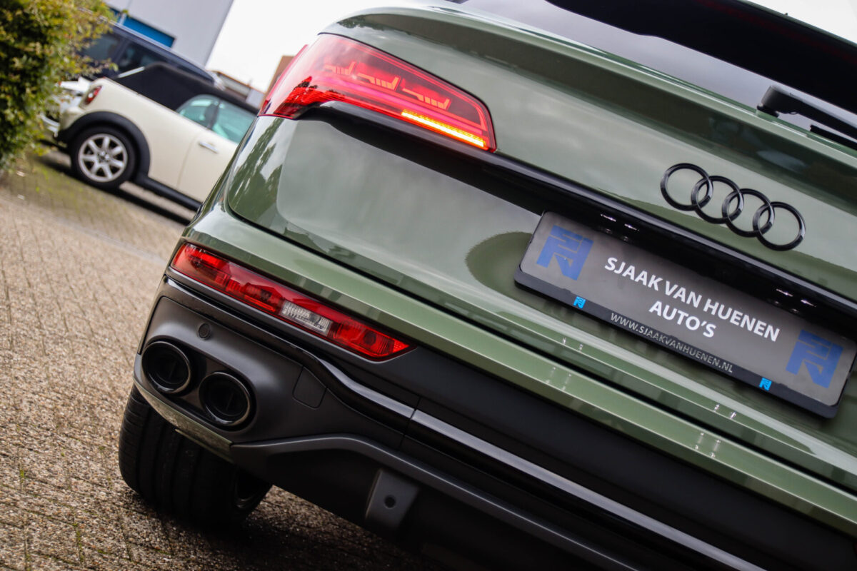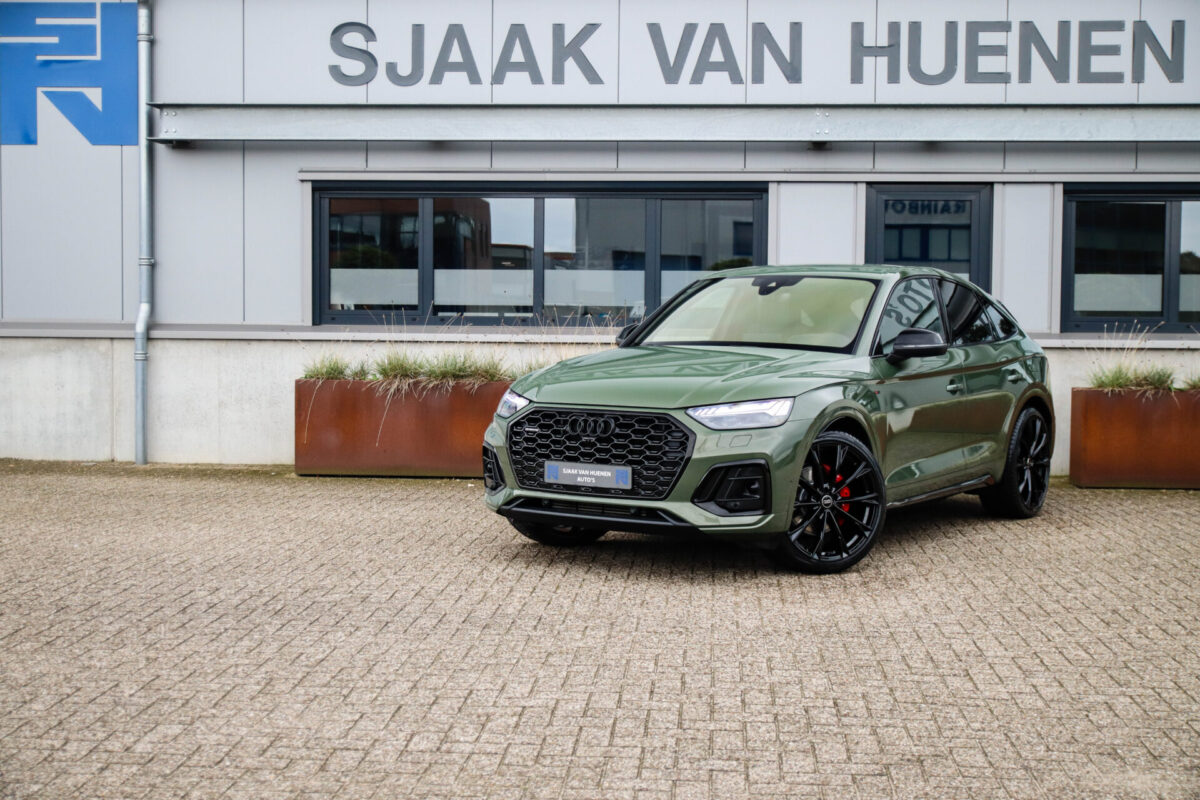 NIEUW MODEL | MODEL 2022! Een in uitmuntende staat verkerende Audi Q5 55 TFSI e 270kw/367pk Quattro Competition S-Tronic Automaat Pro Line S S-Line! Het betreft een Audi dealer exemplaar welke afkomstig is van de 1e eigenaar met een zeer interessant gecontroleerde tellerstand van slechts 49.717km. Een uiterst smaakvolle SUV Coupe vanwege de District Green parel lak gecombineerd met het Zwart optiekpakket, de Elektrisch verstelbare zwart geperforeerd lederen sportstoelen incl. Stoelventilatie, de comfortabele Luchtvering en natuurlijk de Audi Virtual Cockpit! Deze Audi biedt met de 367pk en 500Nm sterke 2.0 liter TFSI turbomotor, gekoppeld aan de Audi Quattro 4-wielaandrijving een trekvermogen van 2000kg. Het betreft een BTW-auto, dus voor zowel de zakelijke als particuliere klant interessant. De getoonde 22inch Black Performance velgenset met 4x Pirelli Scorpion ZERO Allseason banden is tegen geringe meerprijs van €2595,- te verkrijgen.