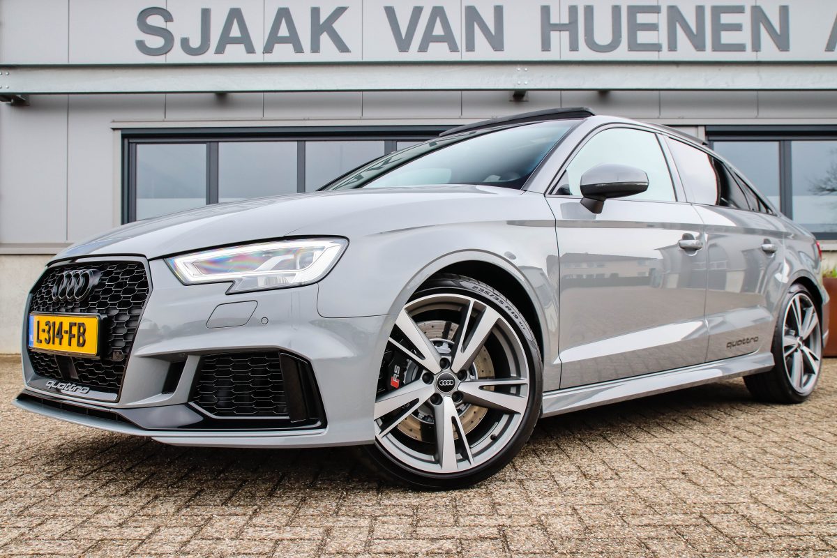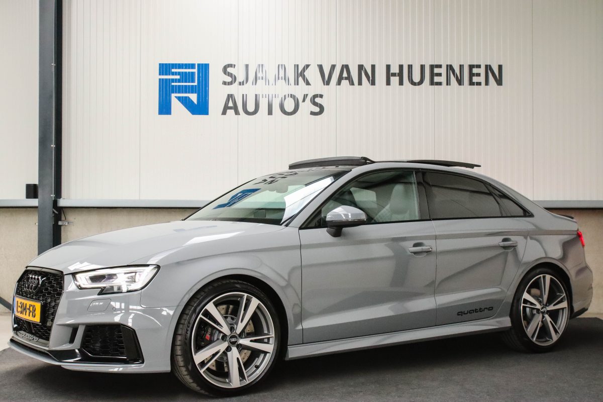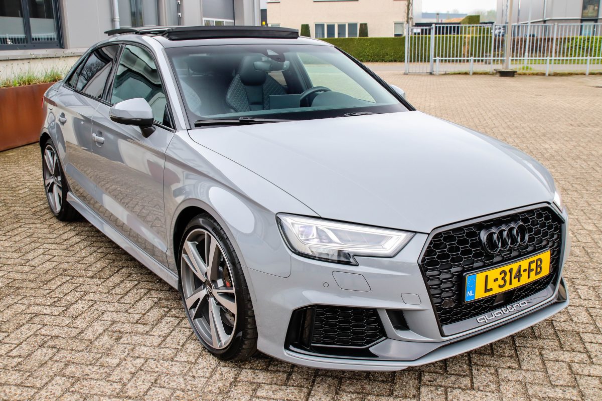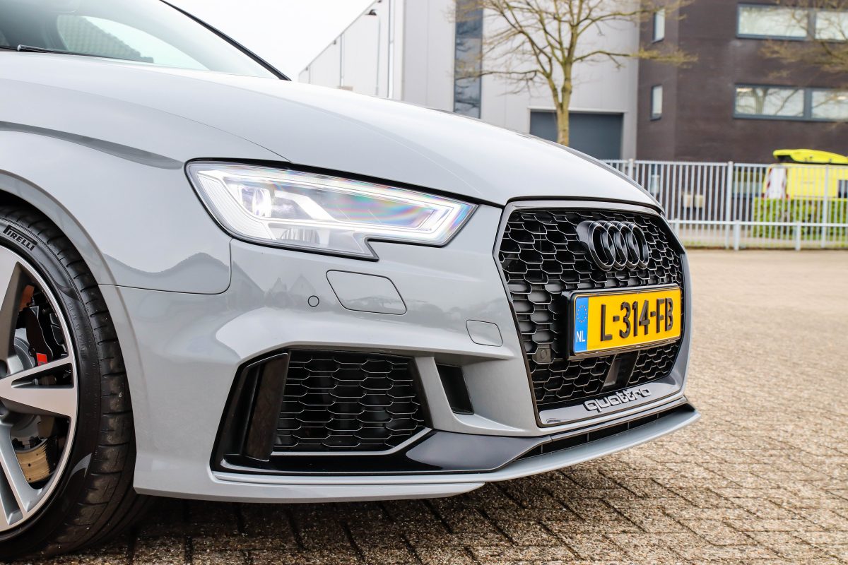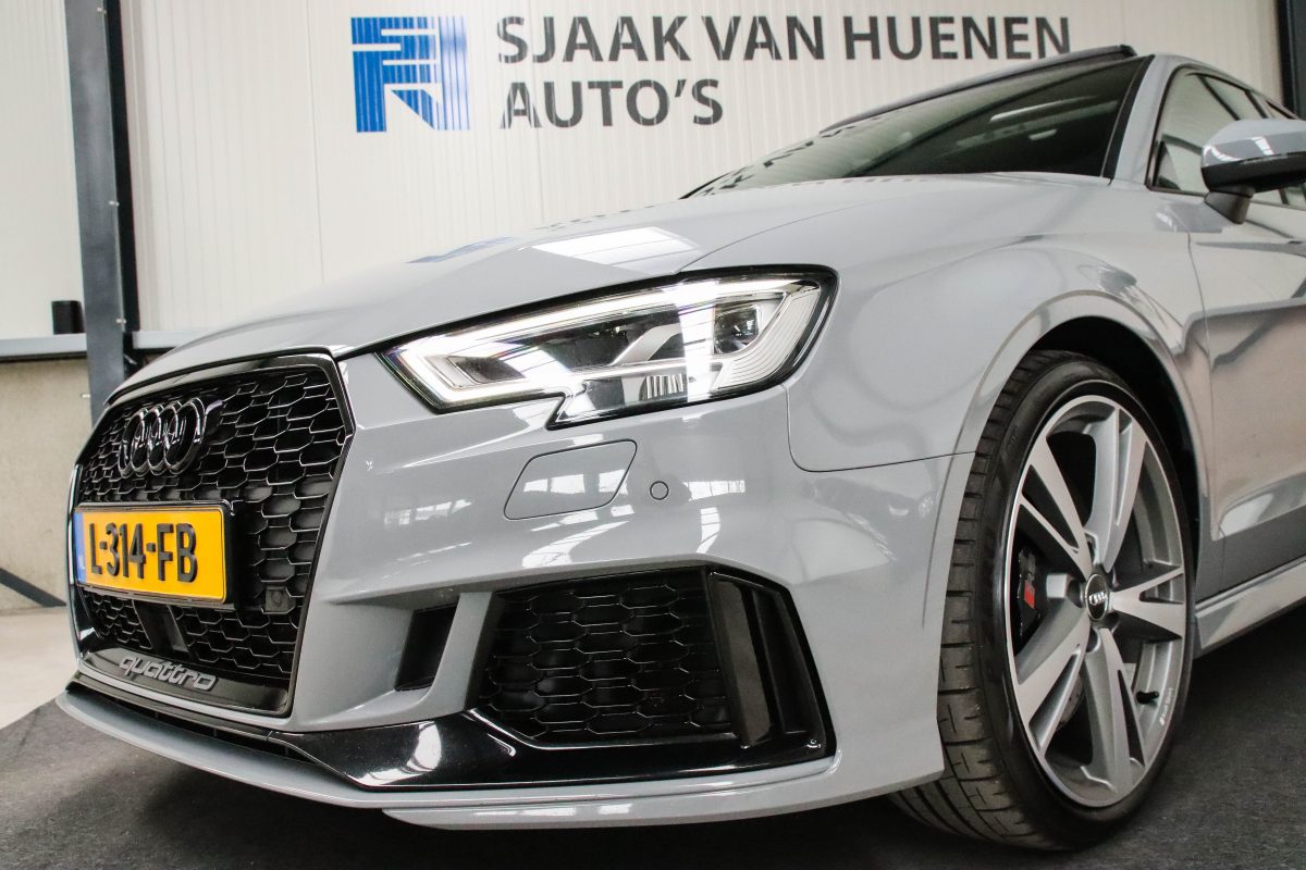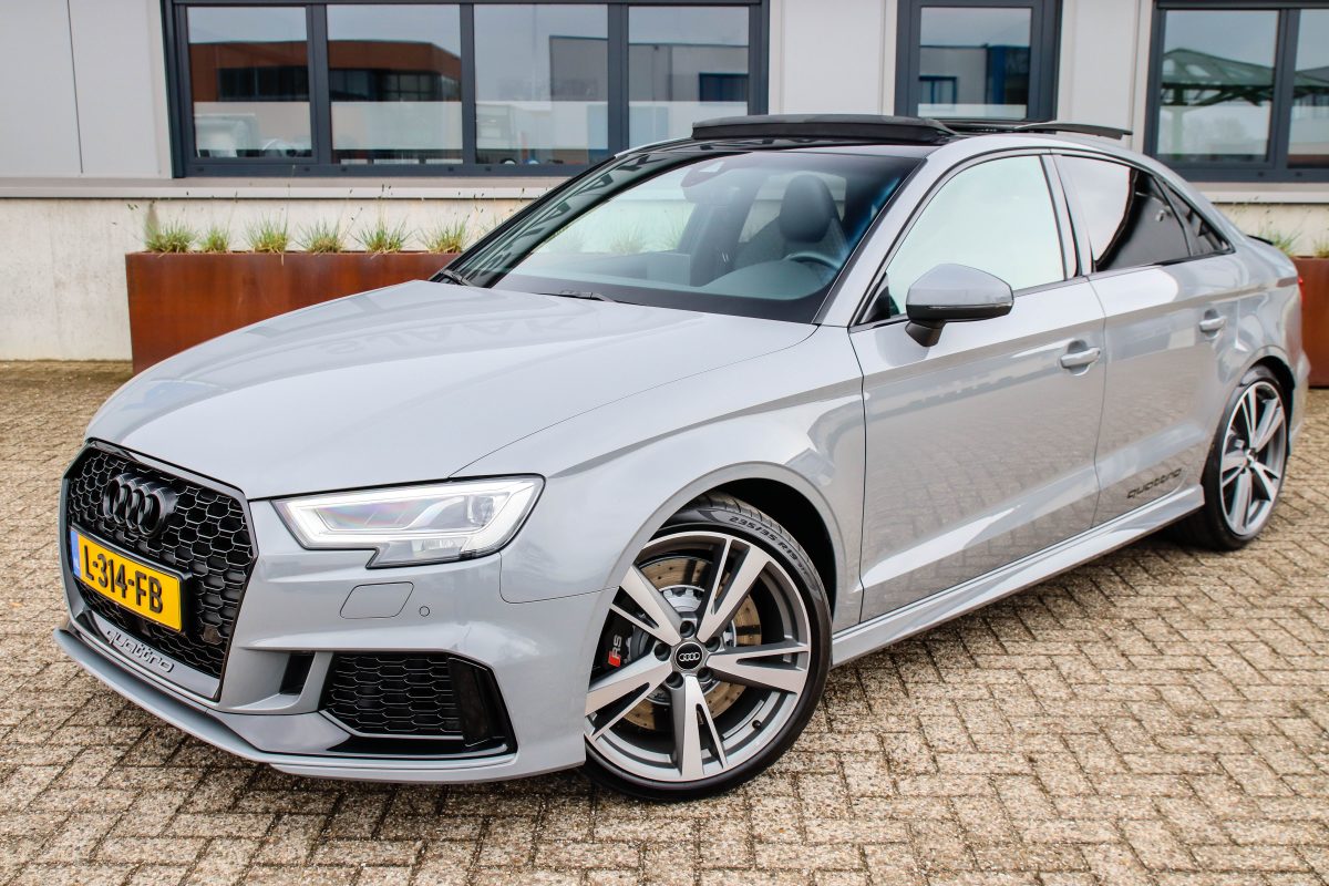 NIEUW MODEL | MODEL 2018 | FACELIFT! Een geweldig geconfigureerde en in smetteloze staat verkerende Audi RS3 Limousine 2.5 TFSI 5-cilinder 400pk S-Tronic automaat QUATTRO! Afkomstig van de 1e eigenaar, uiteraard volledig Audi dealer onderhouden inclusief bijbehorende documentatie met een gecontroleerde tellerstand van slechts 58.713km! Door QUATTRO GmbH voorzien van de juiste Audi Exclusive fabrieksconfiguratie. Maarliefst 400pk en 480Nm levert deze fenomenale 2.5 TFSI 5-cilinder turbomotor! Het sublieme Audi Quattro 4-wielaandrijving, het originele sportuitlaatsysteem biedt natuurlijk 100% garantie voor ongekende prestaties en bovenal een uniek 5-cilinder motorgeluid! Slechts 4,1 seconden zijn er nodig om deze RS naar de 100km/h te katapulteren. Het betreft een BTW-auto, dus voor zowel de zakelijke als particuliere klant interessant.