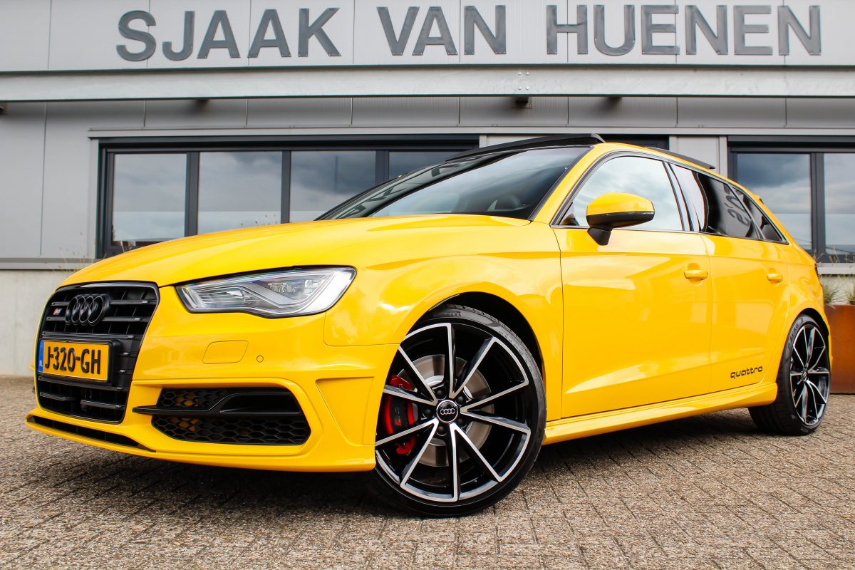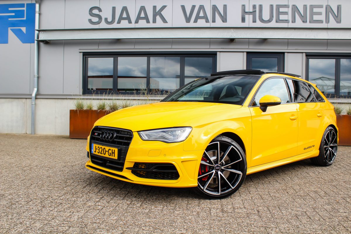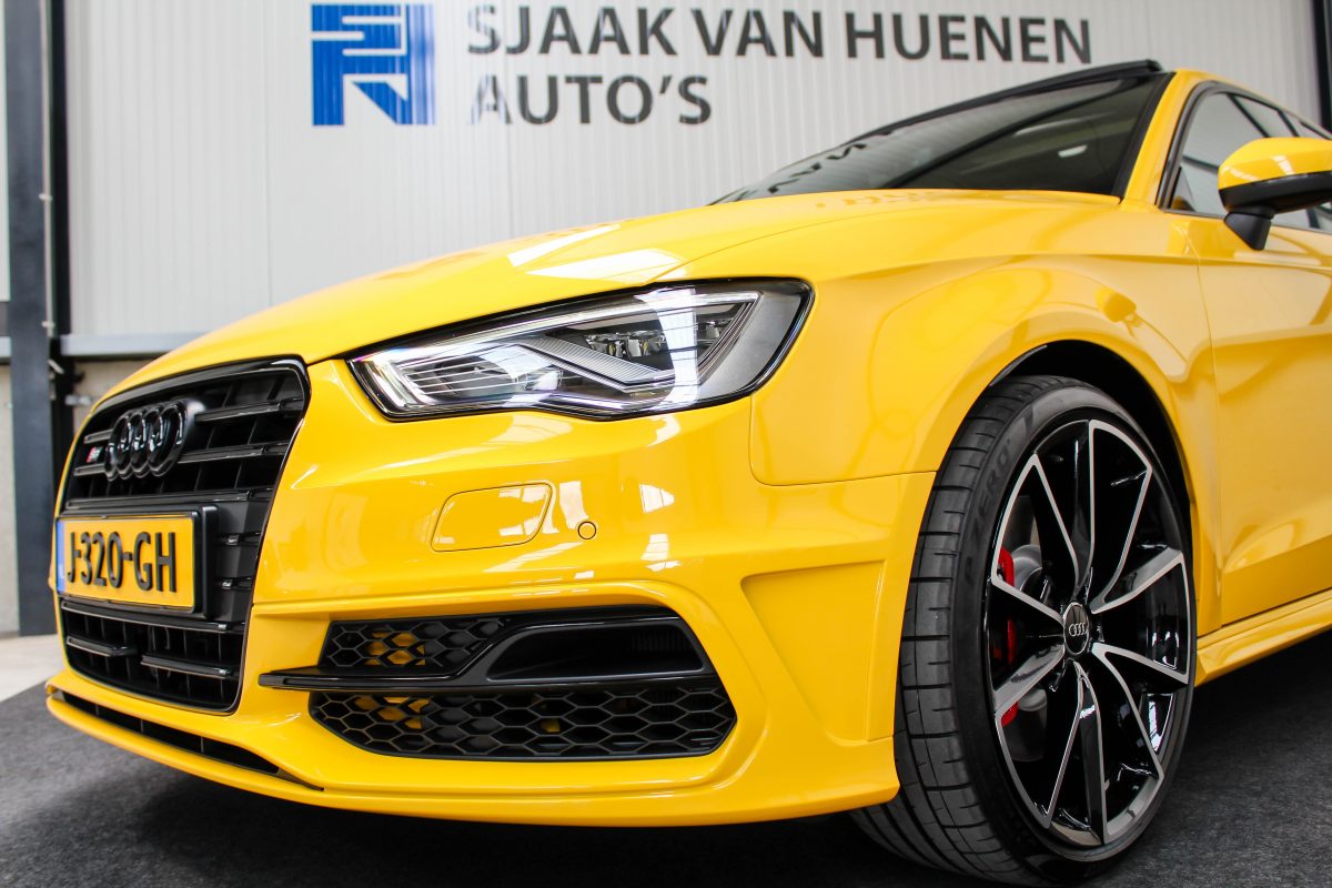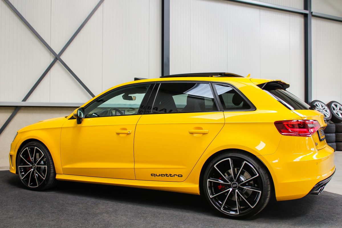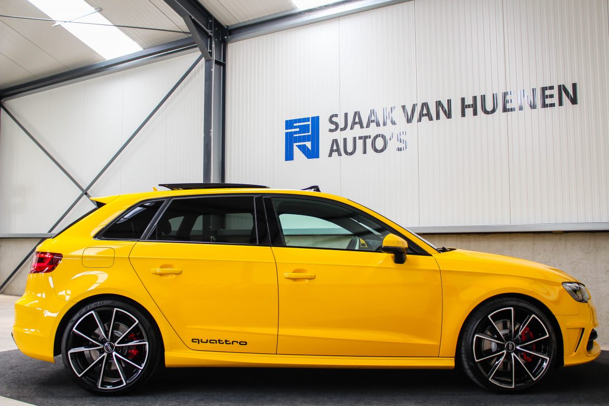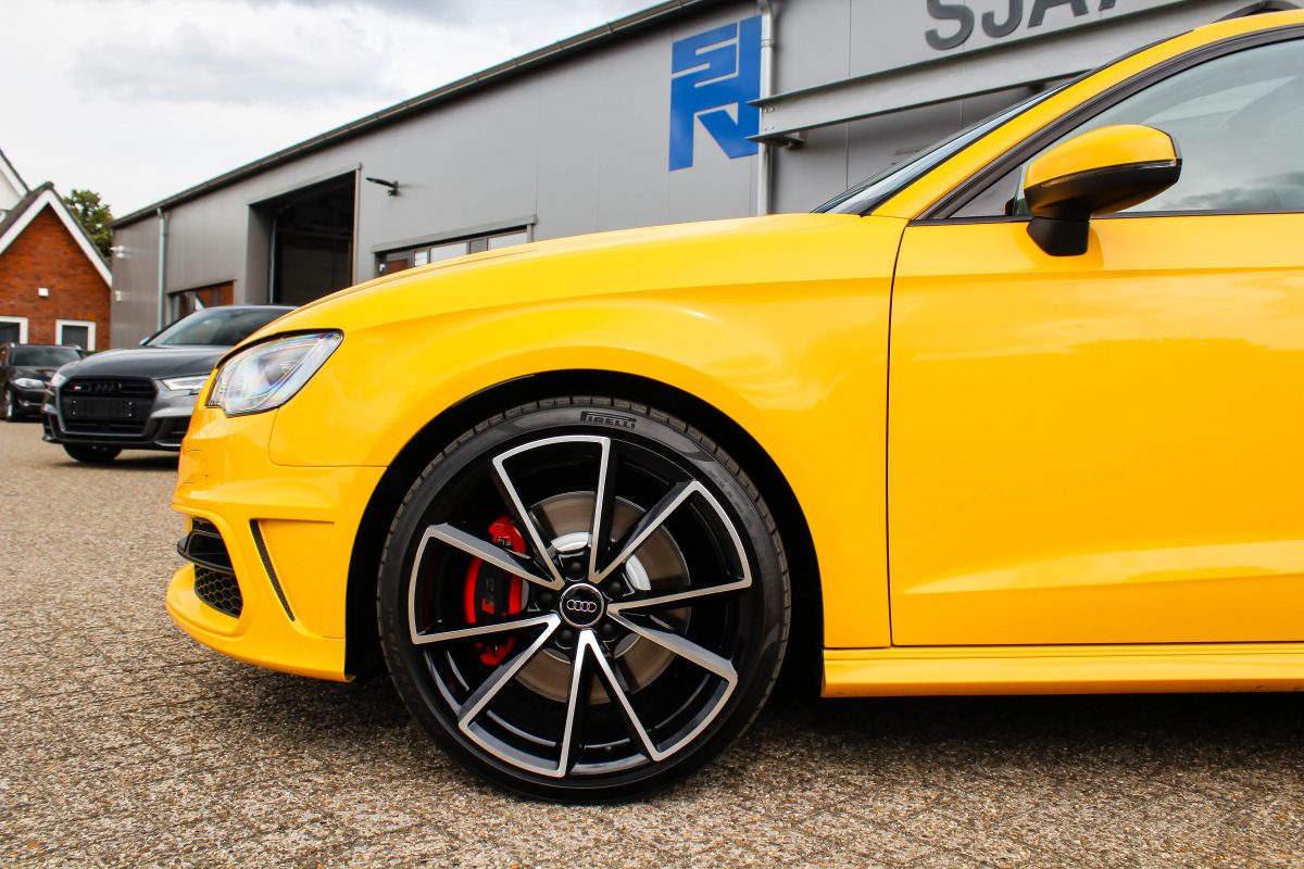 UNIEK! Een in nieuwstaat verkerende en exclusief uitgeruste Audi S3 Sportback 300pk 2.0TFSI S-Tronic automaat Quattro 5-Deurs! Een echt liefhebbers exemplaar, afkomstig van de 1e eigenaar en volledig Audi dealer onderhouden met een tellerstand van slechts 62.527 kilometer. Audi Exclusive exterieur Vegas Yellow gecombineerd met het glazen panoramadak en natuurlijk de Supersport Valcona lederen kuipstoelen met de witte cross stitching maken deze Hothatch tot een uniek exemplaar. De nieuwprijs van ruim €62.000,- vertegenwoordigd een Audi S3 die voorzien is van praktisch iedere fabrieksoptie! De getoonde 19inch Audi S3 velgenset met 4x nieuwe Pirelli PZERO zomerbanden is tegen geringe meerprijs van €995,- te verkrijgen.