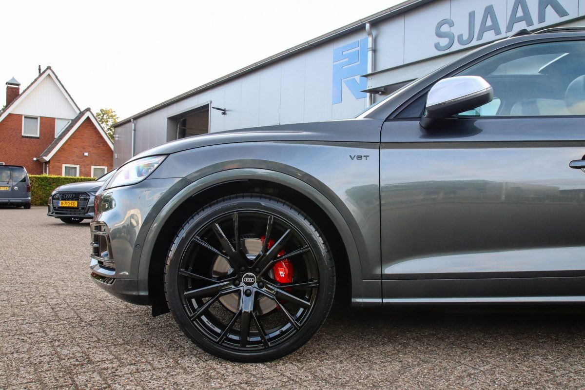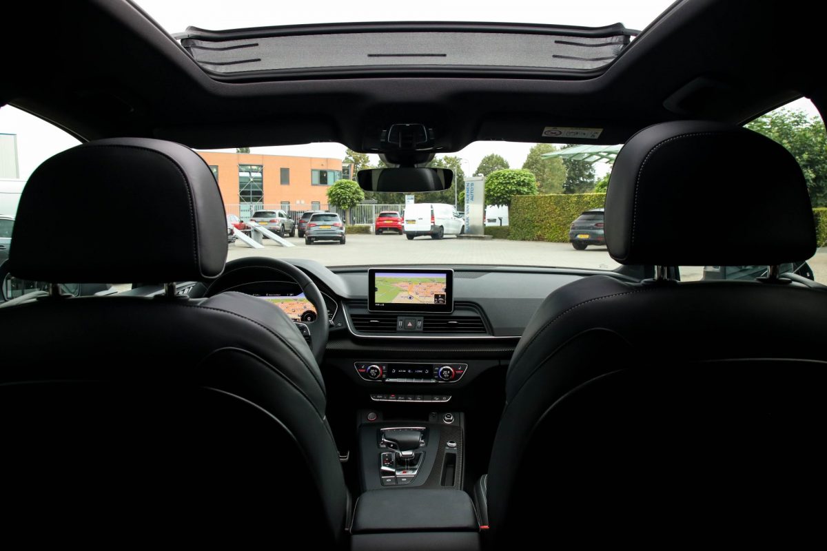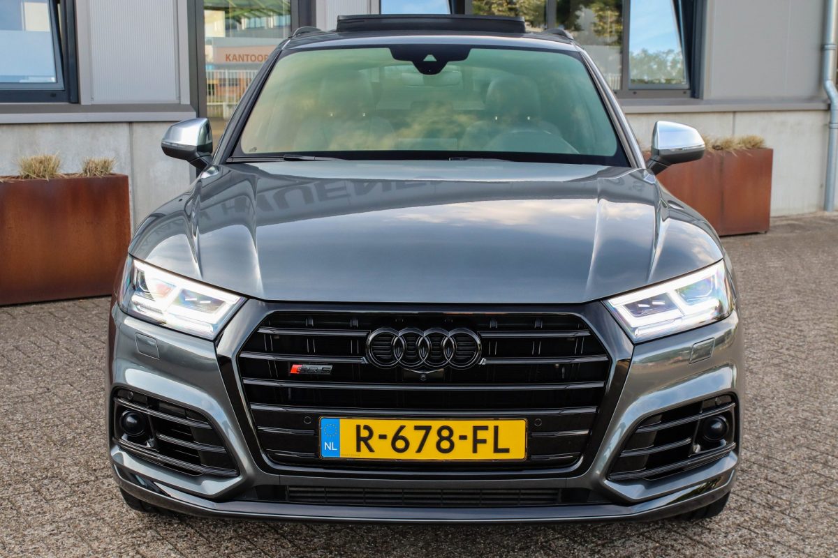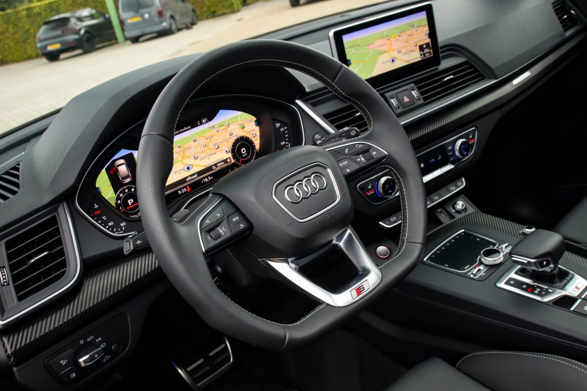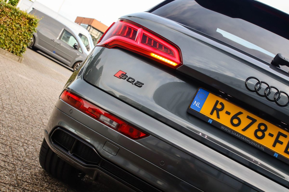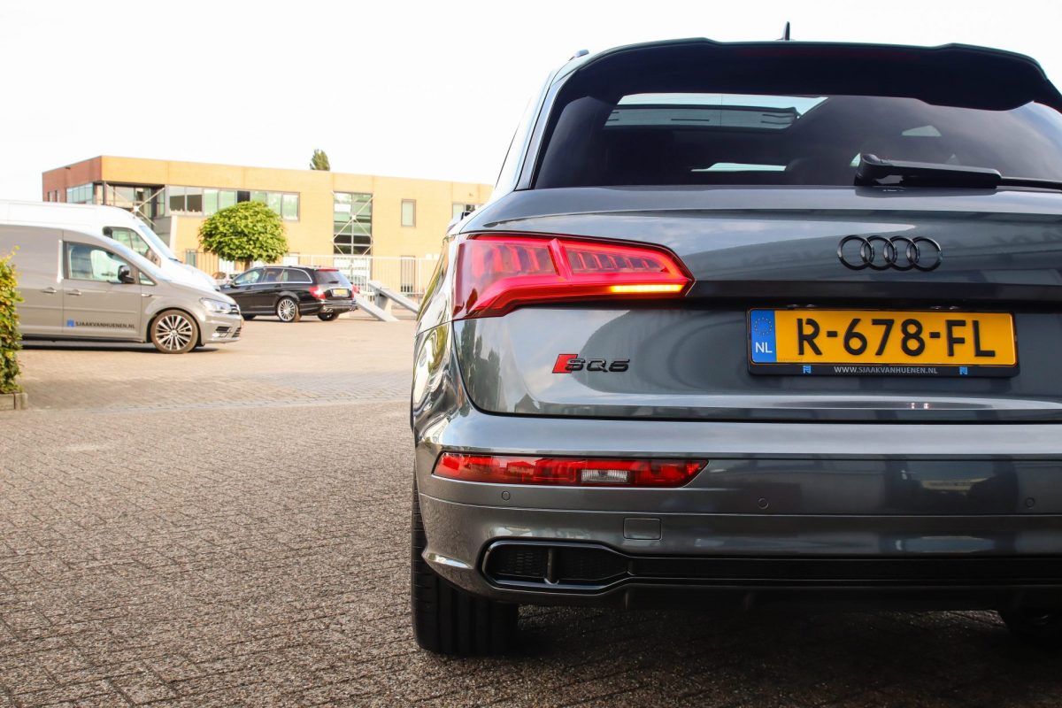 NIEUW MODEL | MODEL 2018! Een werkelijk in uitmuntende staat verkerende Audi SQ5 SUV 3.0 TFSI QUATTRO 260kw/354pk 6-cilinder automaat! Afkomstig van de 1e eigenaar, volledig Audi dealer onderhouden inclusief bijbehorende documentatie. Uiteraard met een transparante en schadevrije historie en een gecontroleerde tellerstand van slechts 51.445 kilometer. Een prachtig sportieve SUV die is voorzien van de krachtige en fantastisch klinkende 3.0 v6 benzine turbomotor die maarliefst 354pk en 500Nm levert. De prestaties liegen er ook niet om, er is slechts 5,4 seconden nodig om vanuit stilstand de 100 km/h te bereiken, waarbij de acceleratie pas stopt bij 250 km/h! Deze SQ5 heeft de juiste uitstraling, mede door zijn geweldige Daytona Grey parellak, het zwart optiekpakket en natuurlijk zijn uiterst royale fabrieksoptielijst. De nieuwprijs van bijna €120.000,- geeft goed aan om welk uitrustingsniveau het gaat. De getoonde 22inch Black Performance velgenset met 4x Hankook Ventus S1 EVO3 SUV zomerbanden is tegen geringe meerprijs van €2595,- te verkrijgen.