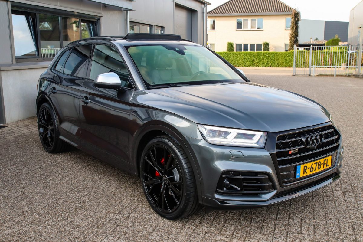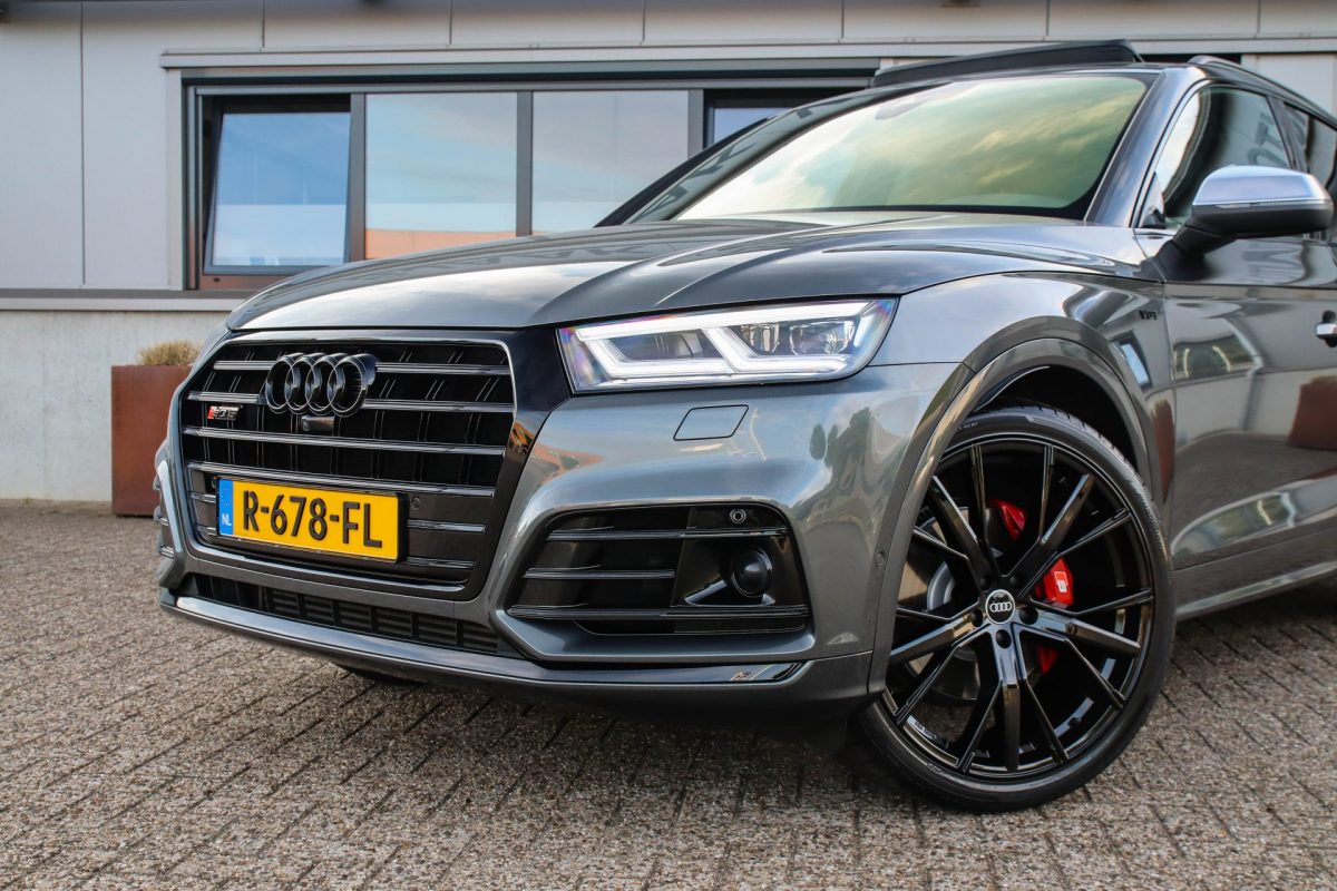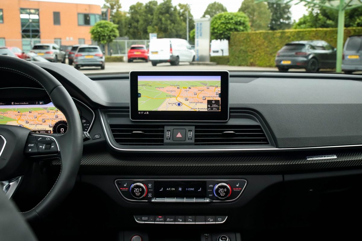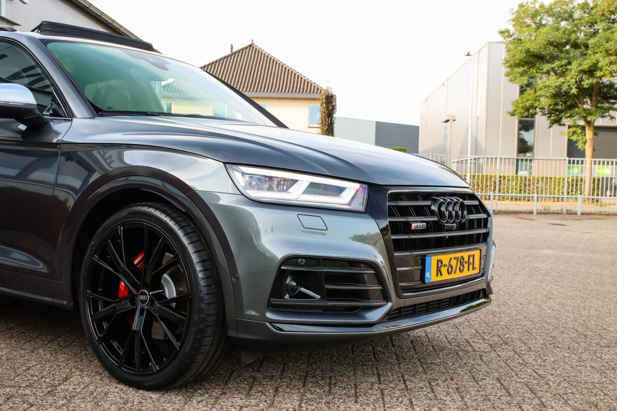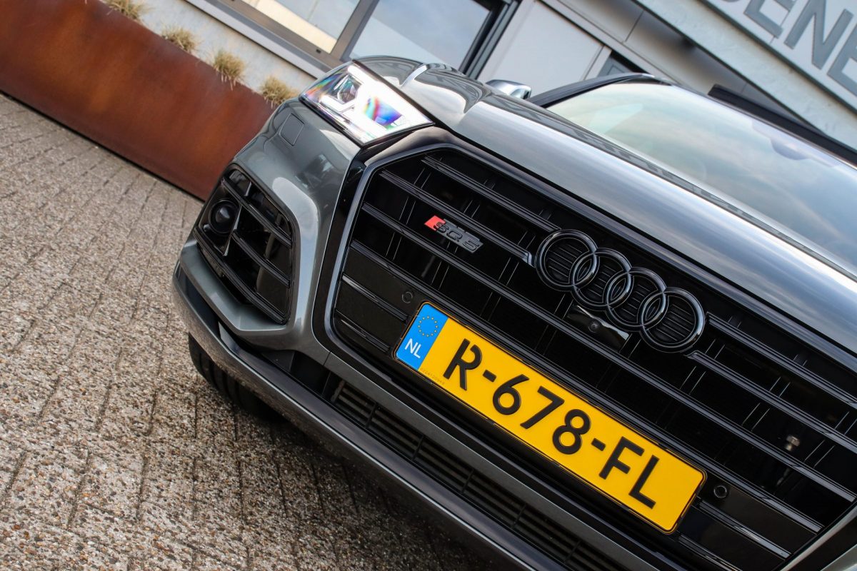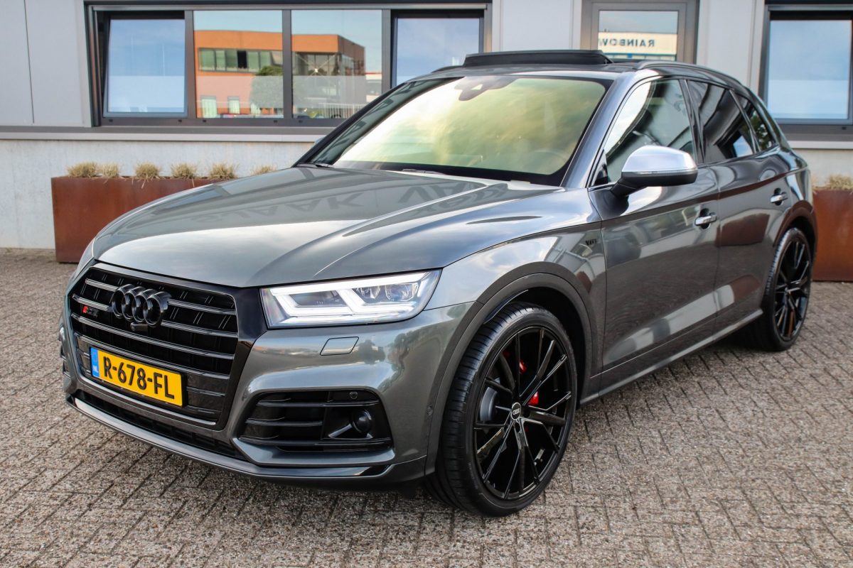 NIEUW MODEL | MODEL 2018! Een werkelijk in uitmuntende staat verkerende Audi SQ5 SUV 3.0 TFSI QUATTRO 260kw/354pk 6-cilinder automaat! Afkomstig van de 1e eigenaar, volledig Audi dealer onderhouden inclusief bijbehorende documentatie. Uiteraard met een transparante en schadevrije historie en een gecontroleerde tellerstand van slechts 51.445 kilometer. Een prachtig sportieve SUV die is voorzien van de krachtige en fantastisch klinkende 3.0 v6 benzine turbomotor die maarliefst 354pk en 500Nm levert. De prestaties liegen er ook niet om, er is slechts 5,4 seconden nodig om vanuit stilstand de 100 km/h te bereiken, waarbij de acceleratie pas stopt bij 250 km/h! Deze SQ5 heeft de juiste uitstraling, mede door zijn geweldige Daytona Grey parellak, het zwart optiekpakket en natuurlijk zijn uiterst royale fabrieksoptielijst. De nieuwprijs van bijna €120.000,- geeft goed aan om welk uitrustingsniveau het gaat. De getoonde 22inch Black Performance velgenset met 4x Hankook Ventus S1 EVO3 SUV zomerbanden is tegen geringe meerprijs van €2595,- te verkrijgen.