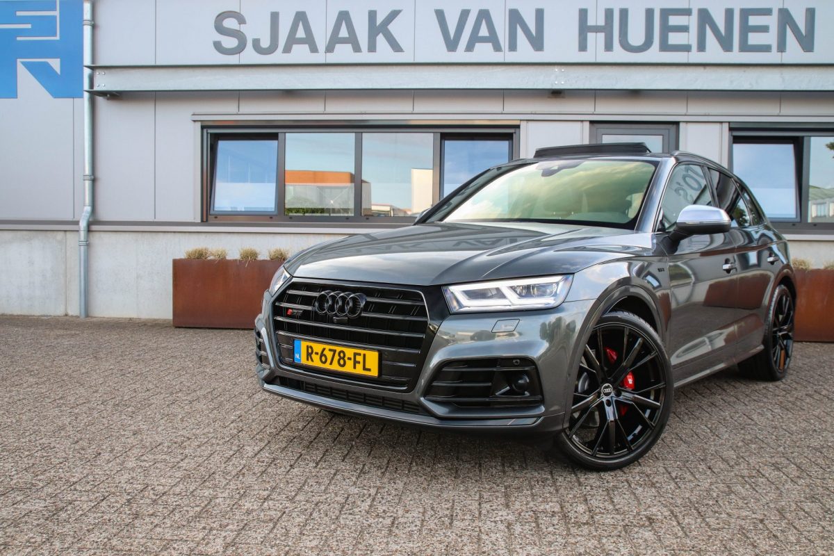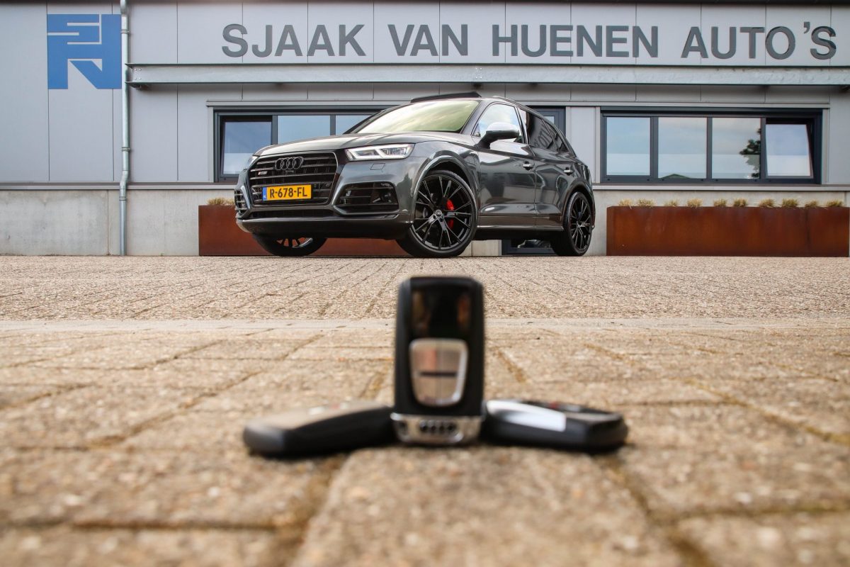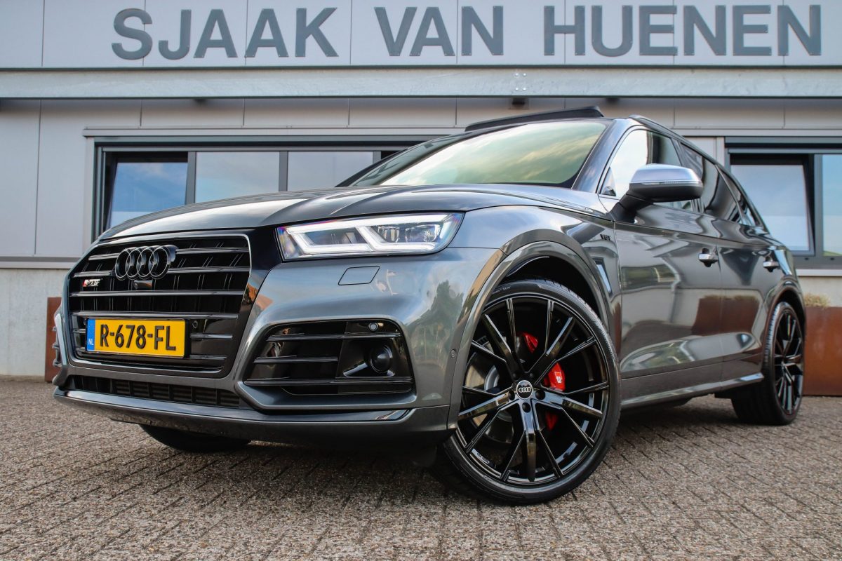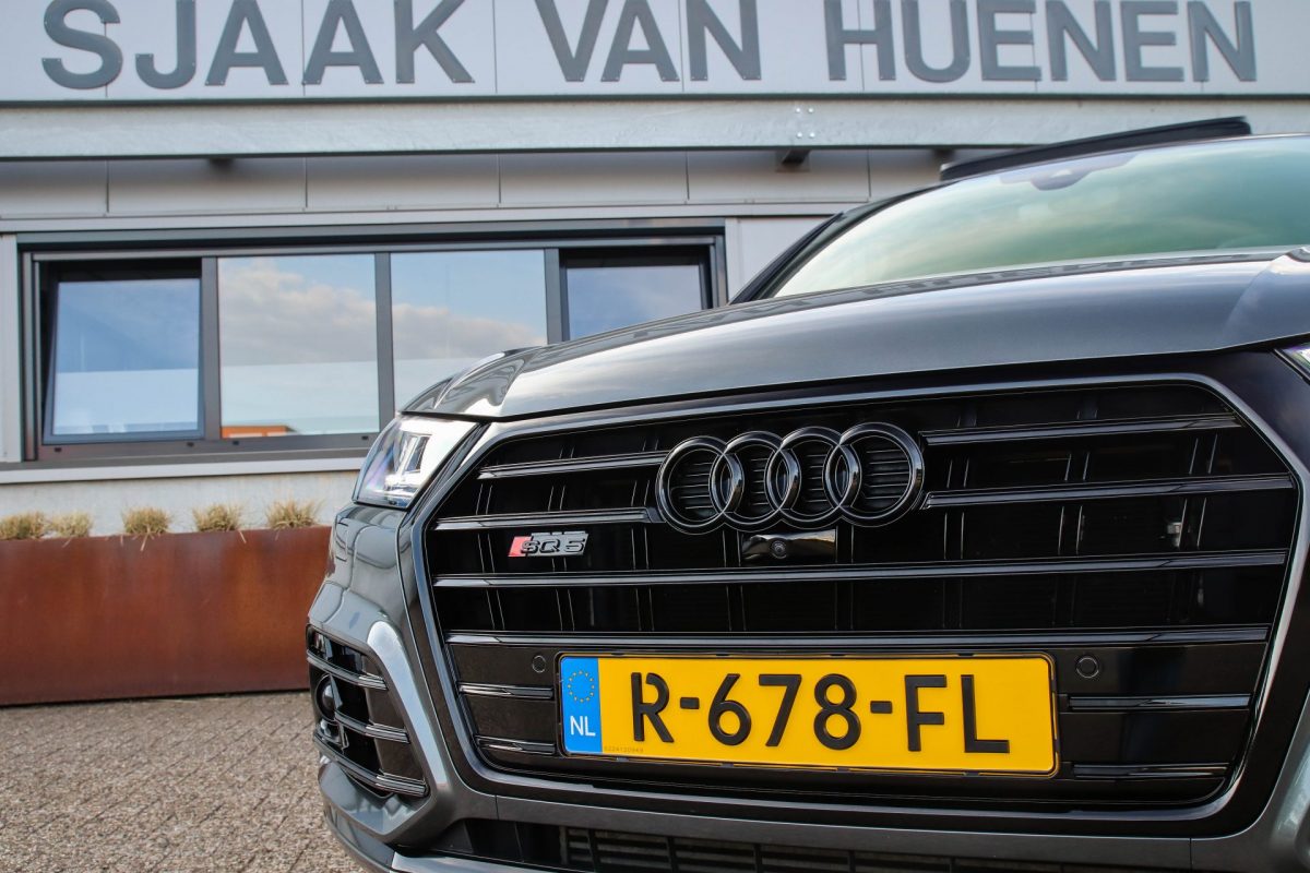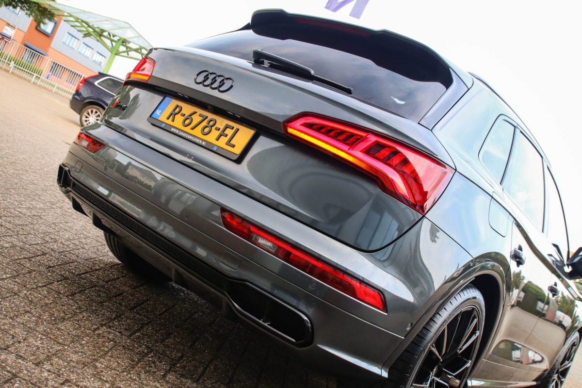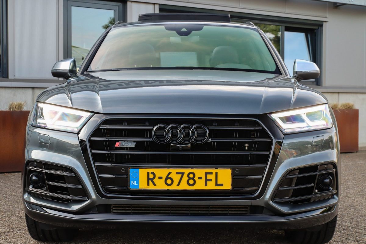 NIEUW MODEL | MODEL 2018! Een werkelijk in uitmuntende staat verkerende Audi SQ5 SUV 3.0 TFSI QUATTRO 260kw/354pk 6-cilinder automaat! Afkomstig van de 1e eigenaar, volledig Audi dealer onderhouden inclusief bijbehorende documentatie. Uiteraard met een transparante en schadevrije historie en een gecontroleerde tellerstand van slechts 51.445 kilometer. Een prachtig sportieve SUV die is voorzien van de krachtige en fantastisch klinkende 3.0 v6 benzine turbomotor die maarliefst 354pk en 500Nm levert. De prestaties liegen er ook niet om, er is slechts 5,4 seconden nodig om vanuit stilstand de 100 km/h te bereiken, waarbij de acceleratie pas stopt bij 250 km/h! Deze SQ5 heeft de juiste uitstraling, mede door zijn geweldige Daytona Grey parellak, het zwart optiekpakket en natuurlijk zijn uiterst royale fabrieksoptielijst. De nieuwprijs van bijna €120.000,- geeft goed aan om welk uitrustingsniveau het gaat. De getoonde 22inch Black Performance velgenset met 4x Hankook Ventus S1 EVO3 SUV zomerbanden is tegen geringe meerprijs van €2595,- te verkrijgen.