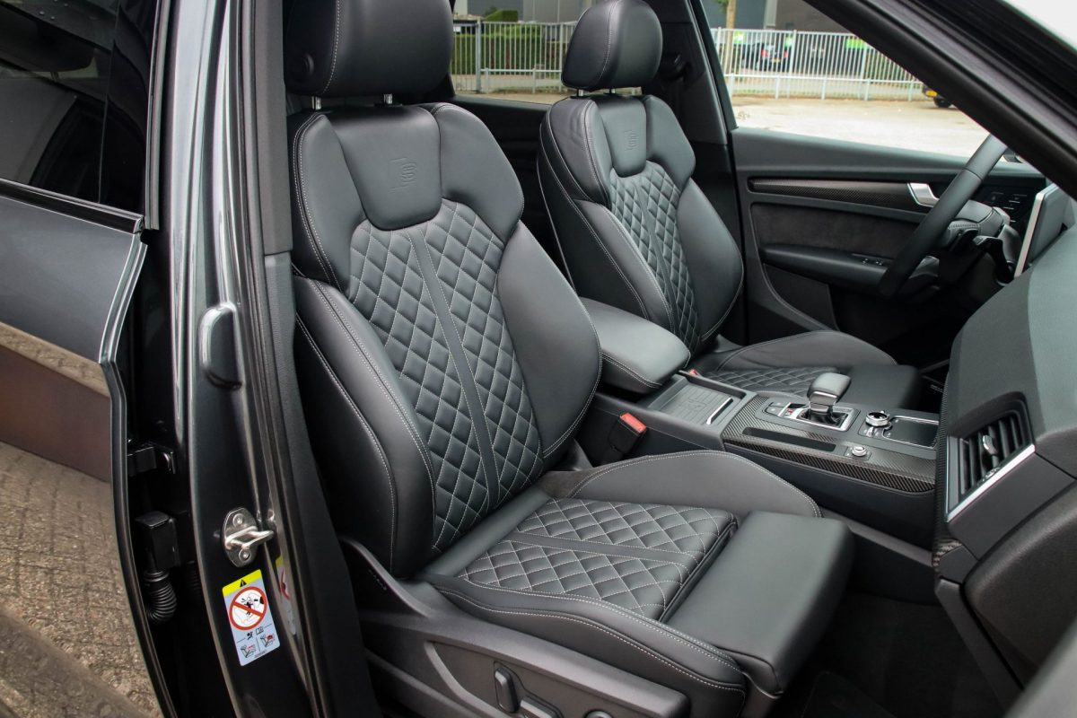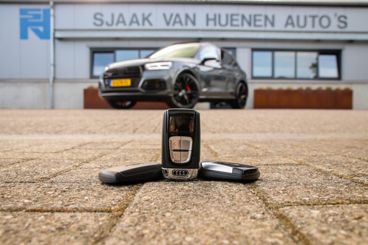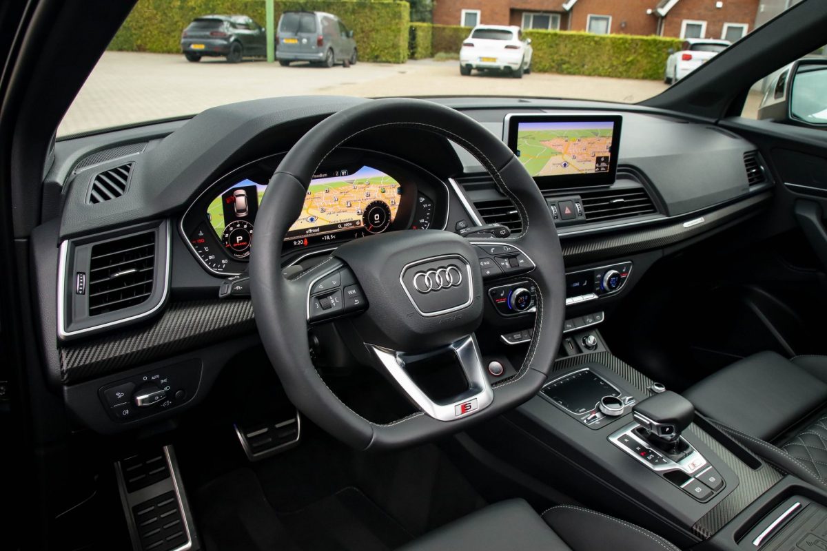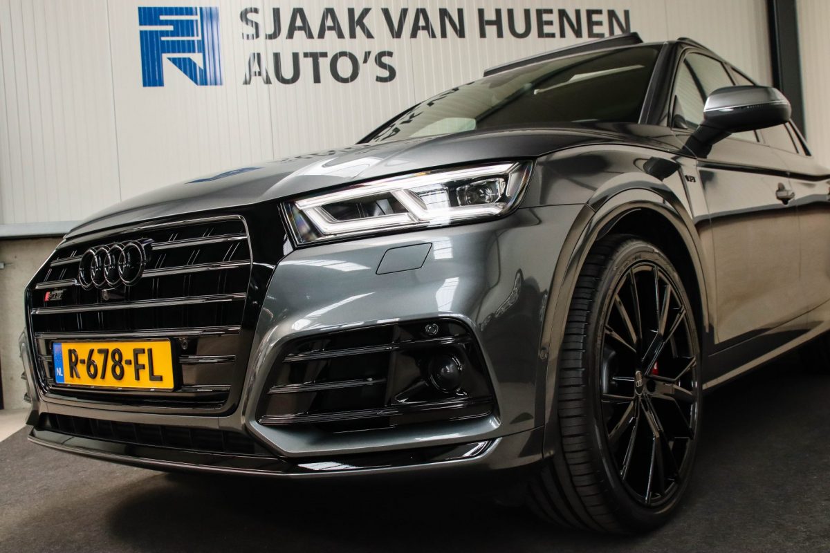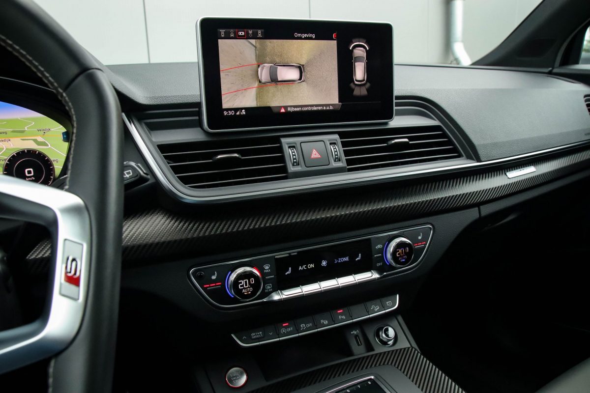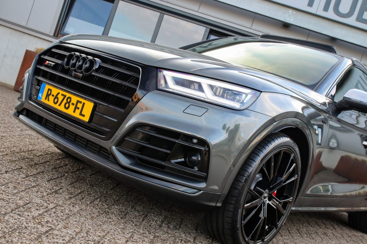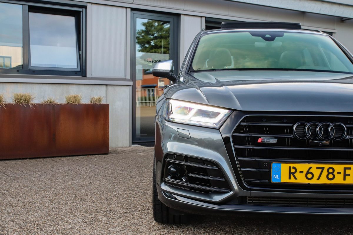 NIEUW MODEL | MODEL 2018! Een werkelijk in uitmuntende staat verkerende Audi SQ5 SUV 3.0 TFSI QUATTRO 260kw/354pk 6-cilinder automaat! Afkomstig van de 1e eigenaar, volledig Audi dealer onderhouden inclusief bijbehorende documentatie. Uiteraard met een transparante en schadevrije historie en een gecontroleerde tellerstand van slechts 51.445 kilometer. Een prachtig sportieve SUV die is voorzien van de krachtige en fantastisch klinkende 3.0 v6 benzine turbomotor die maarliefst 354pk en 500Nm levert. De prestaties liegen er ook niet om, er is slechts 5,4 seconden nodig om vanuit stilstand de 100 km/h te bereiken, waarbij de acceleratie pas stopt bij 250 km/h! Deze SQ5 heeft de juiste uitstraling, mede door zijn geweldige Daytona Grey parellak, het zwart optiekpakket en natuurlijk zijn uiterst royale fabrieksoptielijst. De nieuwprijs van bijna €120.000,- geeft goed aan om welk uitrustingsniveau het gaat. De getoonde 22inch Black Performance velgenset met 4x Hankook Ventus S1 EVO3 SUV zomerbanden is tegen geringe meerprijs van €2595,- te verkrijgen.