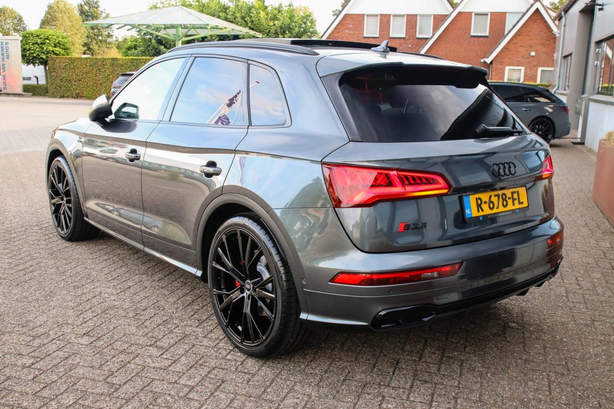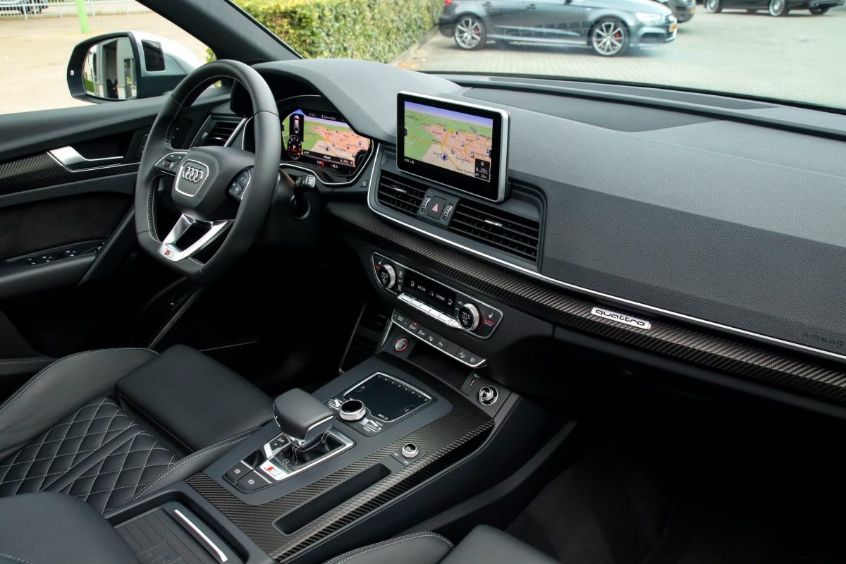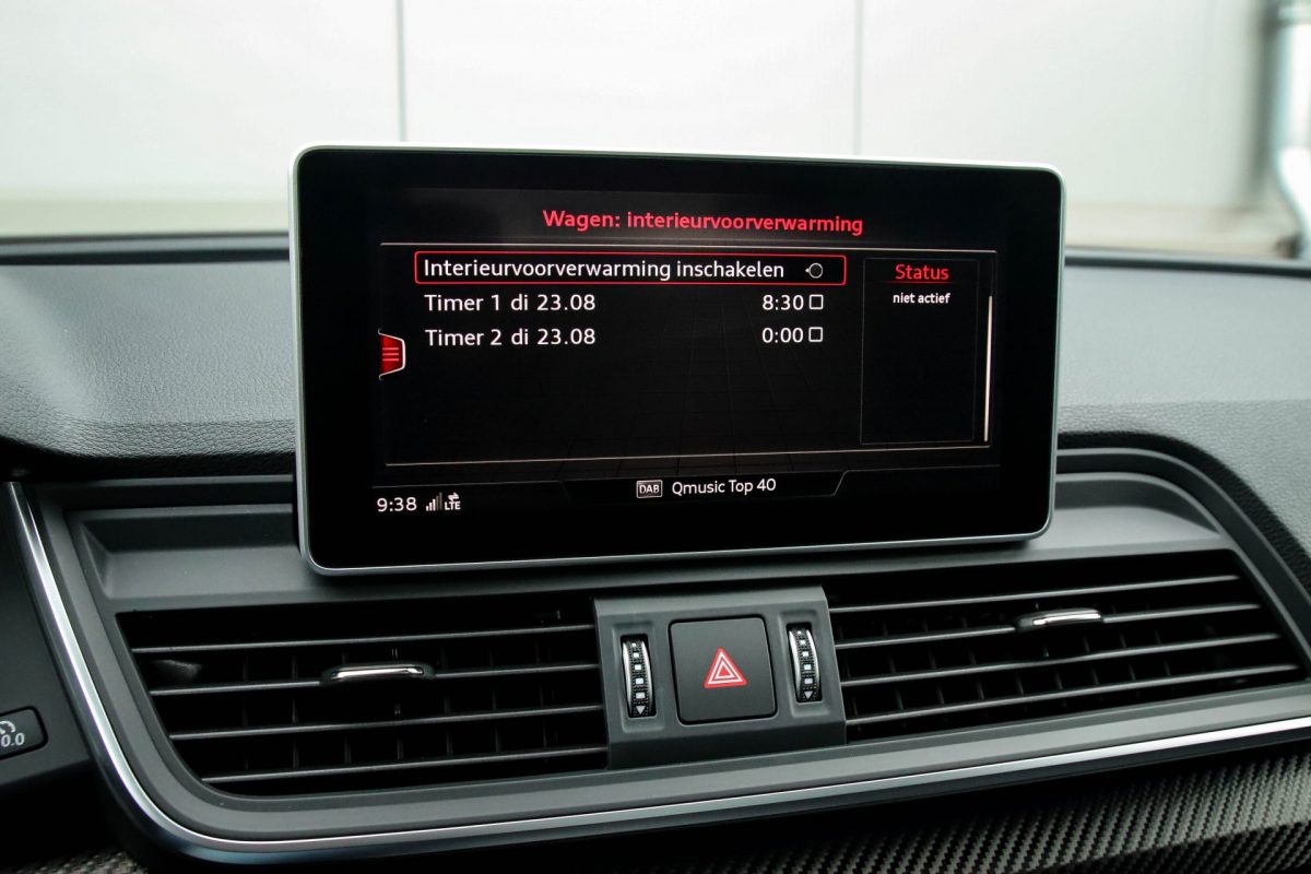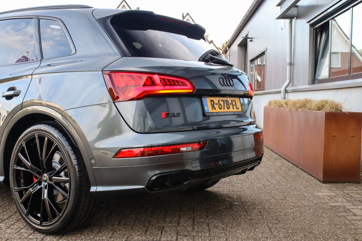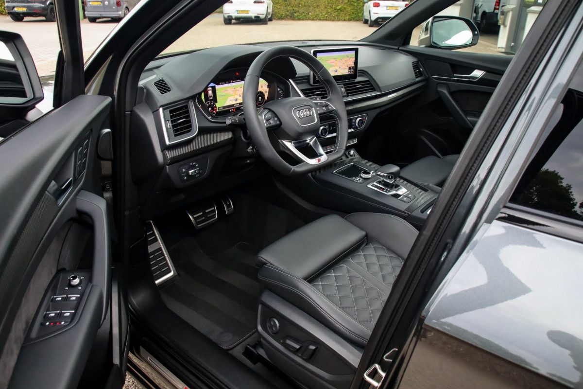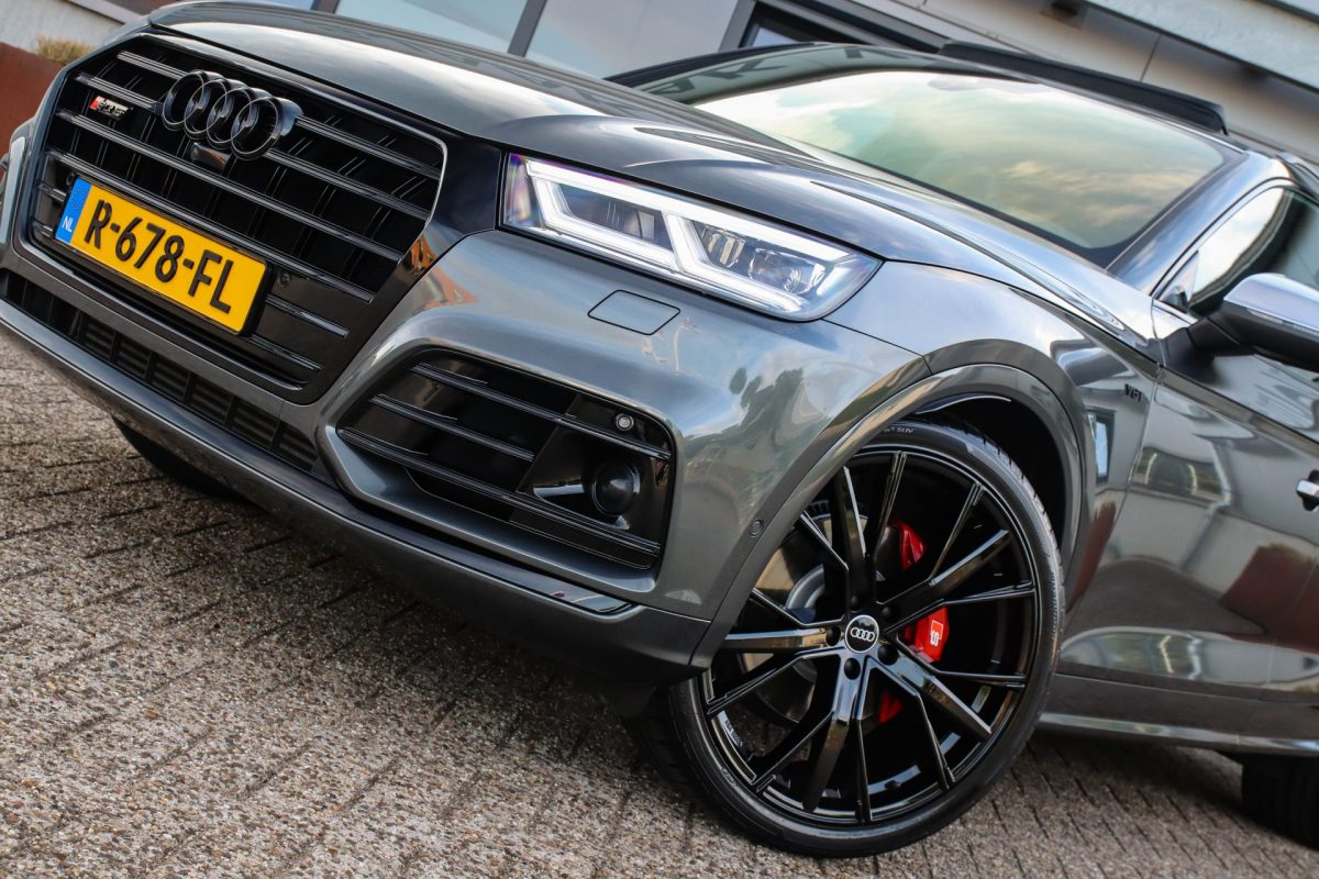 NIEUW MODEL | MODEL 2018! Een werkelijk in uitmuntende staat verkerende Audi SQ5 SUV 3.0 TFSI QUATTRO 260kw/354pk 6-cilinder automaat! Afkomstig van de 1e eigenaar, volledig Audi dealer onderhouden inclusief bijbehorende documentatie. Uiteraard met een transparante en schadevrije historie en een gecontroleerde tellerstand van slechts 51.445 kilometer. Een prachtig sportieve SUV die is voorzien van de krachtige en fantastisch klinkende 3.0 v6 benzine turbomotor die maarliefst 354pk en 500Nm levert. De prestaties liegen er ook niet om, er is slechts 5,4 seconden nodig om vanuit stilstand de 100 km/h te bereiken, waarbij de acceleratie pas stopt bij 250 km/h! Deze SQ5 heeft de juiste uitstraling, mede door zijn geweldige Daytona Grey parellak, het zwart optiekpakket en natuurlijk zijn uiterst royale fabrieksoptielijst. De nieuwprijs van bijna €120.000,- geeft goed aan om welk uitrustingsniveau het gaat. De getoonde 22inch Black Performance velgenset met 4x Hankook Ventus S1 EVO3 SUV zomerbanden is tegen geringe meerprijs van €2595,- te verkrijgen.