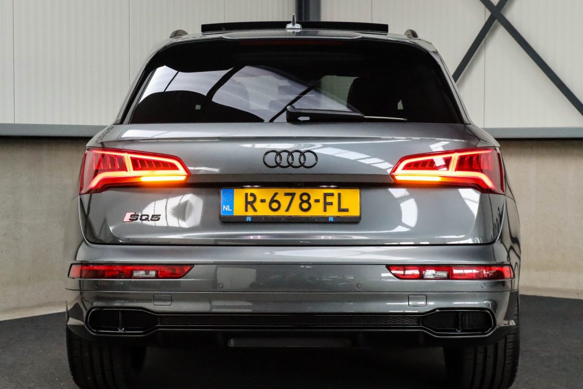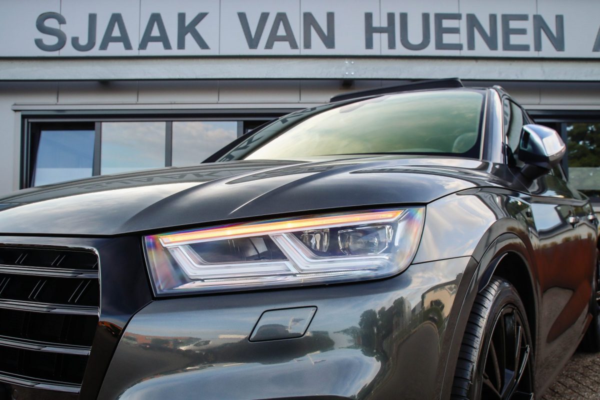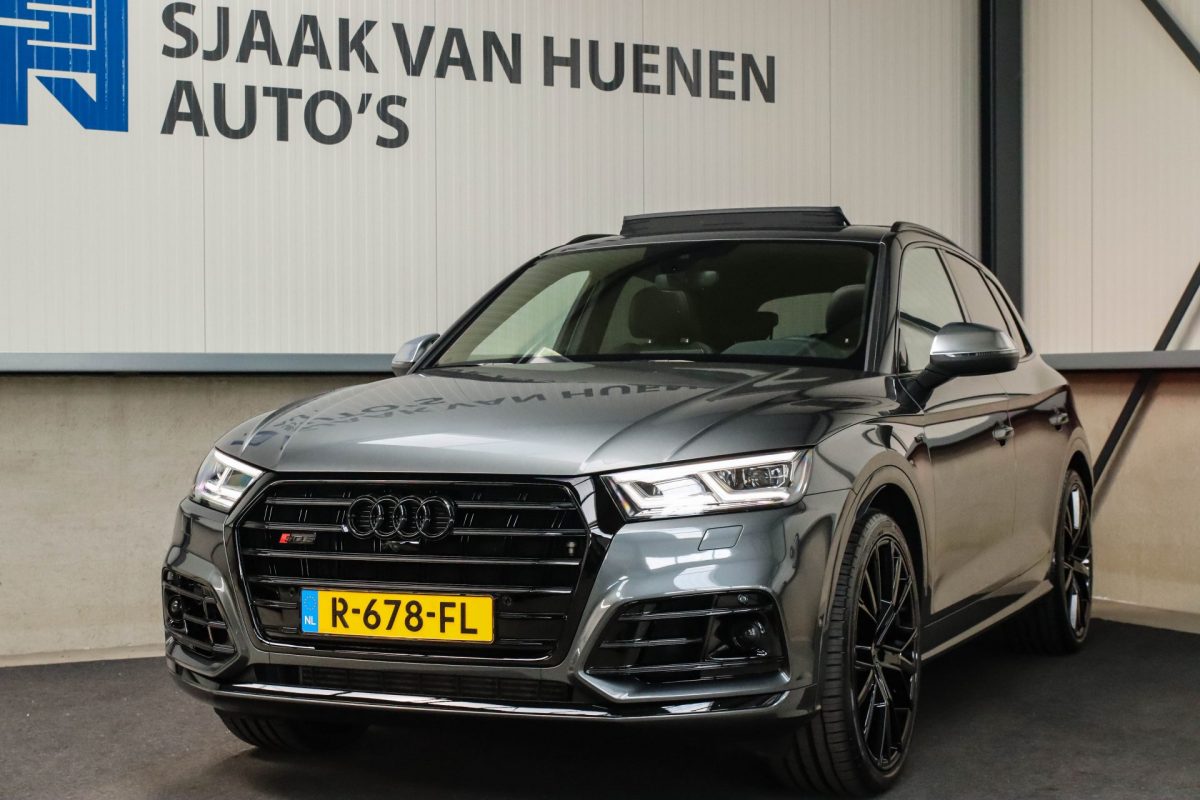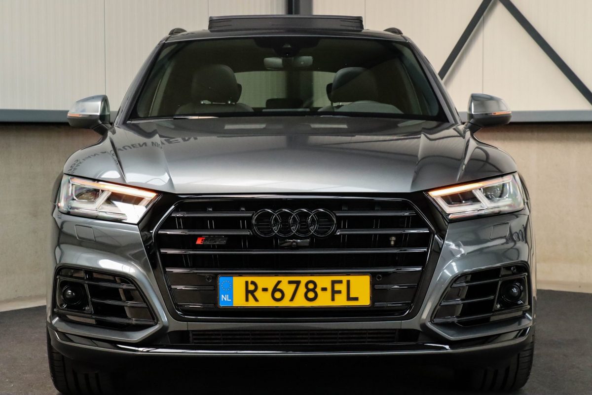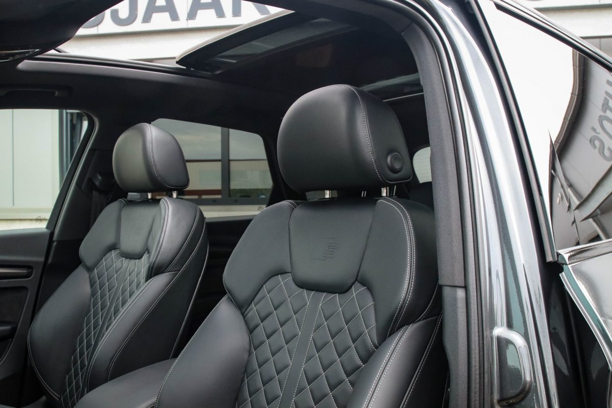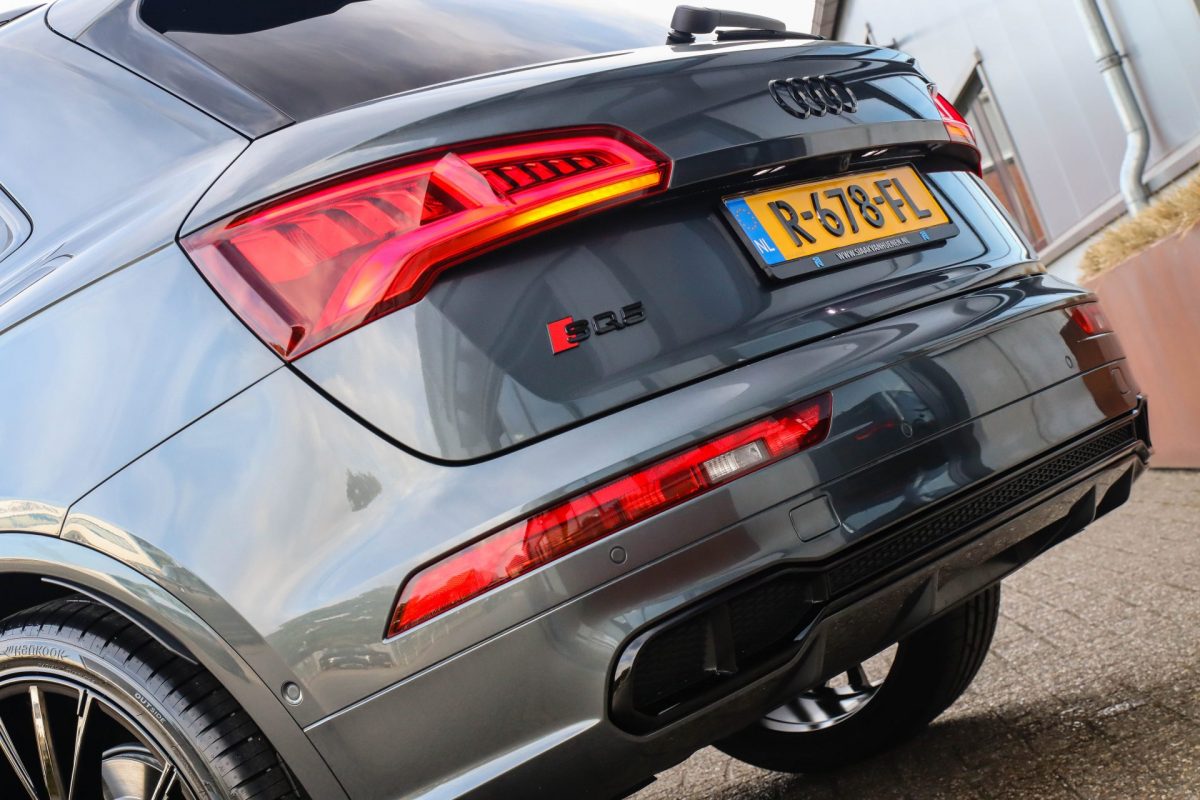 NIEUW MODEL | MODEL 2018! Een werkelijk in uitmuntende staat verkerende Audi SQ5 SUV 3.0 TFSI QUATTRO 260kw/354pk 6-cilinder automaat! Afkomstig van de 1e eigenaar, volledig Audi dealer onderhouden inclusief bijbehorende documentatie. Uiteraard met een transparante en schadevrije historie en een gecontroleerde tellerstand van slechts 51.445 kilometer. Een prachtig sportieve SUV die is voorzien van de krachtige en fantastisch klinkende 3.0 v6 benzine turbomotor die maarliefst 354pk en 500Nm levert. De prestaties liegen er ook niet om, er is slechts 5,4 seconden nodig om vanuit stilstand de 100 km/h te bereiken, waarbij de acceleratie pas stopt bij 250 km/h! Deze SQ5 heeft de juiste uitstraling, mede door zijn geweldige Daytona Grey parellak, het zwart optiekpakket en natuurlijk zijn uiterst royale fabrieksoptielijst. De nieuwprijs van bijna €120.000,- geeft goed aan om welk uitrustingsniveau het gaat. De getoonde 22inch Black Performance velgenset met 4x Hankook Ventus S1 EVO3 SUV zomerbanden is tegen geringe meerprijs van €2595,- te verkrijgen.