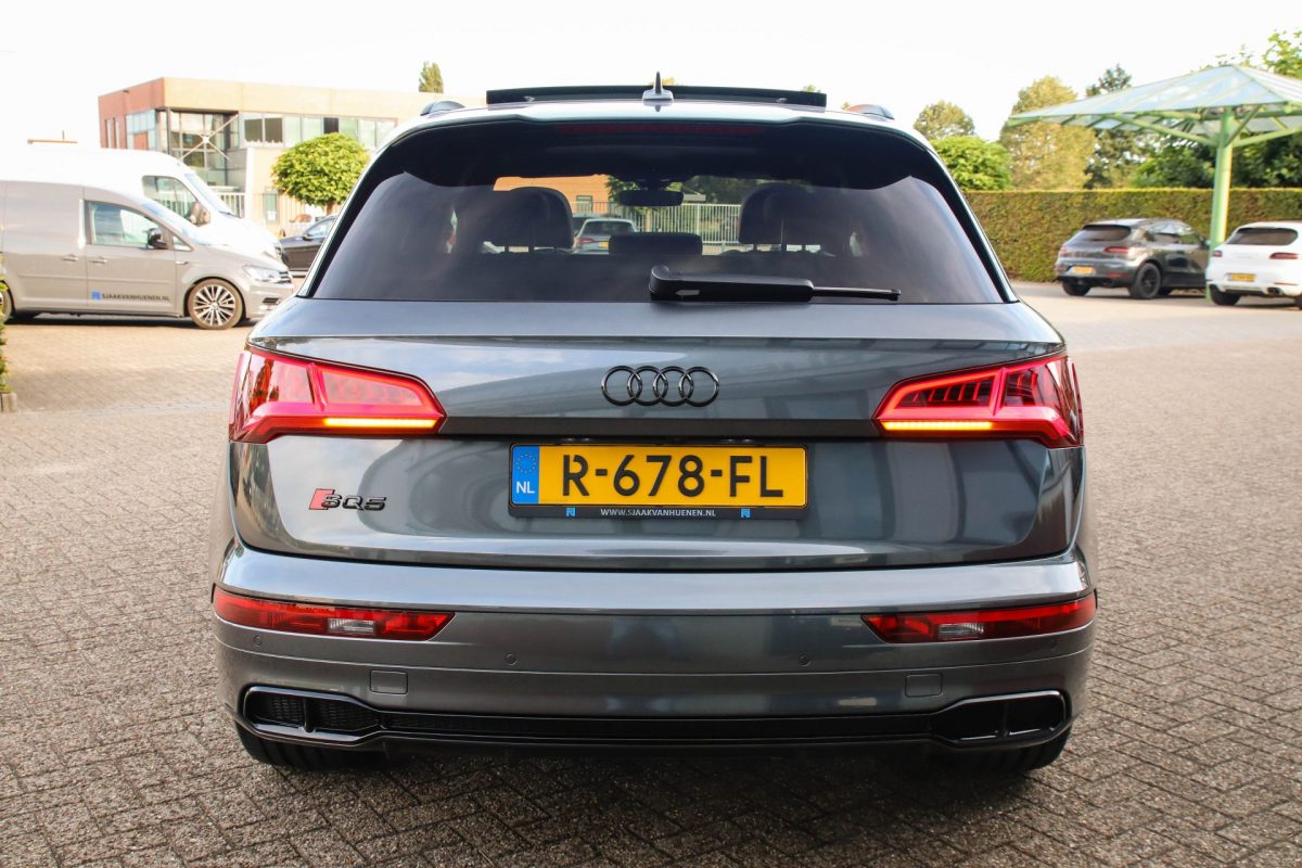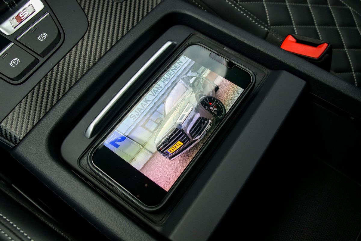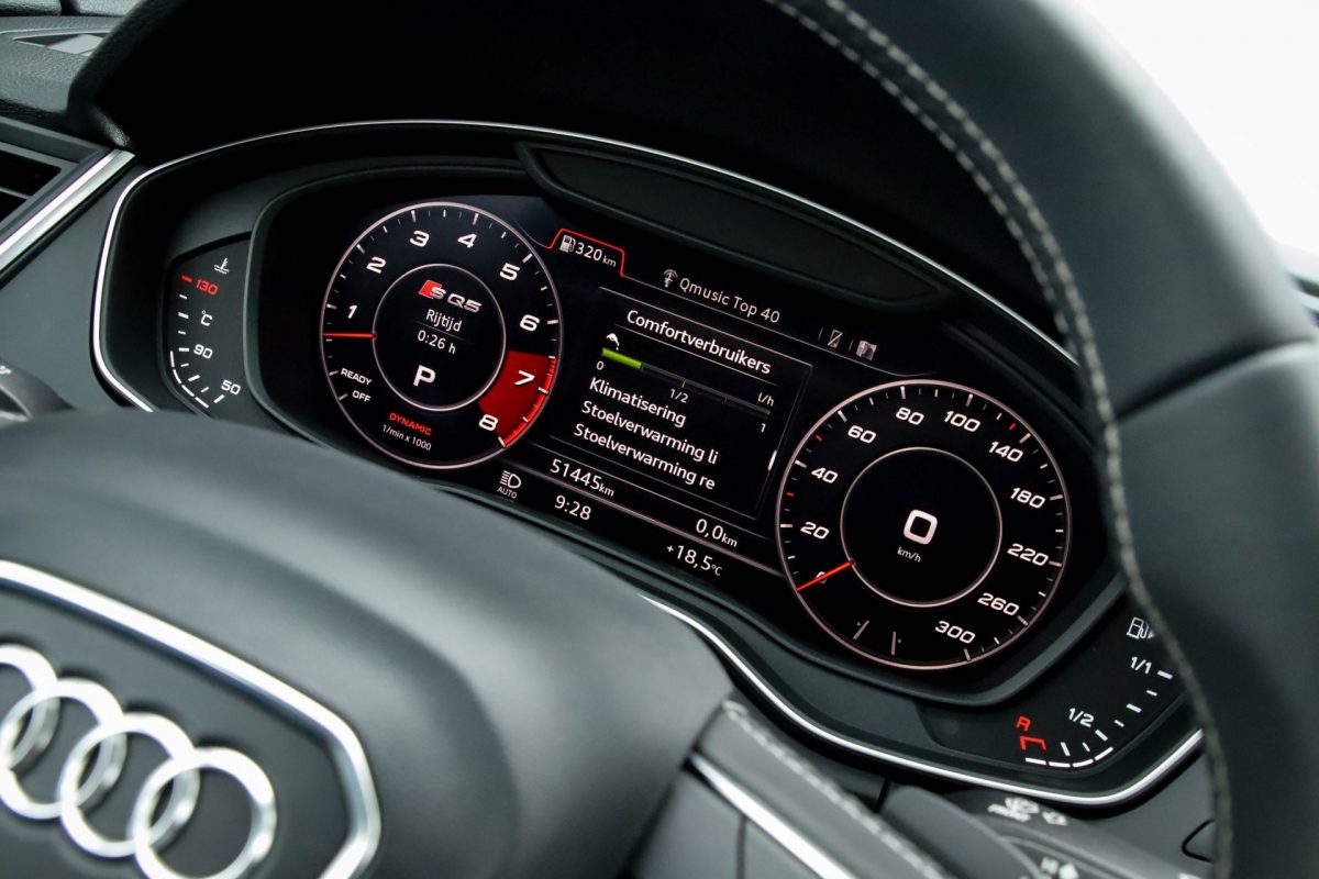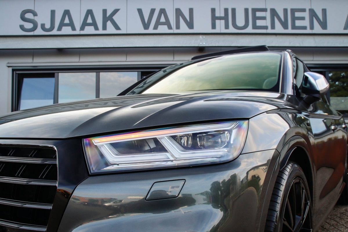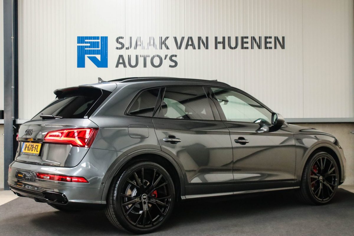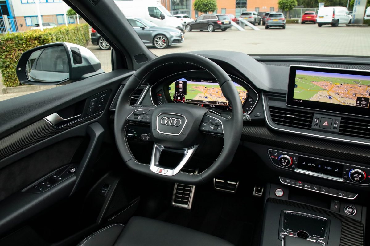 NIEUW MODEL | MODEL 2018! Een werkelijk in uitmuntende staat verkerende Audi SQ5 SUV 3.0 TFSI QUATTRO 260kw/354pk 6-cilinder automaat! Afkomstig van de 1e eigenaar, volledig Audi dealer onderhouden inclusief bijbehorende documentatie. Uiteraard met een transparante en schadevrije historie en een gecontroleerde tellerstand van slechts 51.445 kilometer. Een prachtig sportieve SUV die is voorzien van de krachtige en fantastisch klinkende 3.0 v6 benzine turbomotor die maarliefst 354pk en 500Nm levert. De prestaties liegen er ook niet om, er is slechts 5,4 seconden nodig om vanuit stilstand de 100 km/h te bereiken, waarbij de acceleratie pas stopt bij 250 km/h! Deze SQ5 heeft de juiste uitstraling, mede door zijn geweldige Daytona Grey parellak, het zwart optiekpakket en natuurlijk zijn uiterst royale fabrieksoptielijst. De nieuwprijs van bijna €120.000,- geeft goed aan om welk uitrustingsniveau het gaat. De getoonde 22inch Black Performance velgenset met 4x Hankook Ventus S1 EVO3 SUV zomerbanden is tegen geringe meerprijs van €2595,- te verkrijgen.