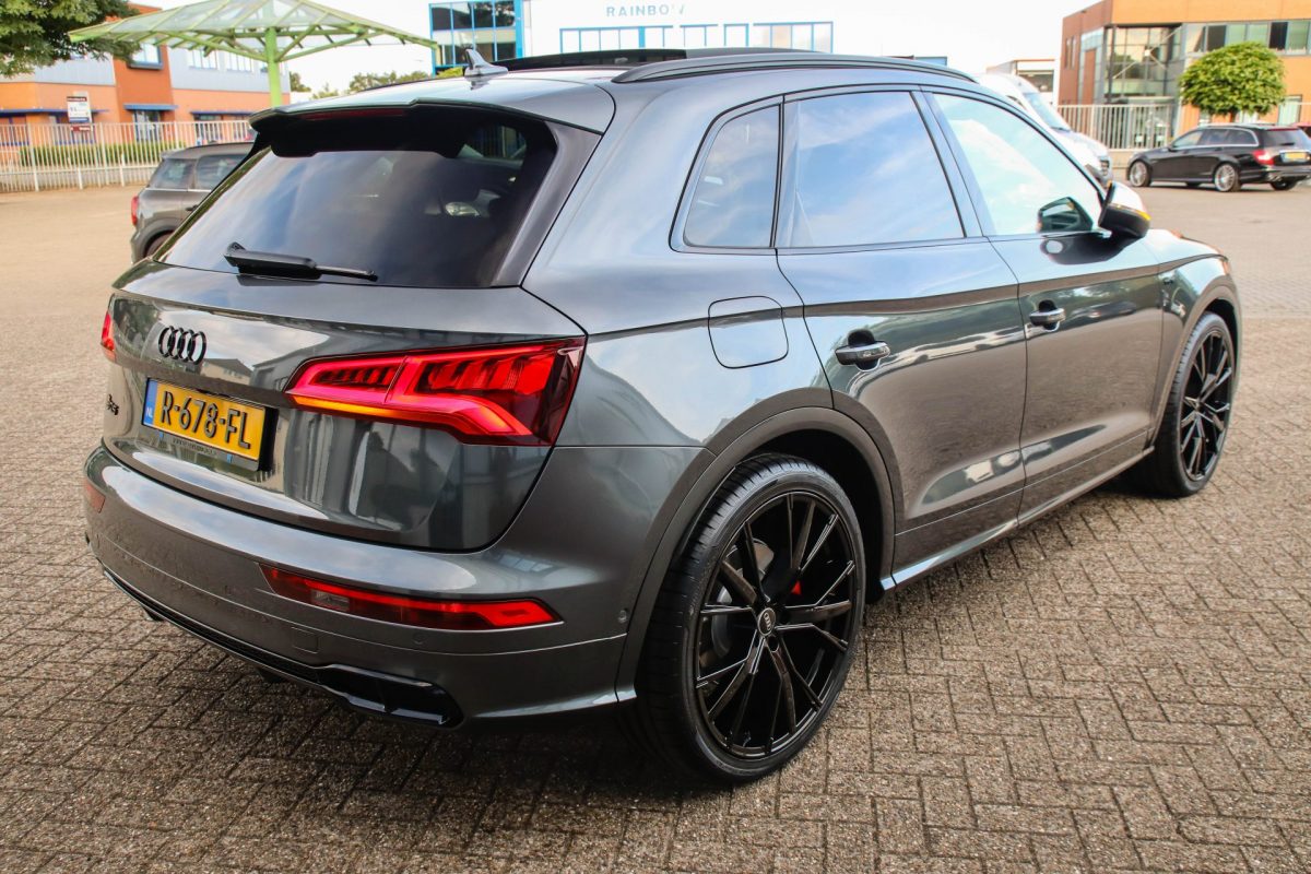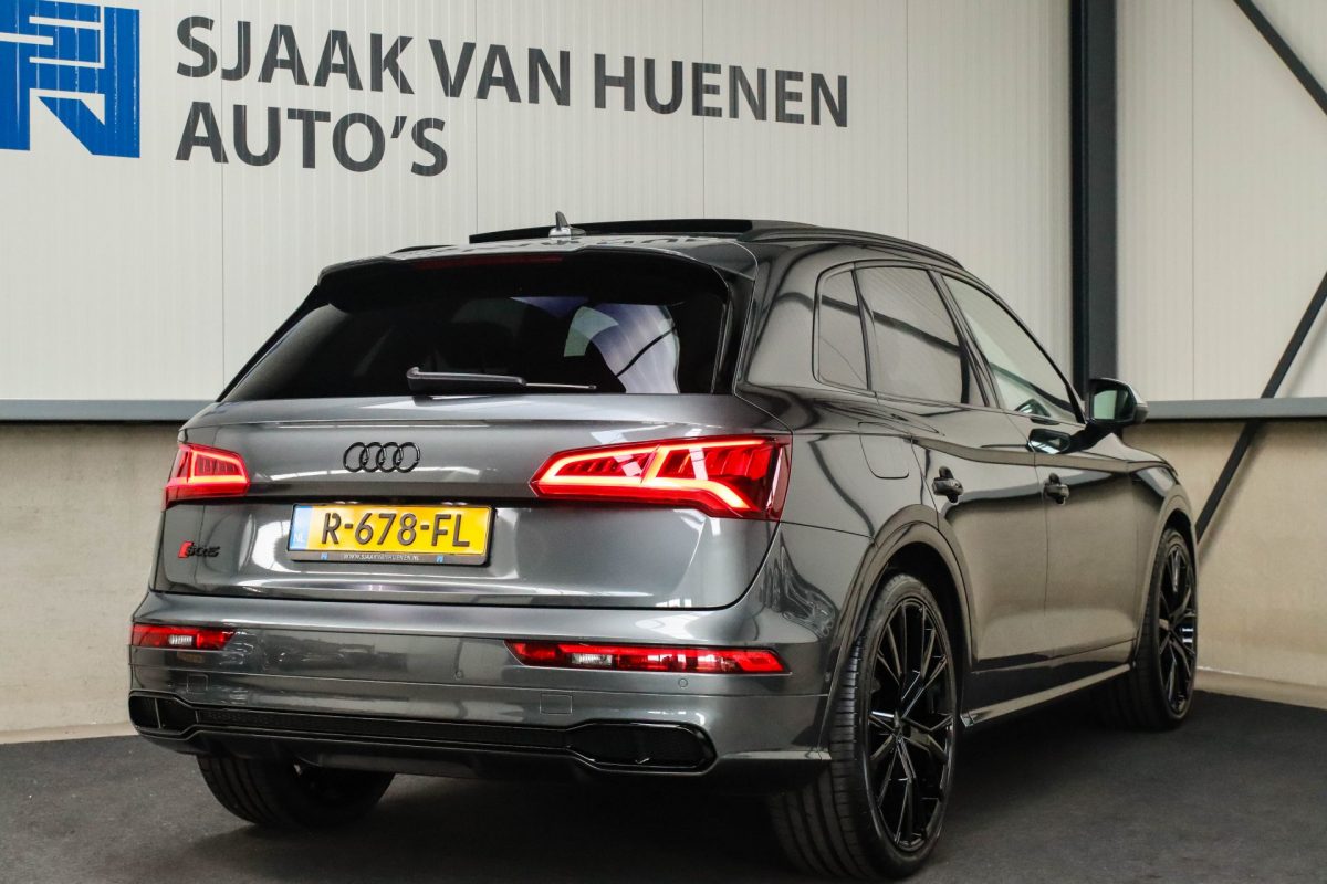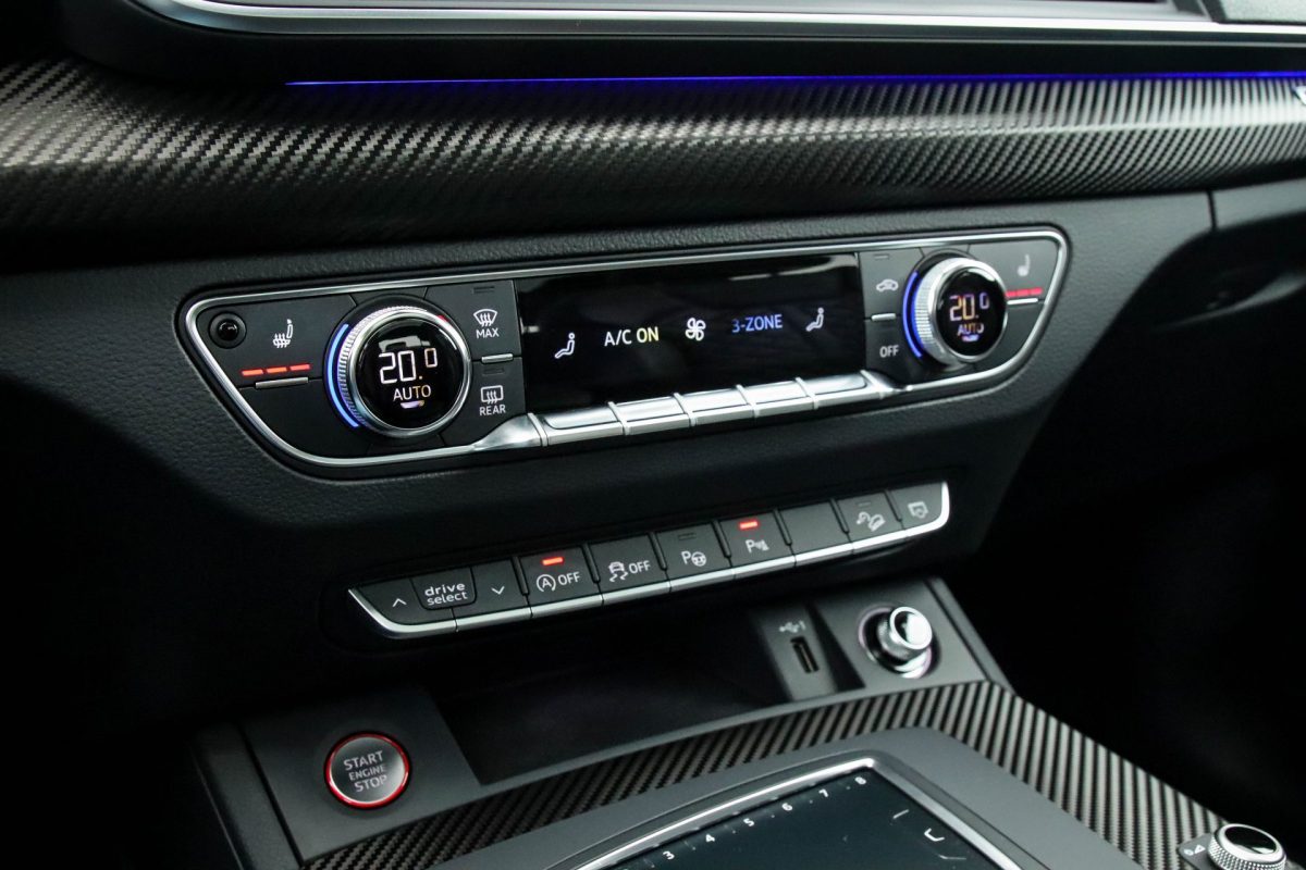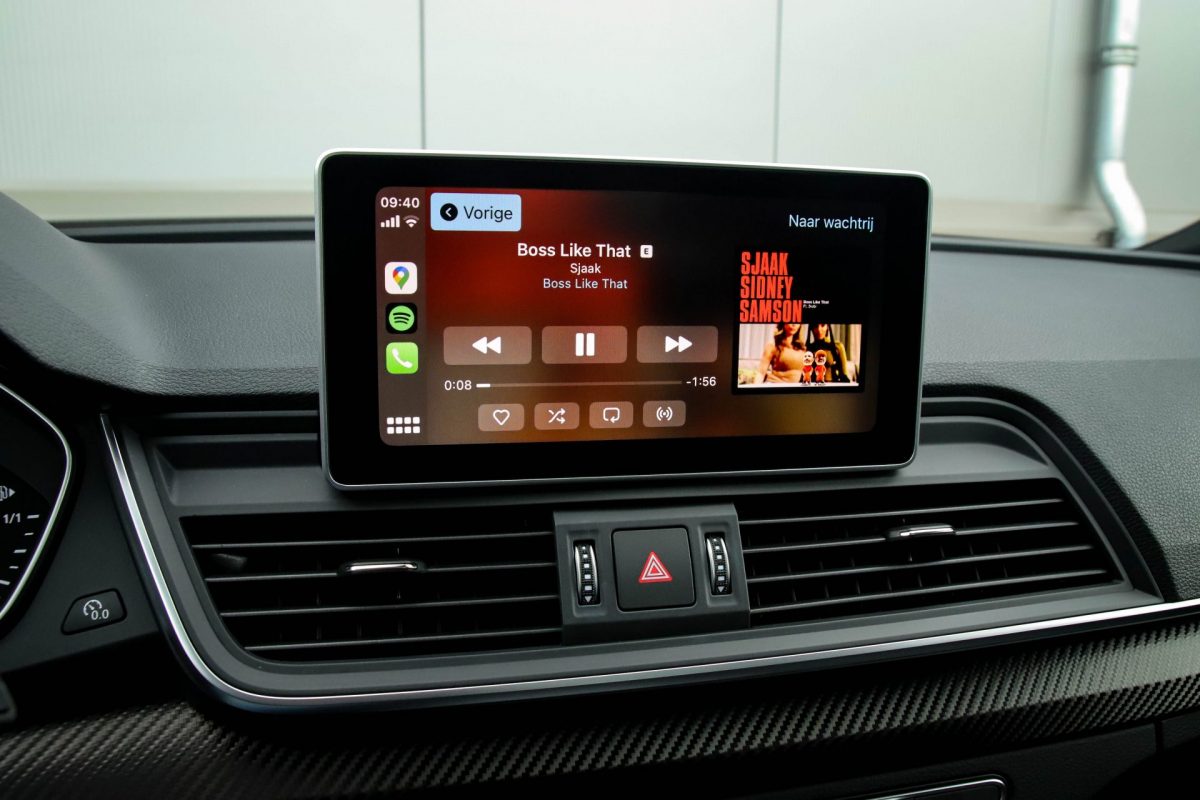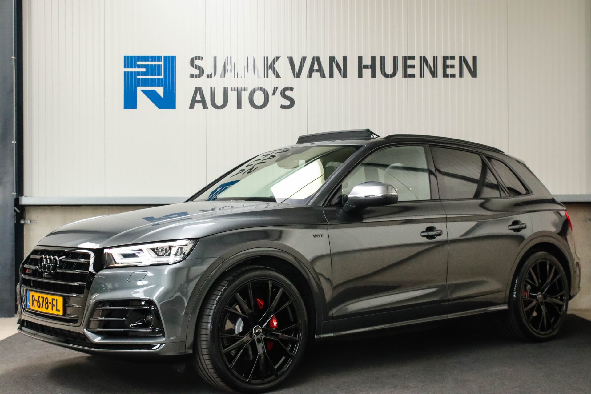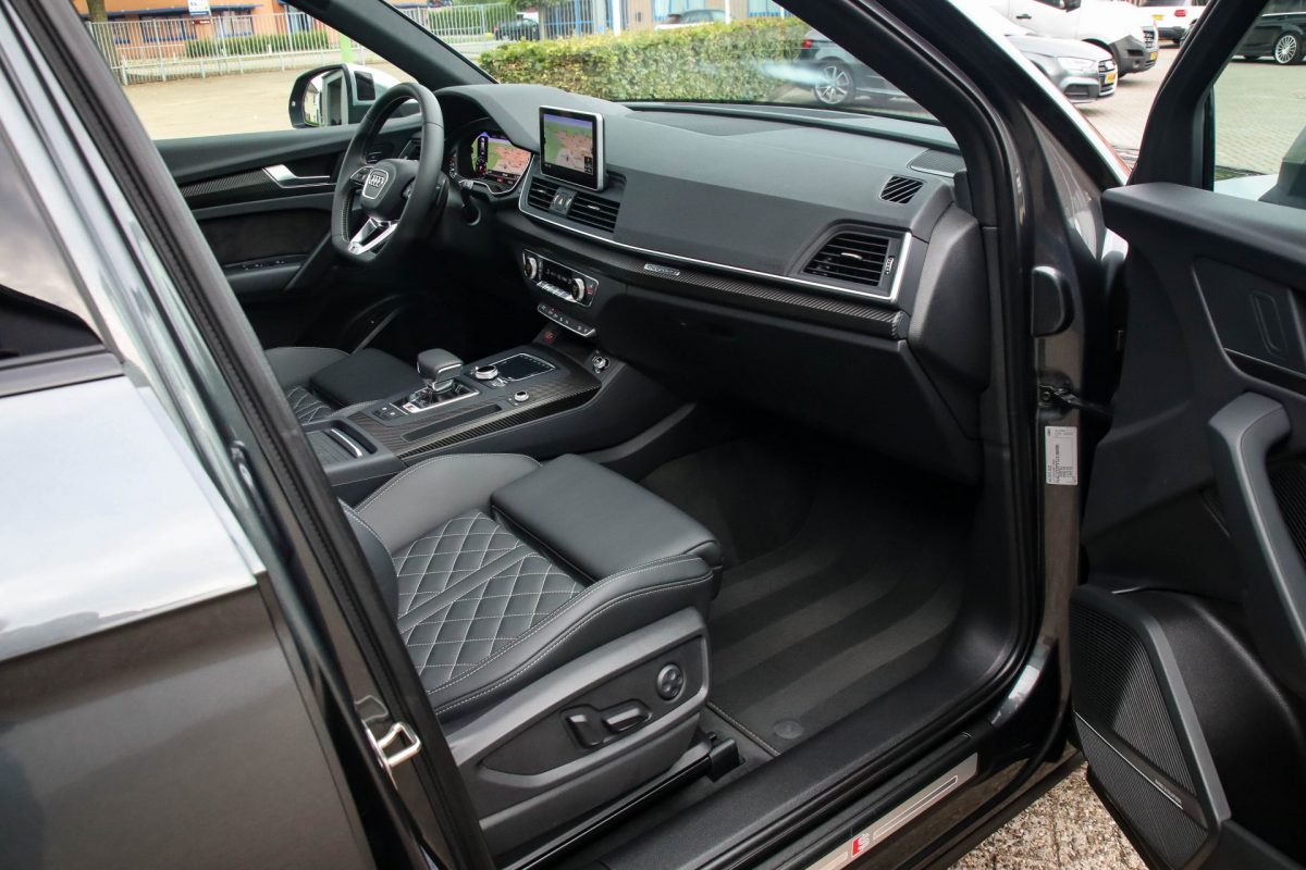 NIEUW MODEL | MODEL 2018! Een werkelijk in uitmuntende staat verkerende Audi SQ5 SUV 3.0 TFSI QUATTRO 260kw/354pk 6-cilinder automaat! Afkomstig van de 1e eigenaar, volledig Audi dealer onderhouden inclusief bijbehorende documentatie. Uiteraard met een transparante en schadevrije historie en een gecontroleerde tellerstand van slechts 51.445 kilometer. Een prachtig sportieve SUV die is voorzien van de krachtige en fantastisch klinkende 3.0 v6 benzine turbomotor die maarliefst 354pk en 500Nm levert. De prestaties liegen er ook niet om, er is slechts 5,4 seconden nodig om vanuit stilstand de 100 km/h te bereiken, waarbij de acceleratie pas stopt bij 250 km/h! Deze SQ5 heeft de juiste uitstraling, mede door zijn geweldige Daytona Grey parellak, het zwart optiekpakket en natuurlijk zijn uiterst royale fabrieksoptielijst. De nieuwprijs van bijna €120.000,- geeft goed aan om welk uitrustingsniveau het gaat. De getoonde 22inch Black Performance velgenset met 4x Hankook Ventus S1 EVO3 SUV zomerbanden is tegen geringe meerprijs van €2595,- te verkrijgen.