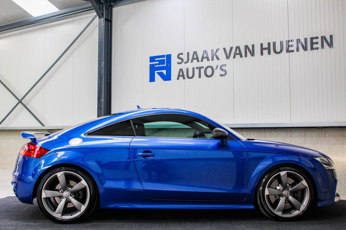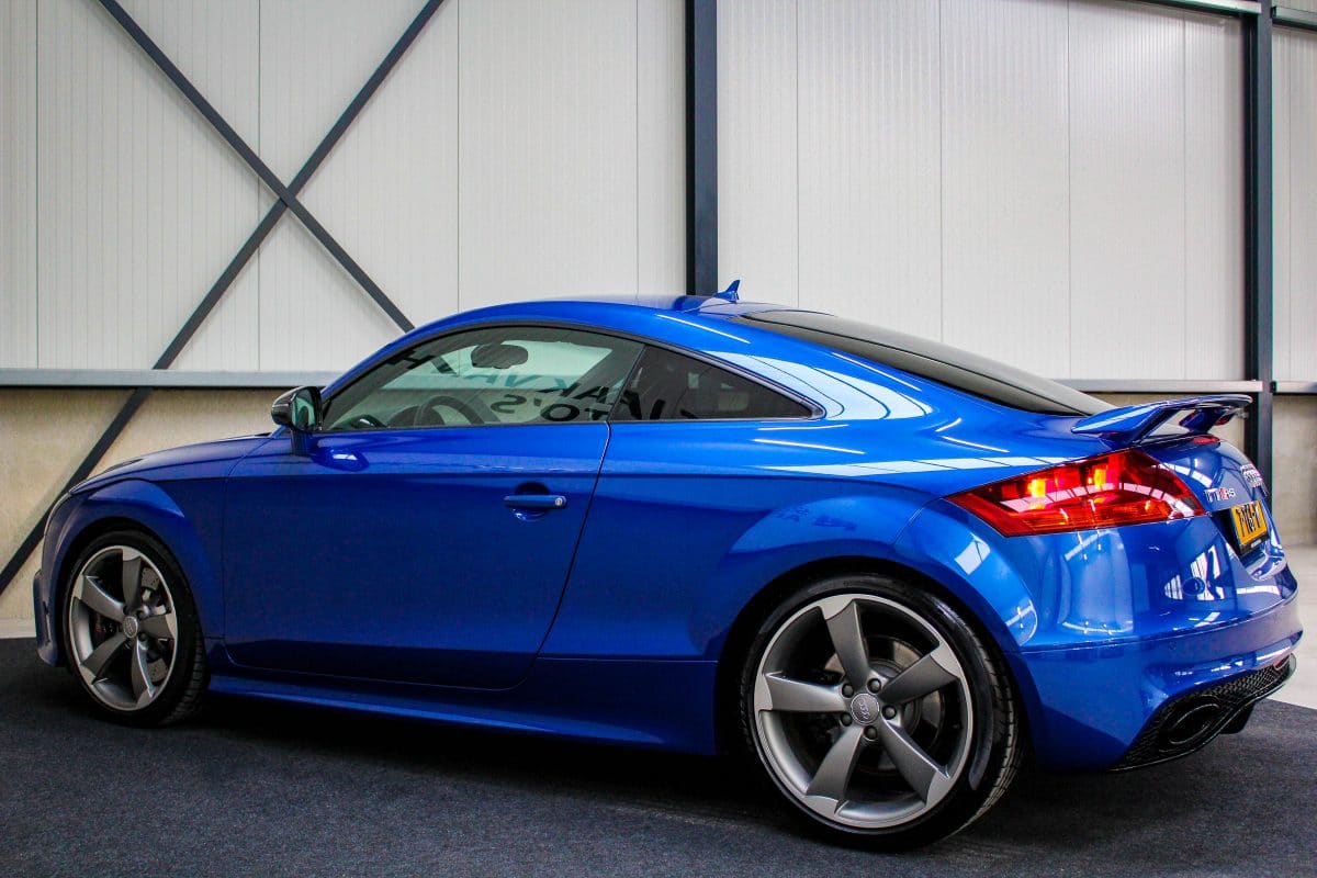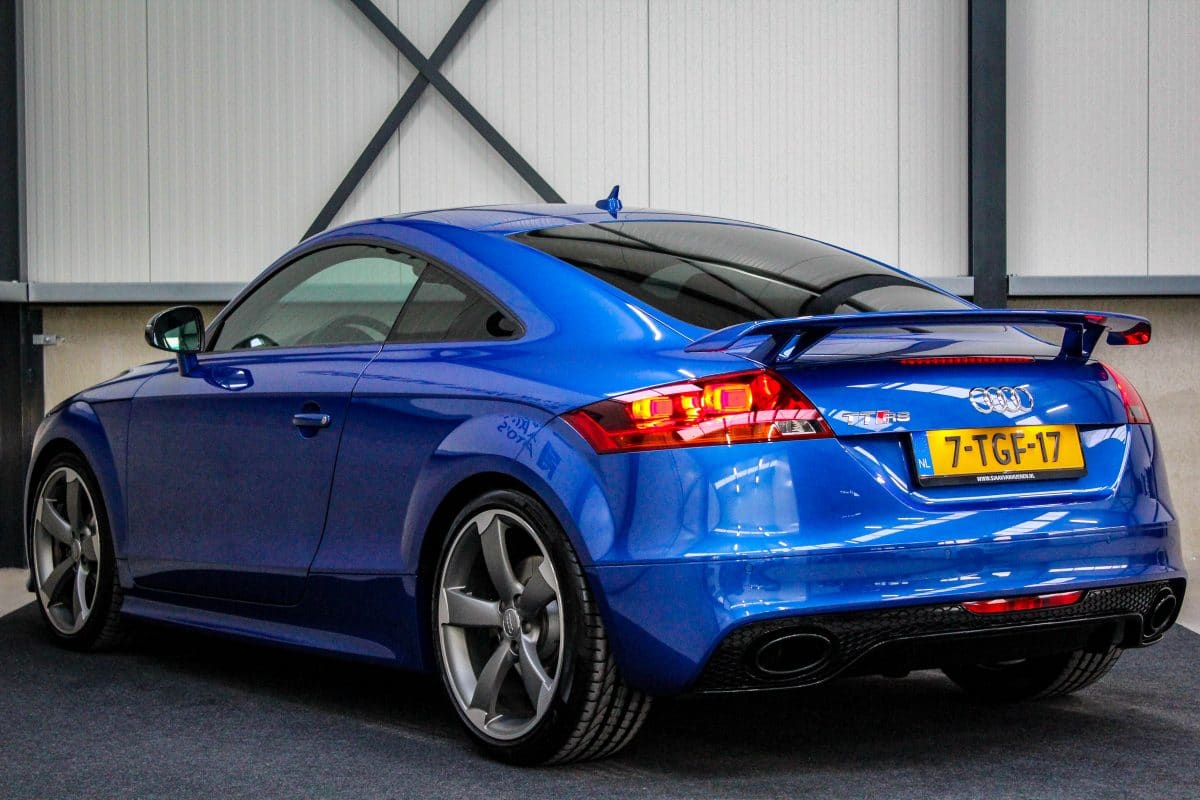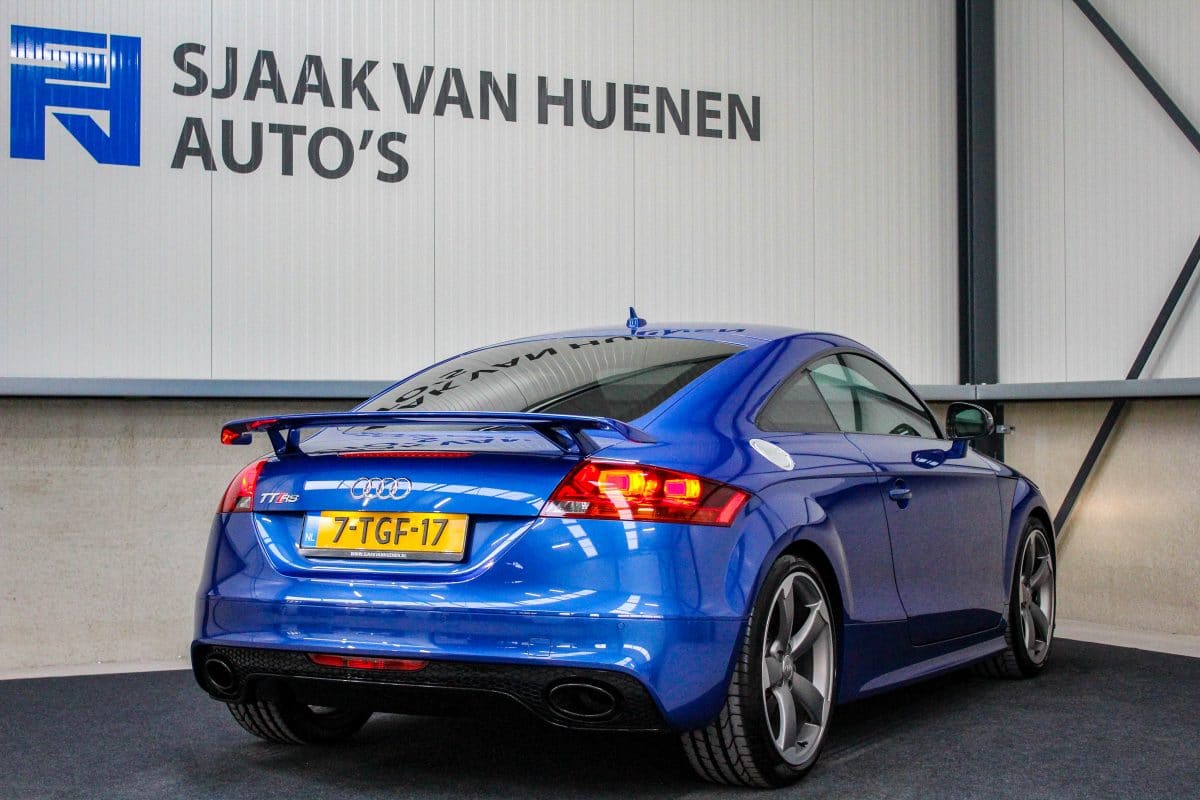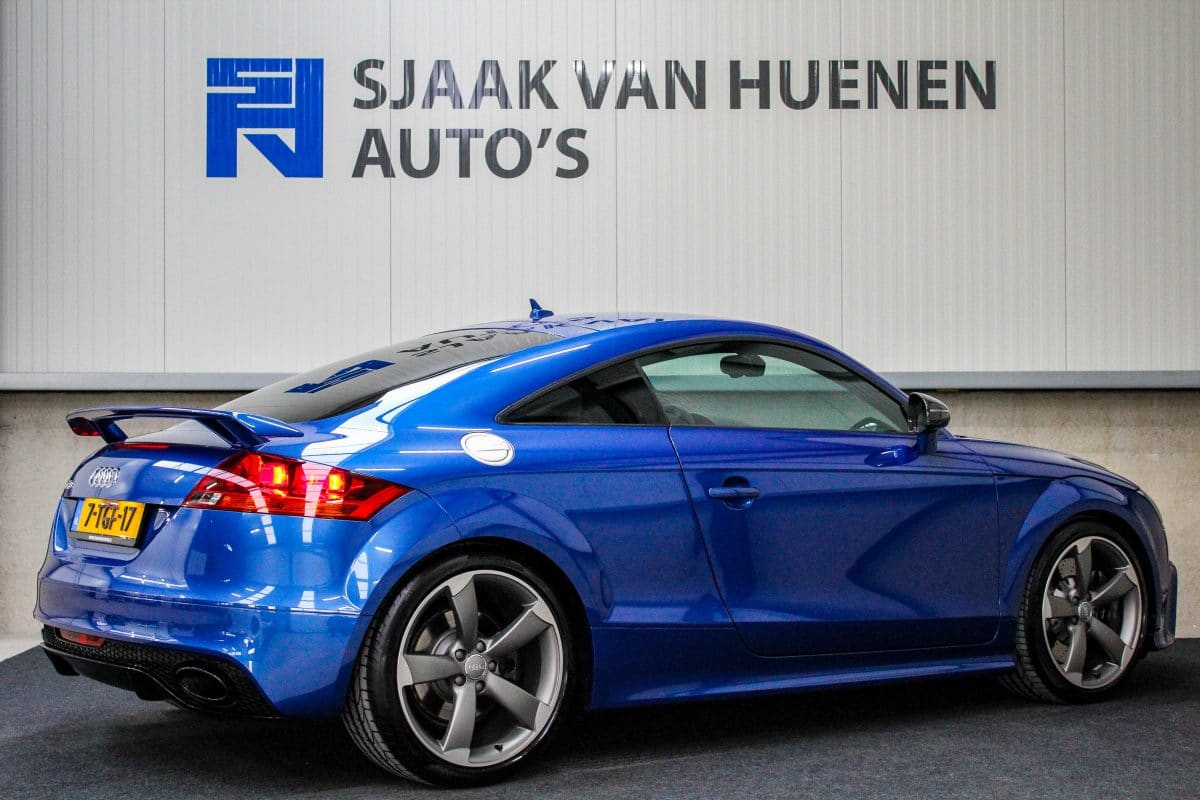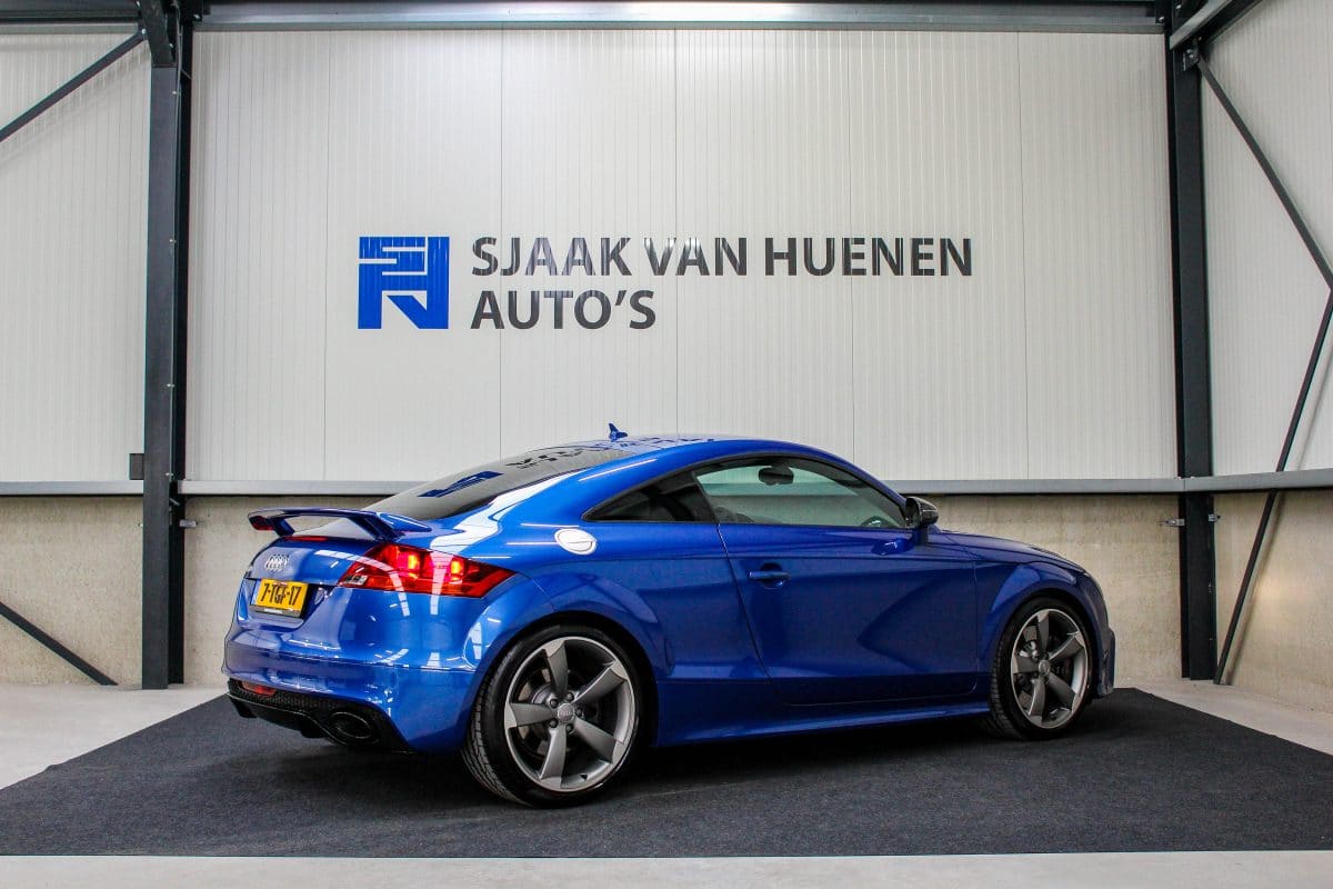In nieuwstaat verkerende, origineel Nederlands geleverde Audi TT RS Plus 2.5TFSI 265kw/360pk S-Tronic automaat Quattro! Een fantastische sportcoupe in de prachtige Sepang Blauwe parellak, 19inch Rotor TTRS velgen en originele carbon spiegelkappen.